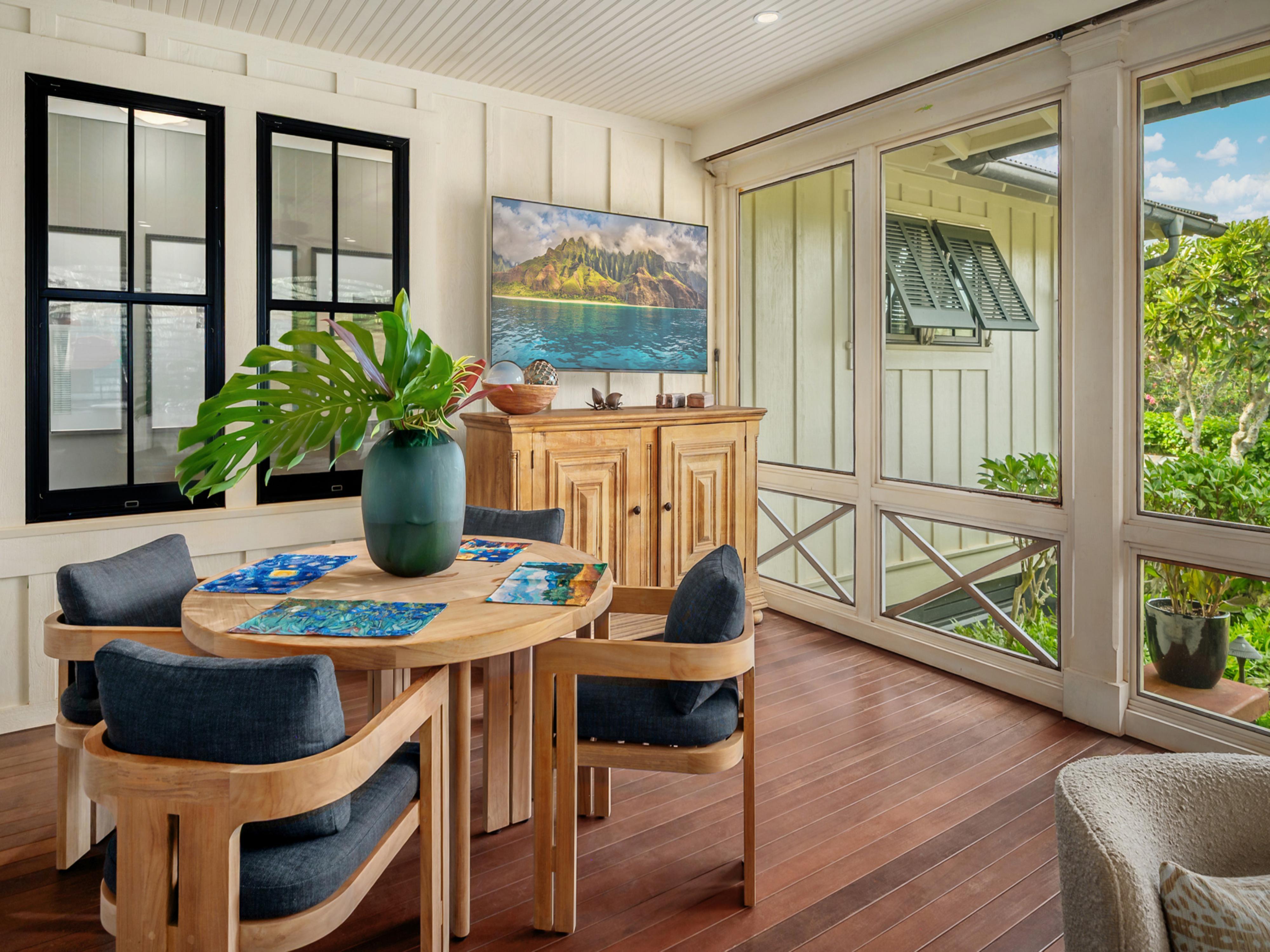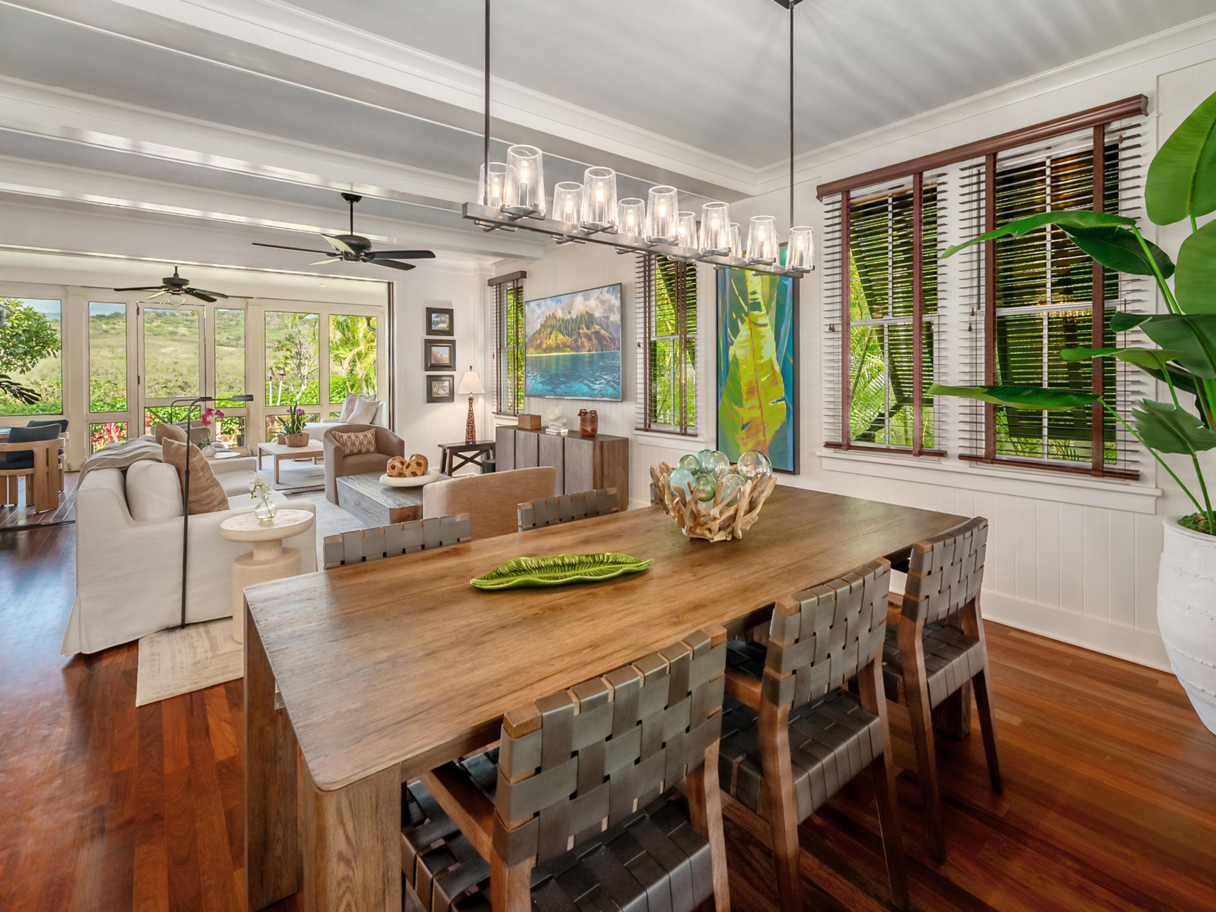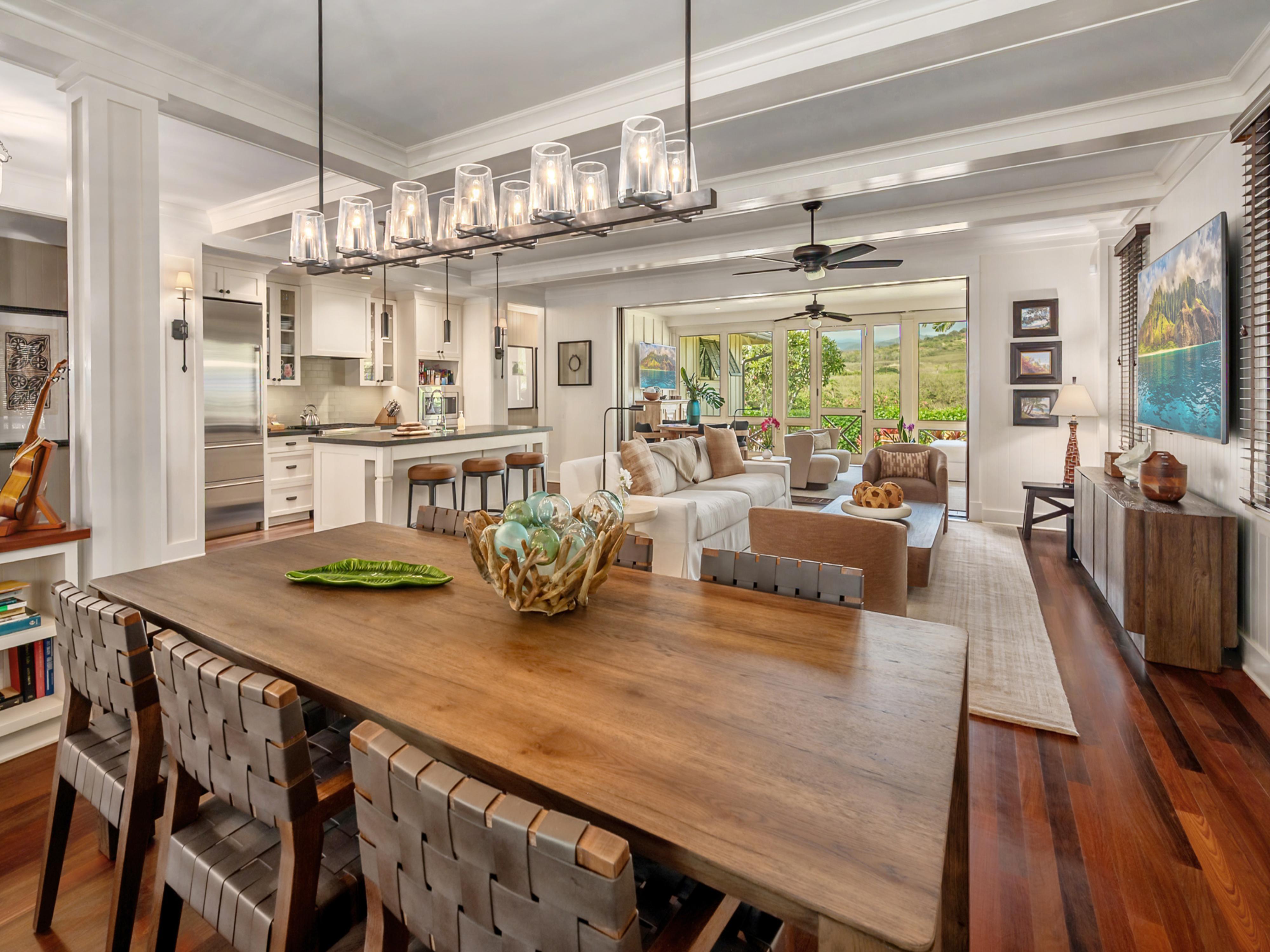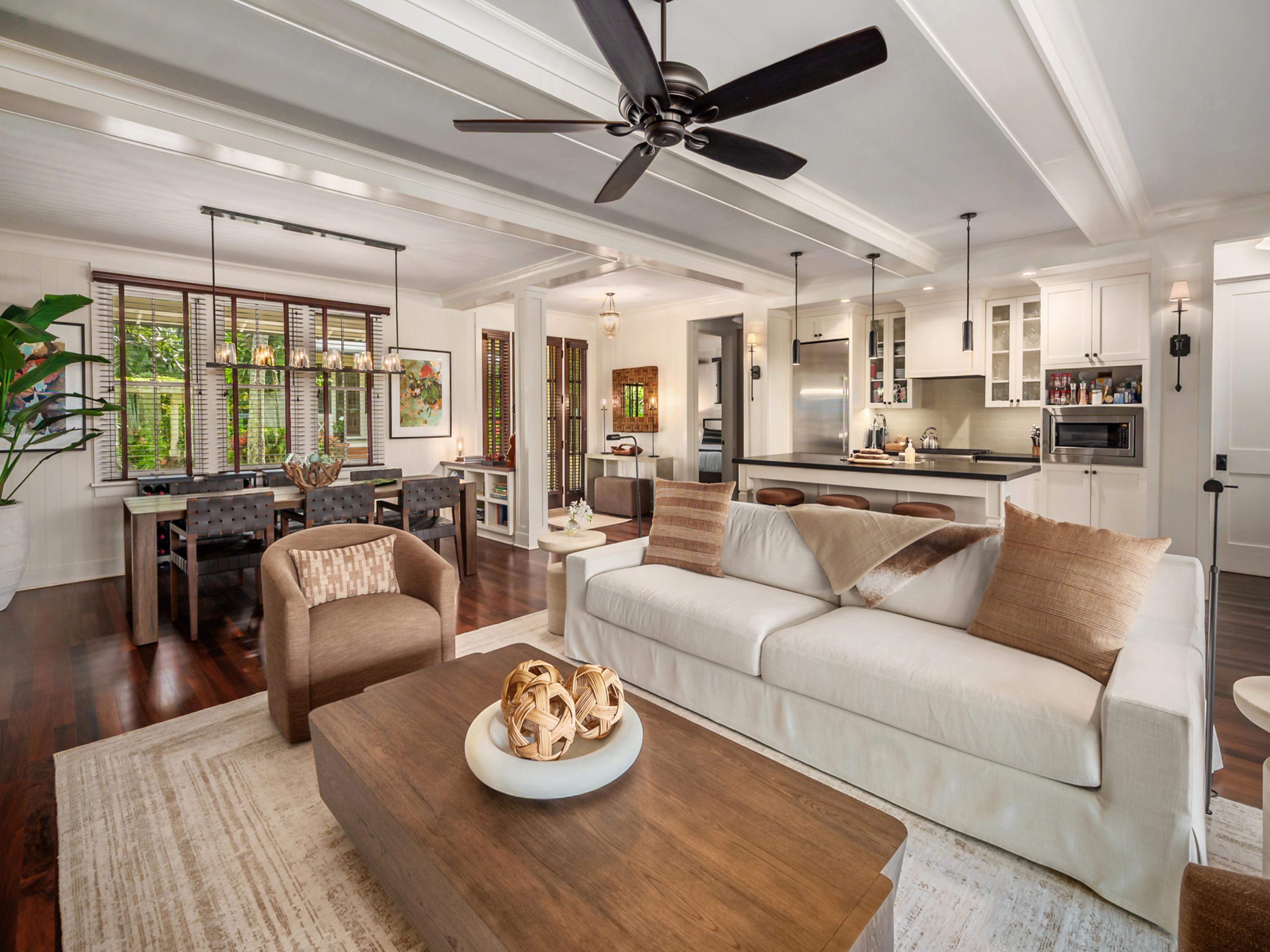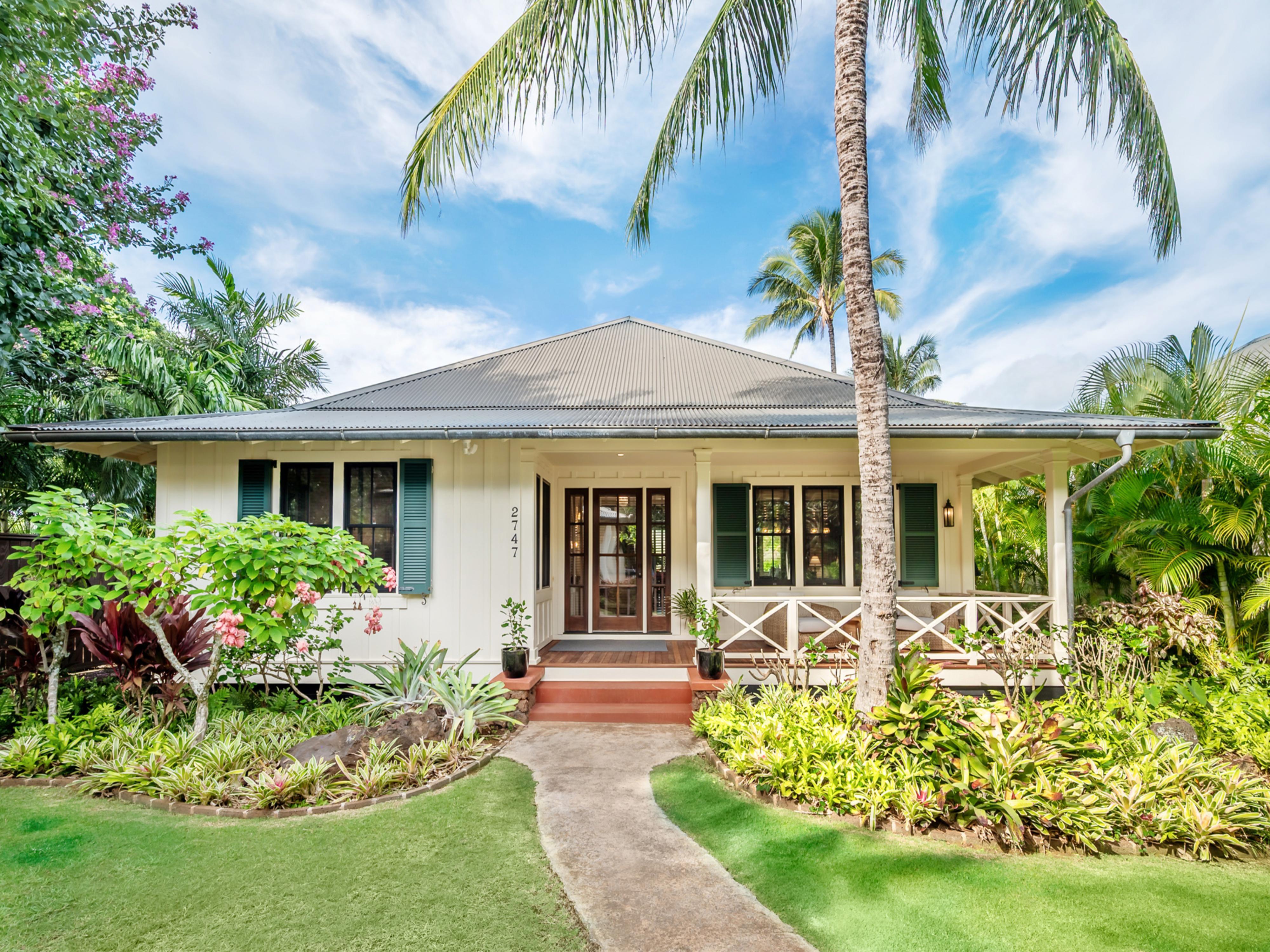 This stunning three-bedroom home on Kaua'i features a main house with two primary bedrooms and a standalone one-bedroom 'ohana. Situated next to the Spa at The Club at Kukui'ula, Cottage 1 has a prime location for guests looking to experience all that The Club has to offer. The open floor plan places the kitchen at the heart of the home with comfortable indoor and outdoor living spaces and dining areas. In the private backyard, a firepit with four chairs and a grilling area await.