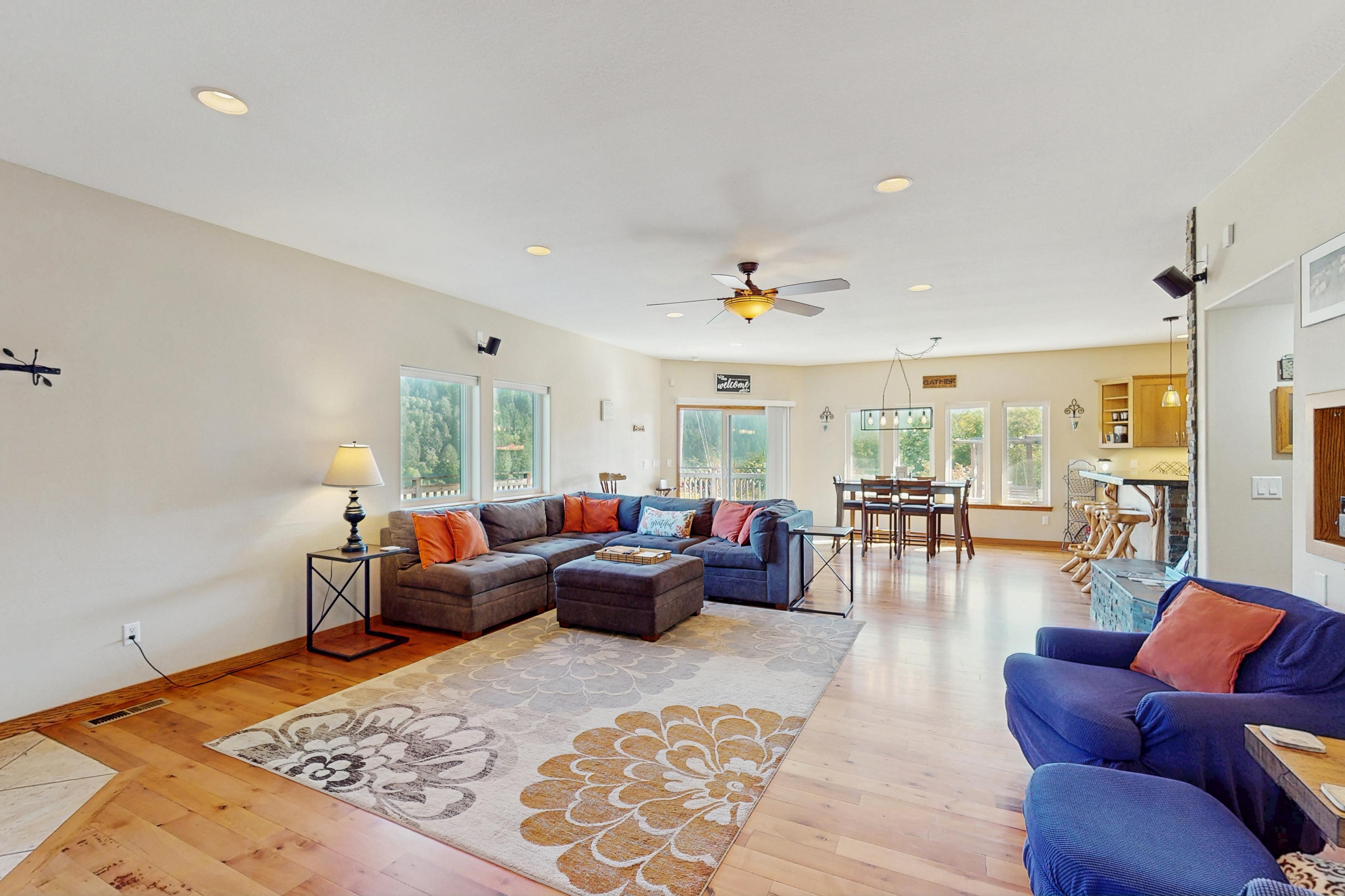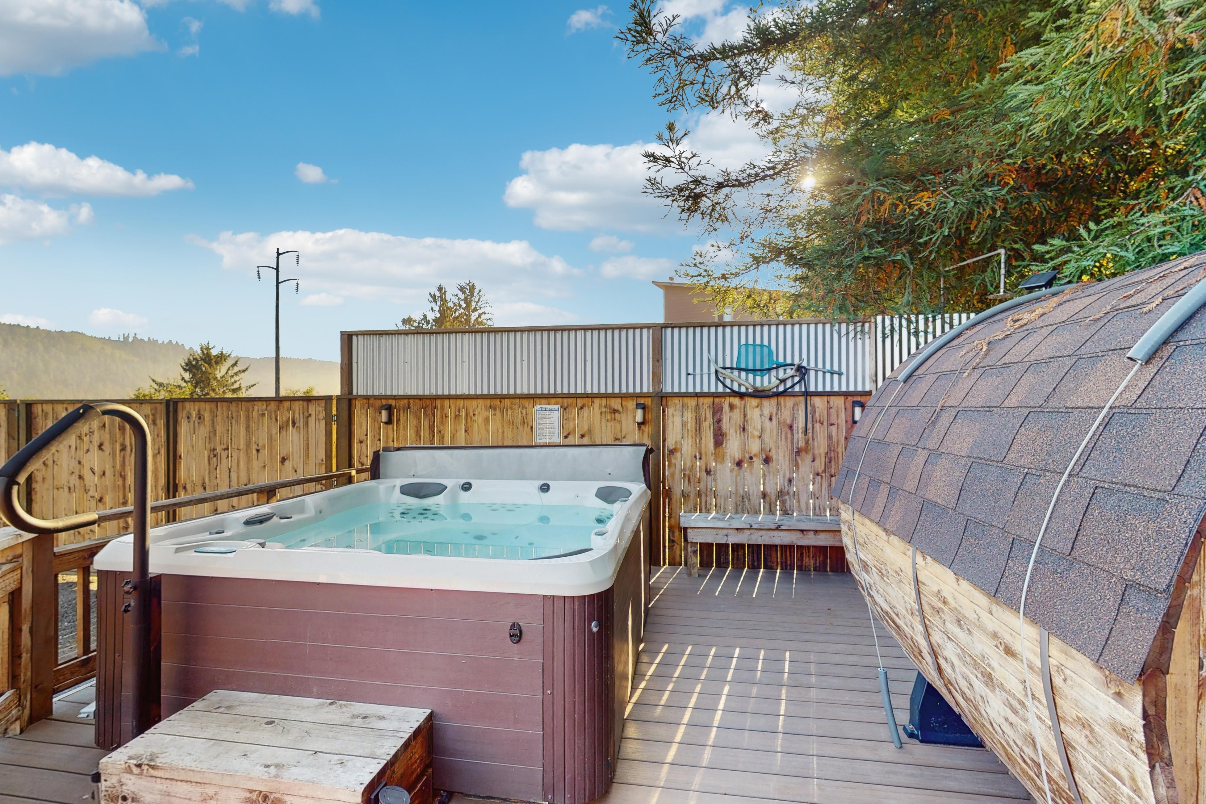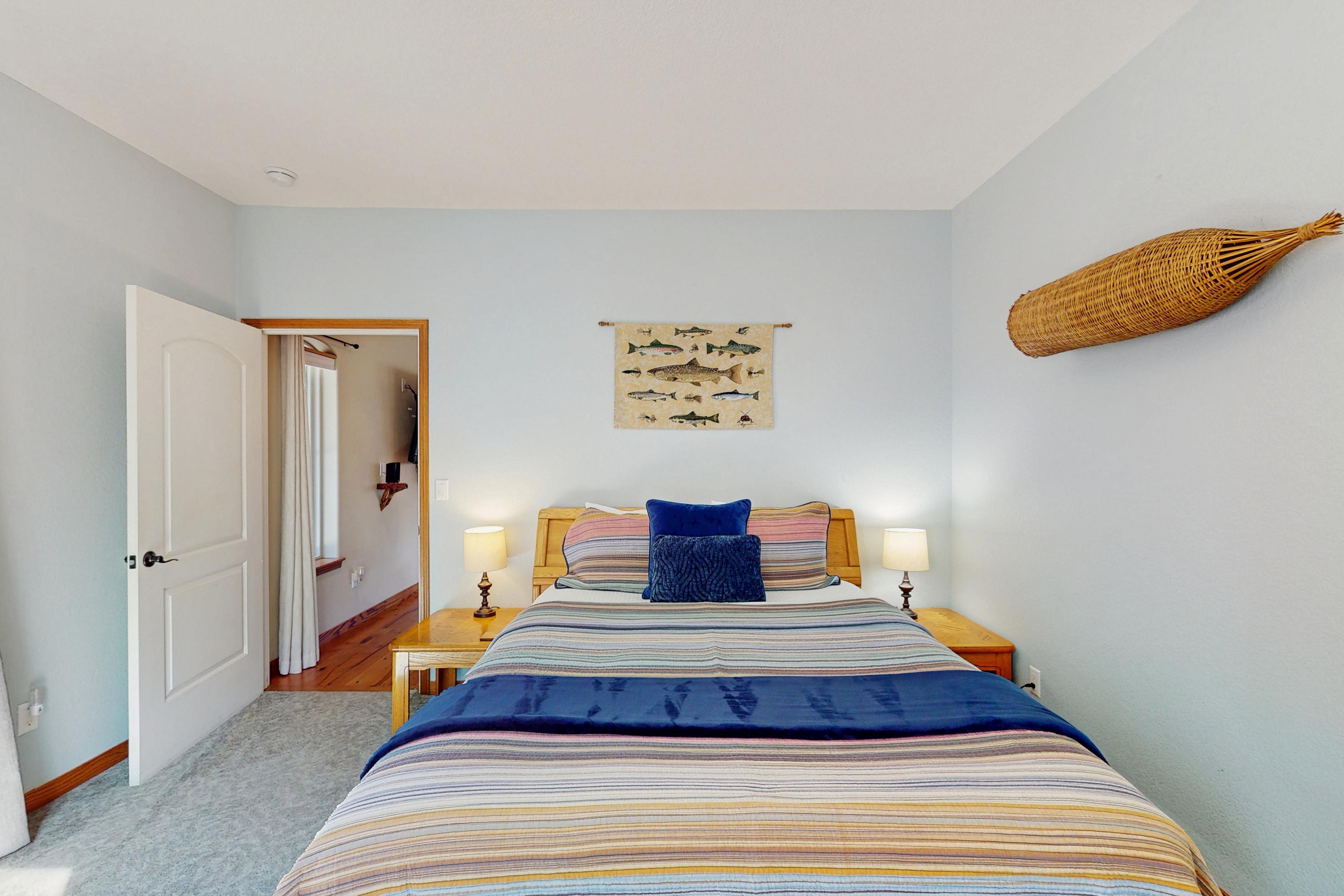 As the sun illuminates the valley each evening, you can bring a bottle of wine out the wrap-around deck, sear steaks on the gas grill, and dine at the picnic table in the shade of the umbrella. There's also a firepit encircled by log stools if you're looking to roast s'mores for dessert. Back inside, you'll find one bedroom on the main floor and two bedrooms - including an expansive primary suite - upstairs. Additional amenities include a private laundry room and free WiFi.