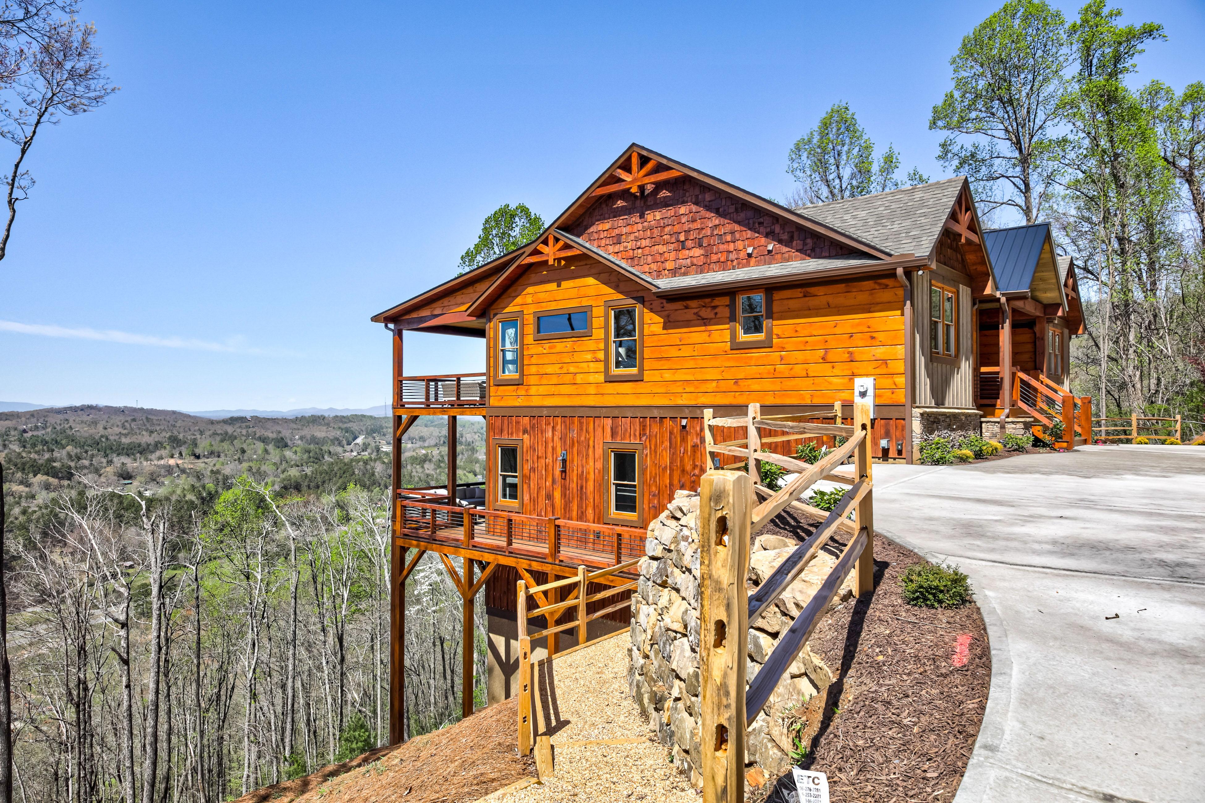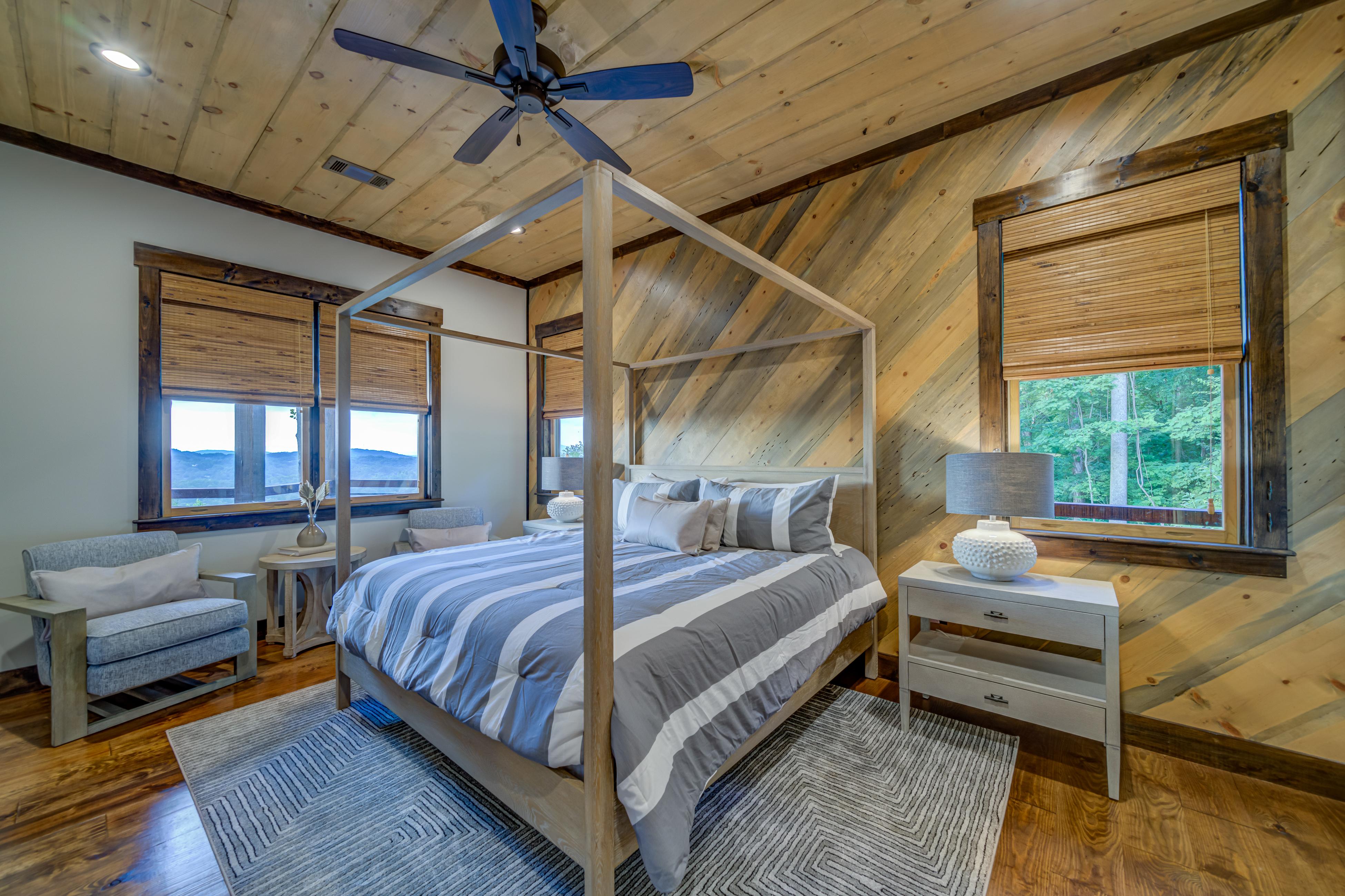 This newly constructed home features 180 degrees of one of the best long-range, year-round, multi-layered mountain views in this area and is less than 10 miles from downtown Blue Ridge, making it the perfect vacation destination. High-end finishes and light fixtures, stainless appliances, and beautiful granite counters add class and sophistication to this woodsy retreat. Lounge in the living room and keep warm by the fireplace. Cook together in the spacious kitchen. Eat at the bar or in the dining nook and enjoy the views from the window. Don’t spend all your time indoors. The deck, which includes a dining table, grill, and other furniture, is the perfect place to gather. The primary bedroom on this level includes access to the deck and an ensuite bathroom with a shower and freestanding tub.
