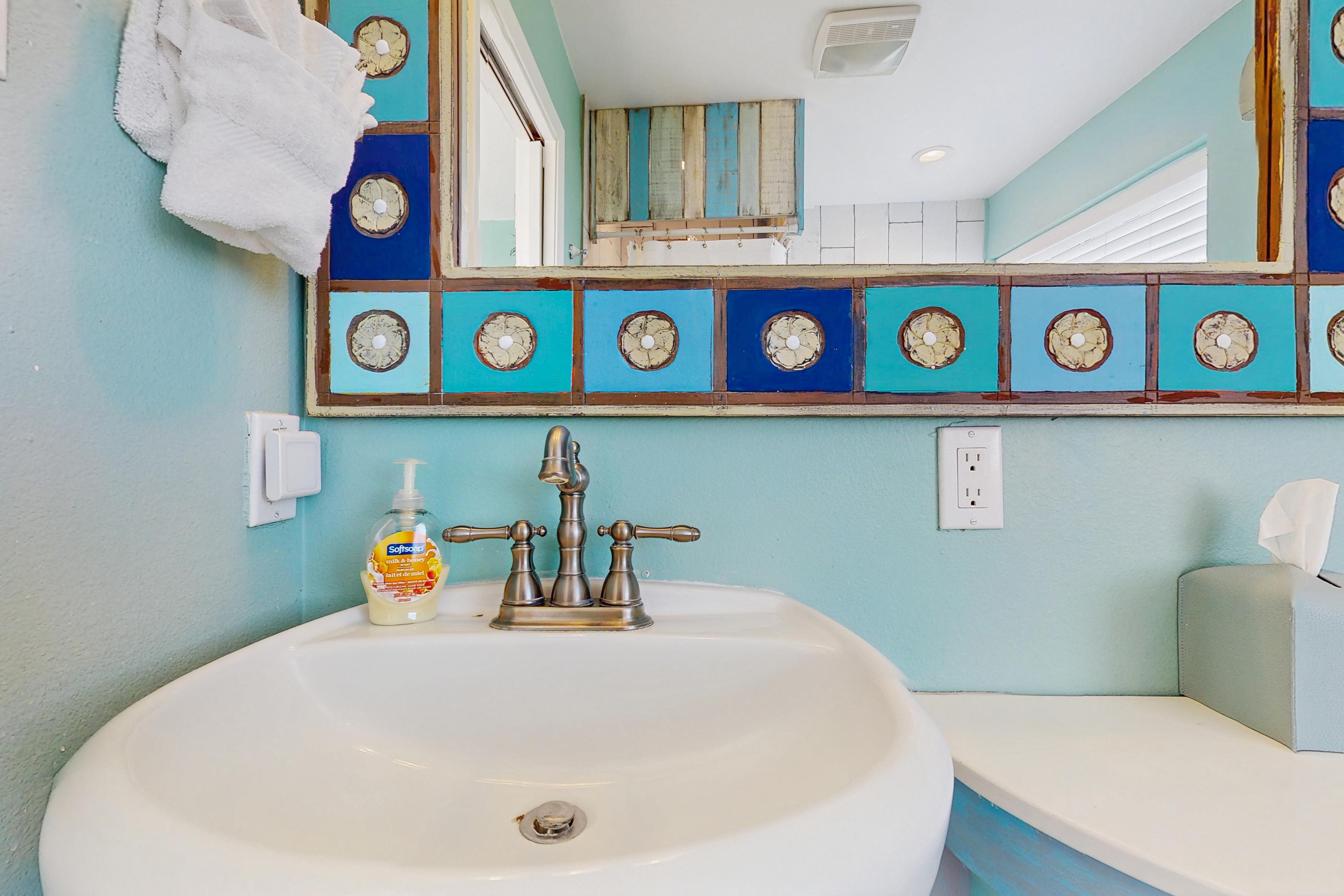 On the first floor of this quaint home, you will find a cozy family room with a flatscreen Smart TV with cable and streaming services with direct access to a beachfront deck, two comfortable bedrooms with ceiling fans, a full bathroom with a standalone shower, and a stackable washer/dryer for your laundry needs. Upstairs, on the second floor, is the main living area that opens up to another beachfront deck furnished with an outdoor dining area and a nice seating area overlooking the sand and sparkling waters. Inside, the living room boasts gorgeous coastal-themed decor with a set of comfortable sofas surrounding a Samsung Smart TV with cable. The kitchen has been appointed with all the essentials and major appliances needed. You can whip up from full-course meals to delicious snacks on the go. Let the dishwasher take care of cleaning everything up before heading out to the beach. This level hosts a bedroom with a ceiling fan and an en suite bath with a standalone shower. On the third and upper level of this coastal retreat, you will find two more bedrooms, each with an en suite bathroom, and a third deck/balcony. The primary bedroom's bathroom has a separate tub and a standalone shower.