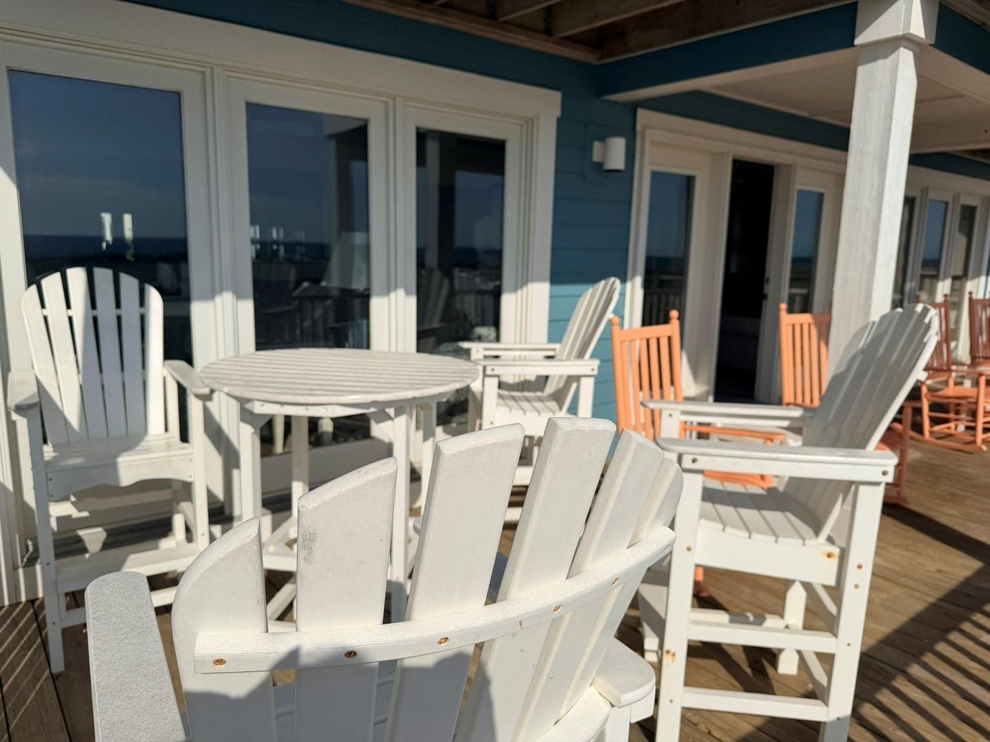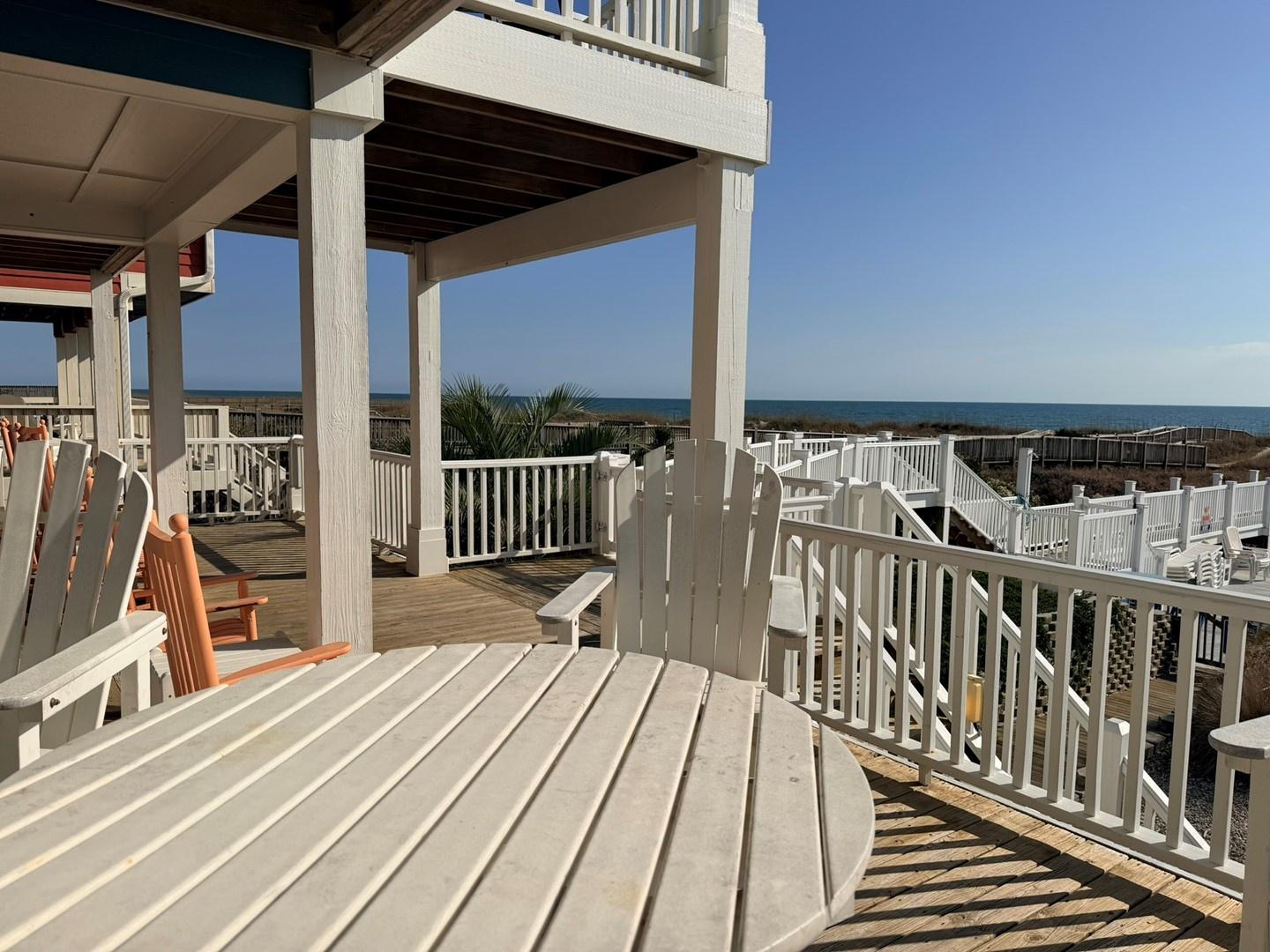 Outdoor amenities include oceanfront decks with rocking chairs, a large