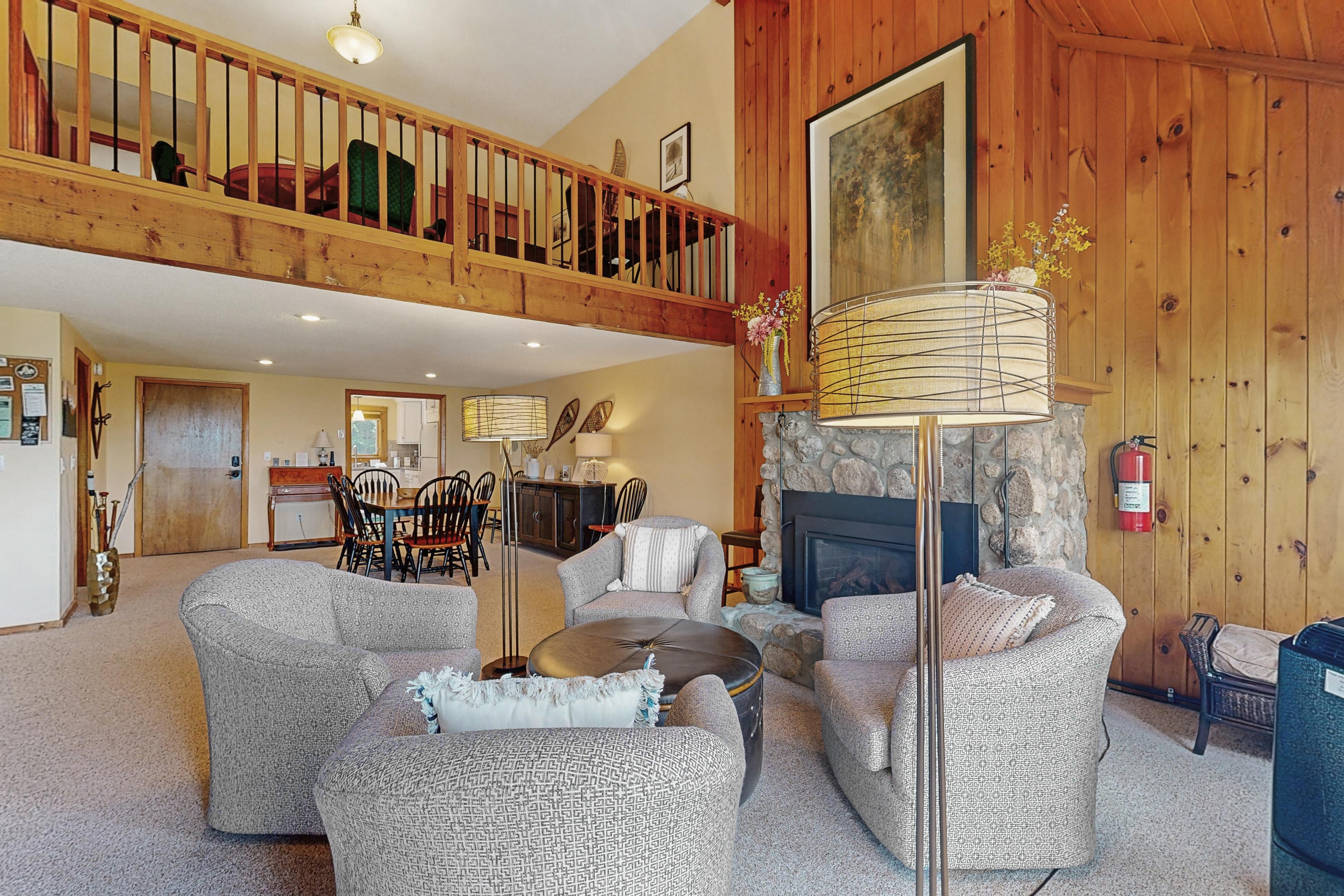 You can have it all at this fantastic, two-story condo offering infinite mountain views, rustic touches, and several resort amenities. Inside this warm, family-friendly home, you'll find a well-equipped, full kitchen, an adjacent dining area with a table for eight with a built-in leaf for meals or game nights, and a spectacular living area with walls of glowing knotty pine, a soaring ceiling, skylights, multiple seating options, and a flatscreen TV for streaming your favorite shows and movies. Climb the stairs and discover the fun-filled loft complete with a foosball table, game table, and a desk and chair for remote work and schooling. And outside, take the amazing view while you fire up your gas grill to spice up your menu.