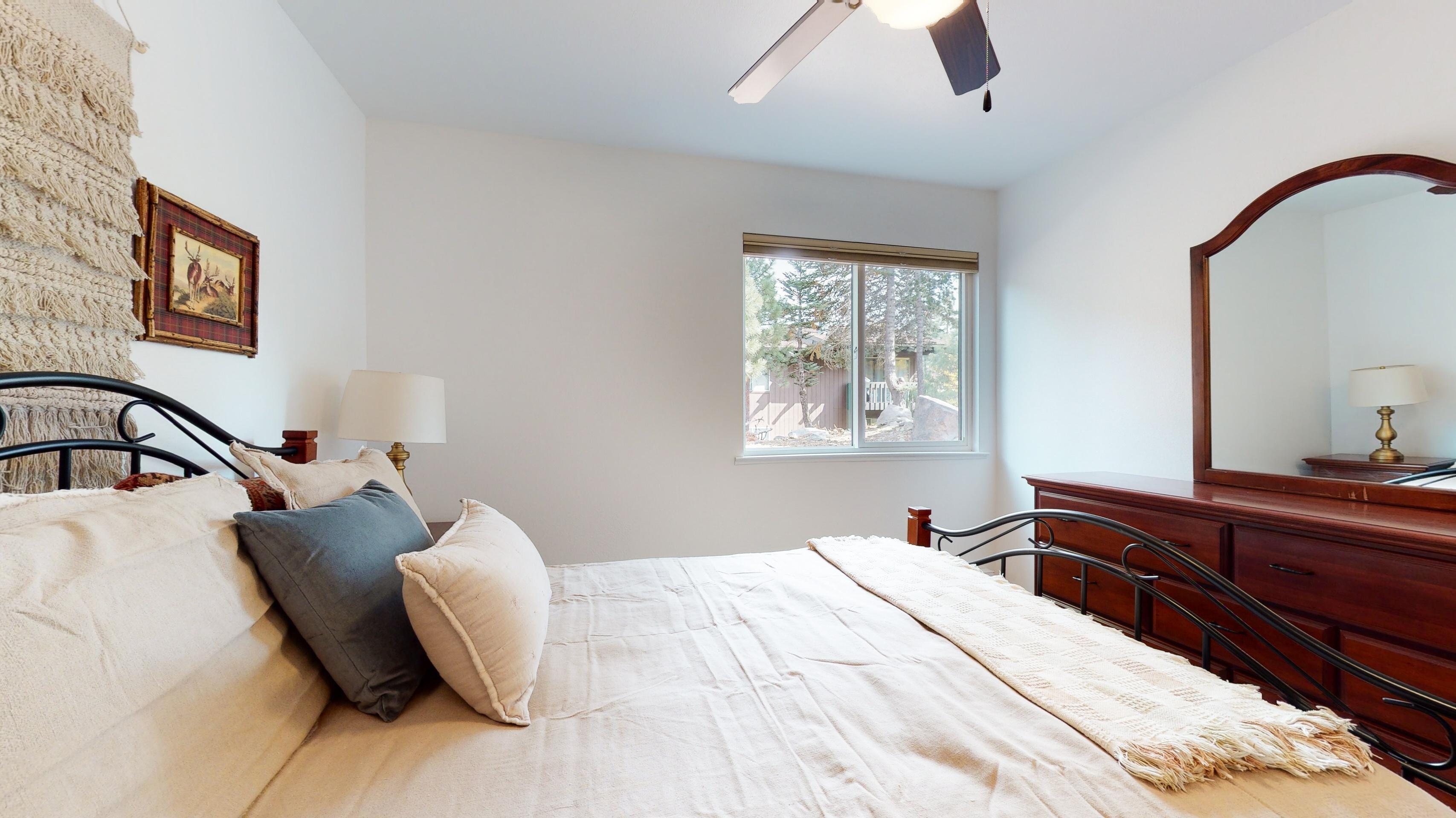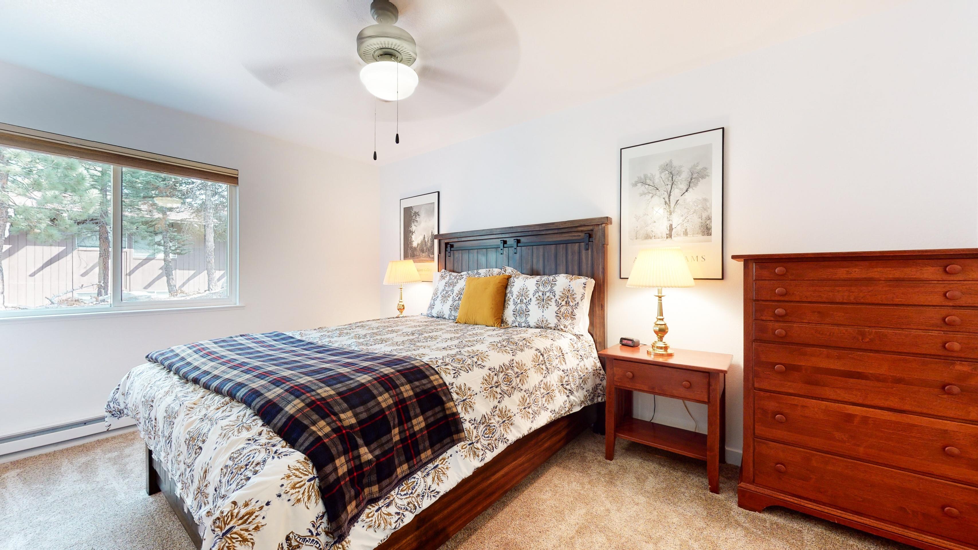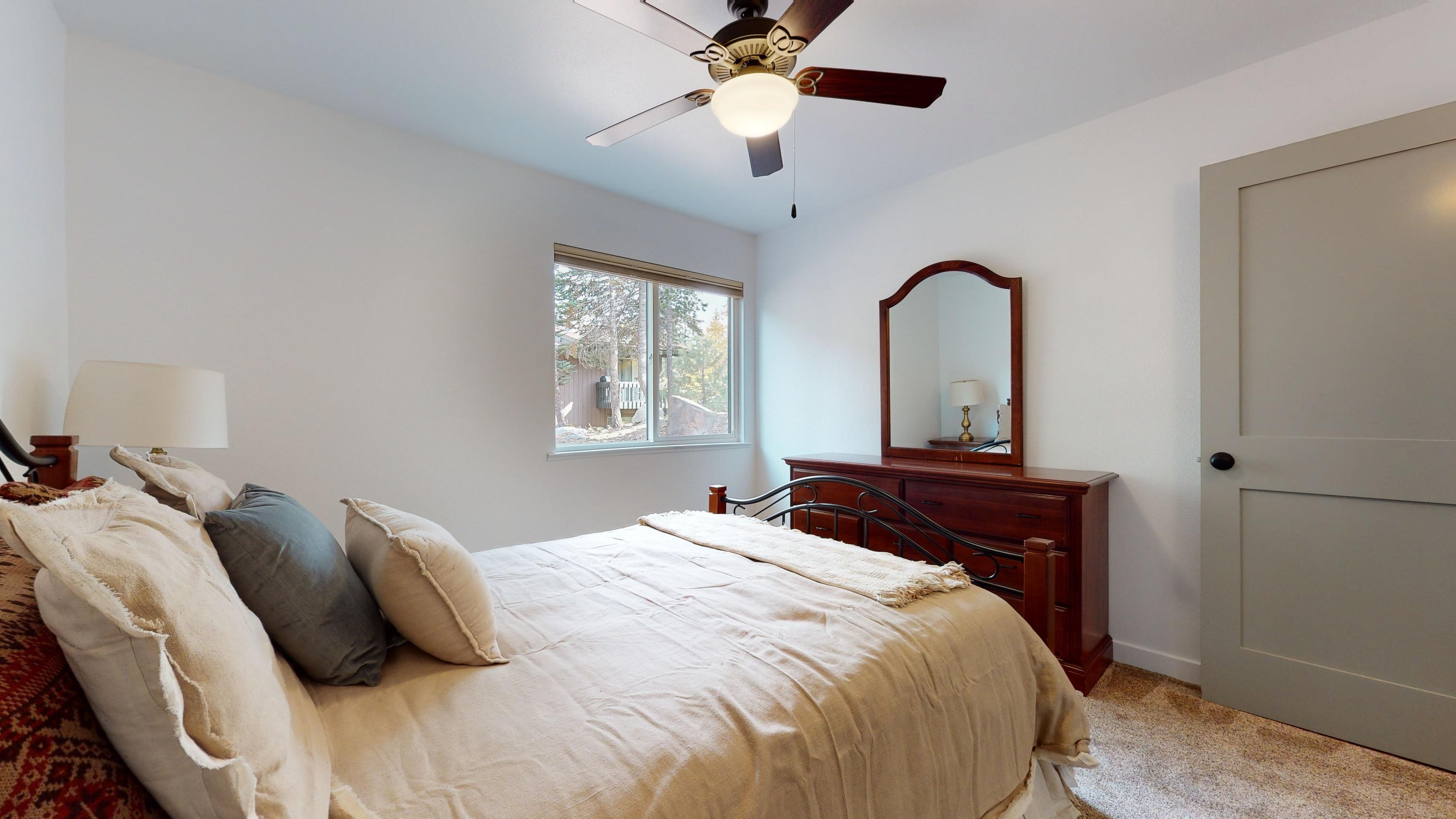 and large flat-screen TV. Upstairs, the first bedroom features a queen bed