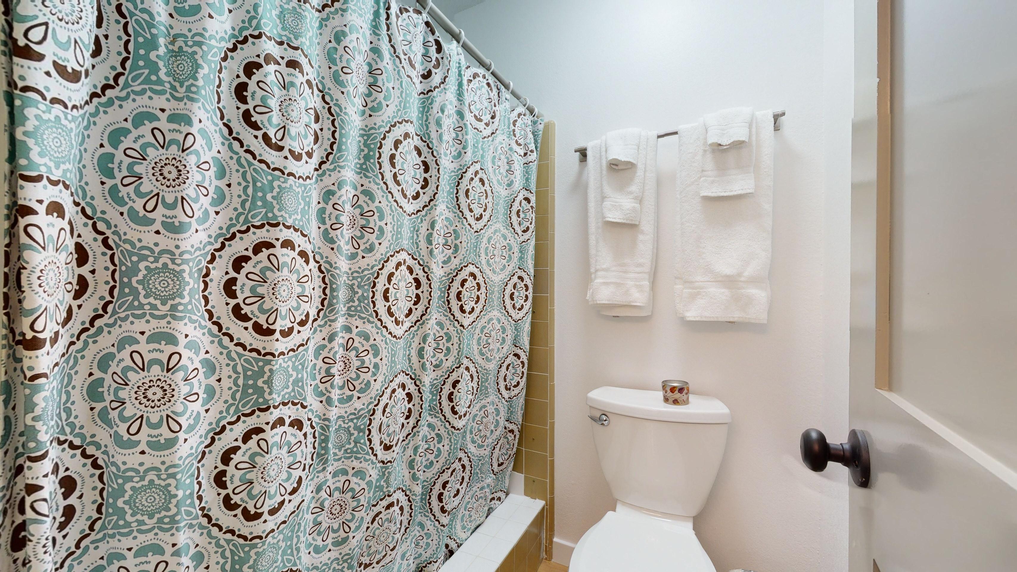 tub/shower combo. The second bedroom features a queen bed, while the third
