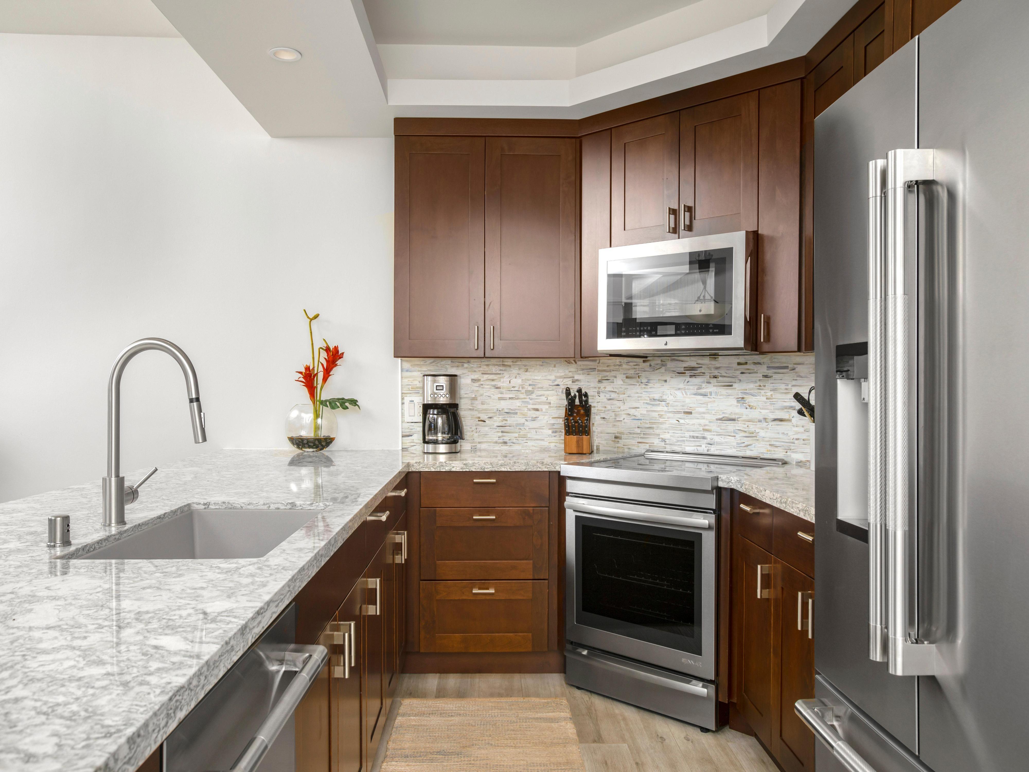 Fully equipped kitchen with modern appliances including a stove, oven, microwave, refrigerator, and dishwasher, alongside granite countertops
