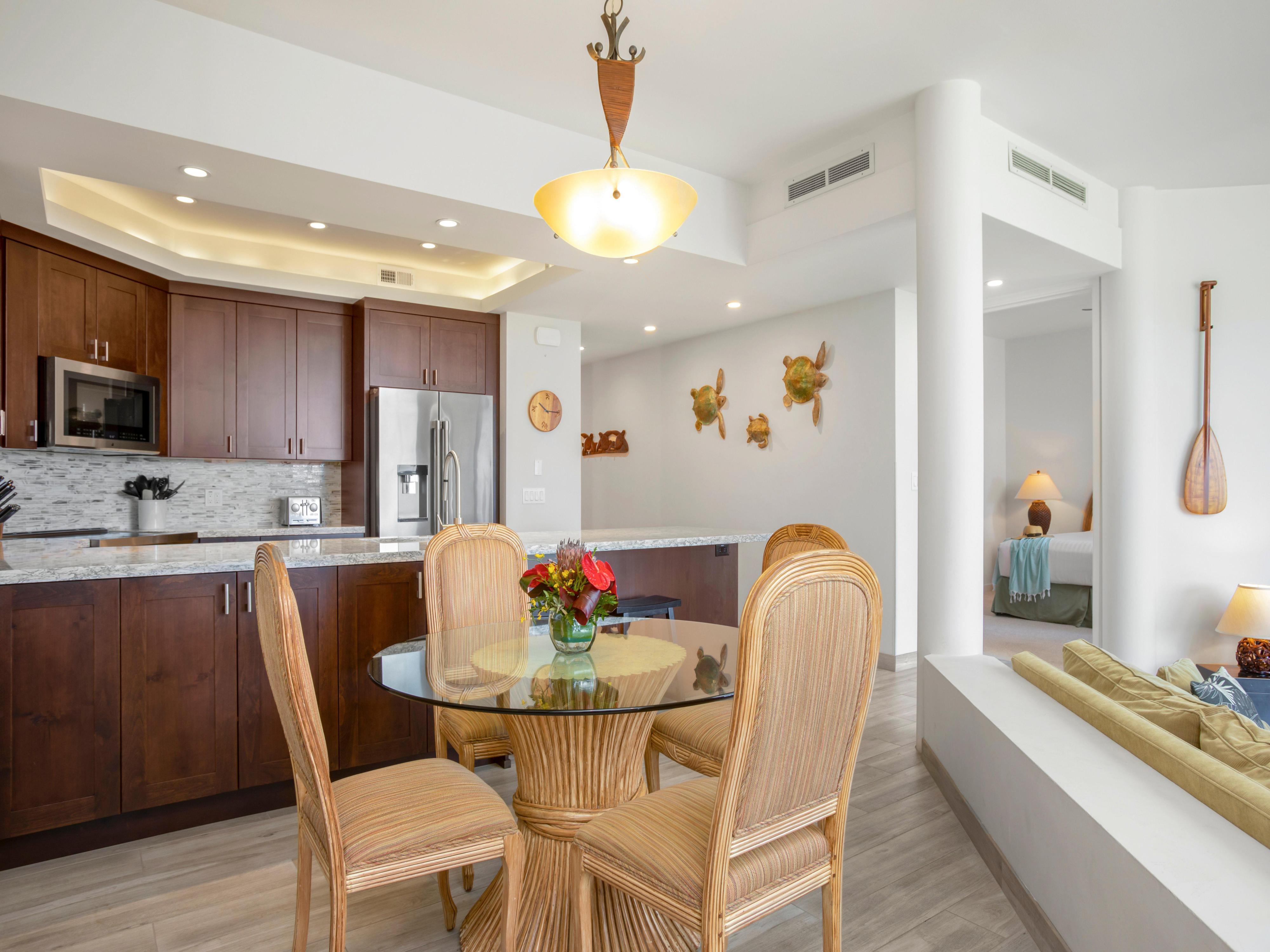 The spa-like bathroom serves as a relaxing oasis, boasting modern fixtures, a spacious vanity, and a luxurious walk-in shower. Indulge in a refreshing shower or unwind in the plunge tub after a day of island adventures.