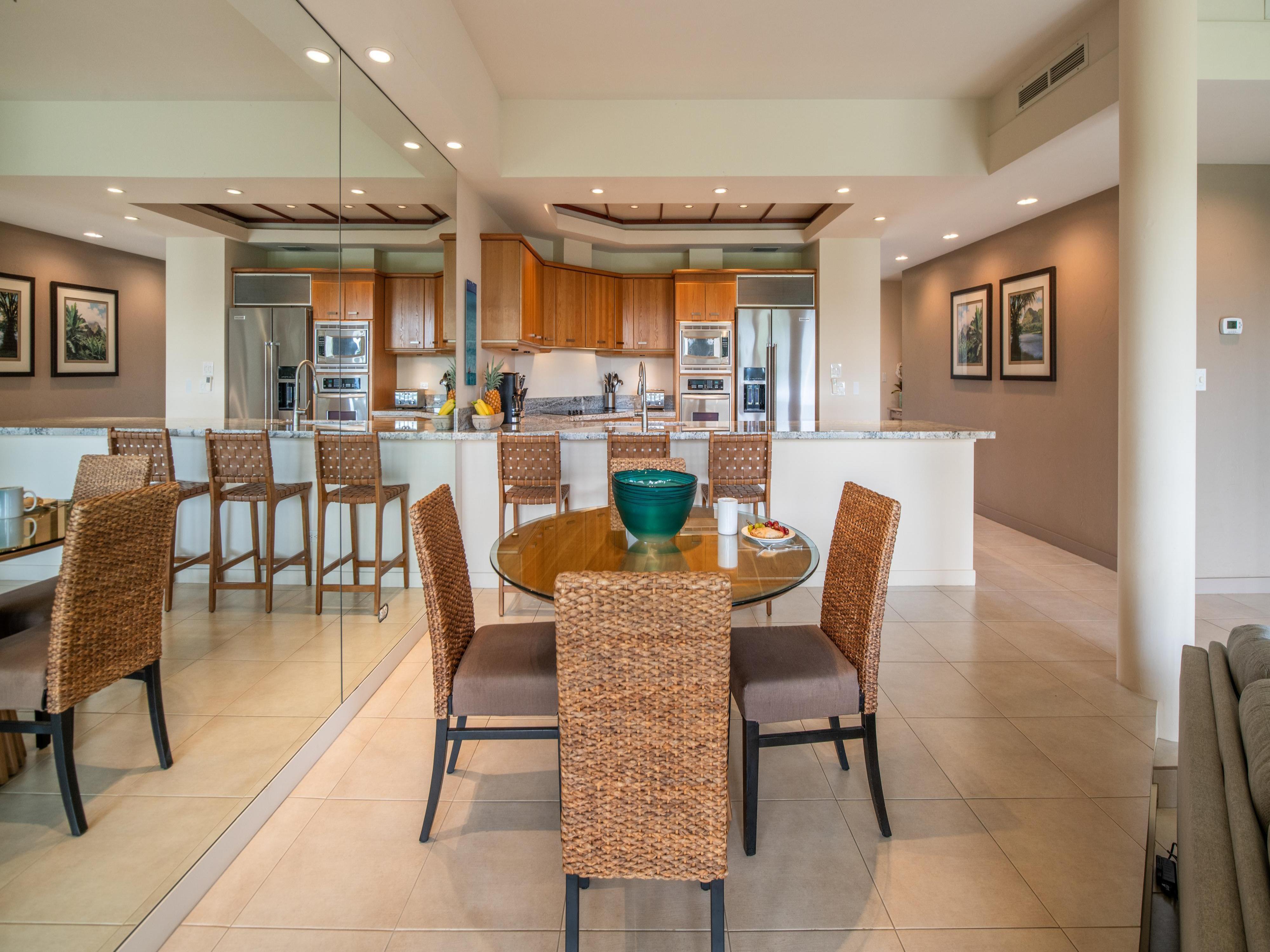 The floor-to-ceiling windows enhance the indoor-outdoor experience, reminding you of the endless adventure and relaxation opportunities at your fingertips. Whether you’re preparing a meal in the gourmet kitchen, watching a movie in the living area, or simply enjoying your surroundings, you’ll experience the best of Hawaiian living.