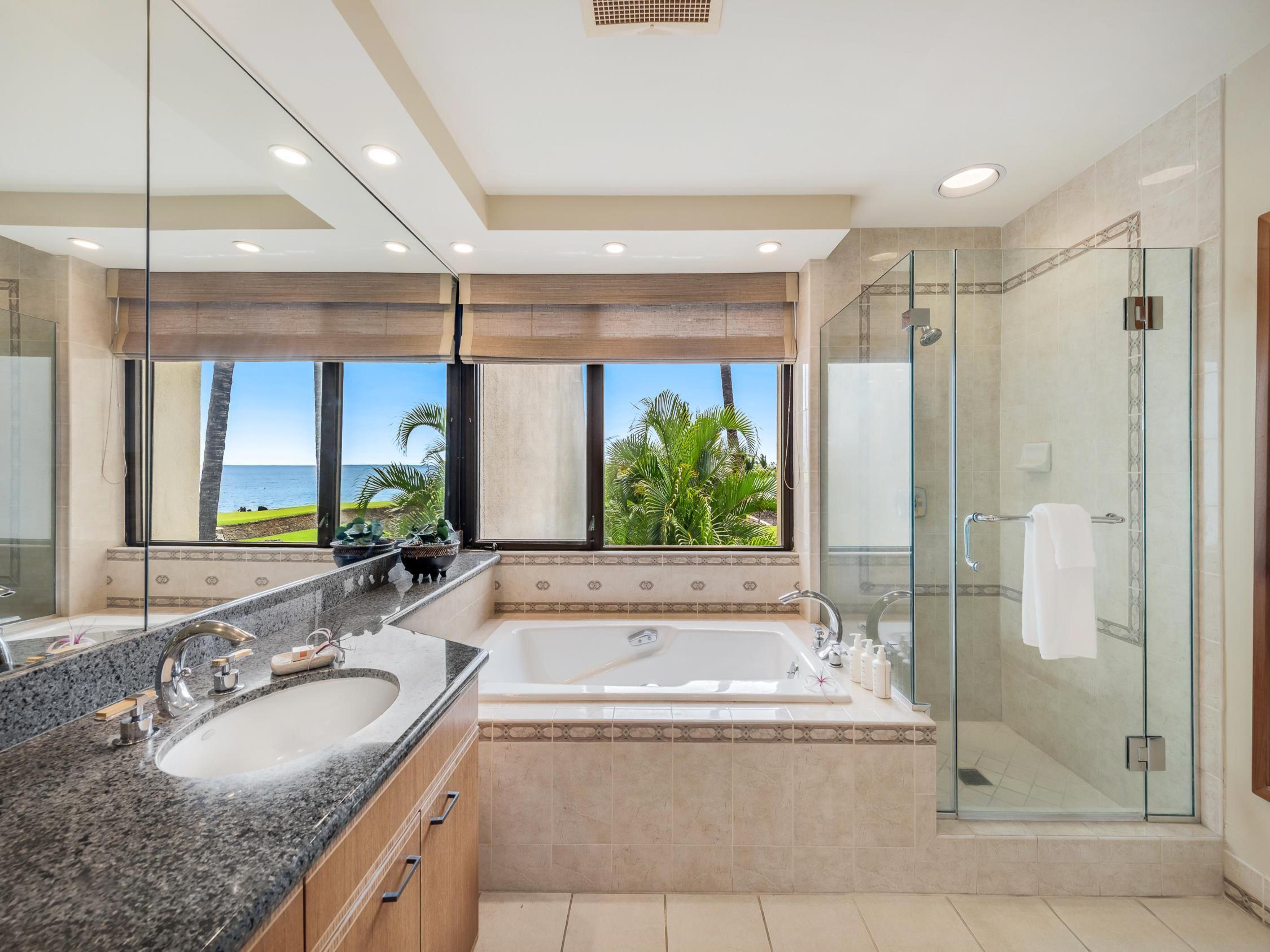 Both bedrooms are furnished with king-sized beds and en-suite bathrooms, ensuring privacy and comfort. The primary suite includes a workstation near the lanai, ideal for those needing a dedicated workspace.