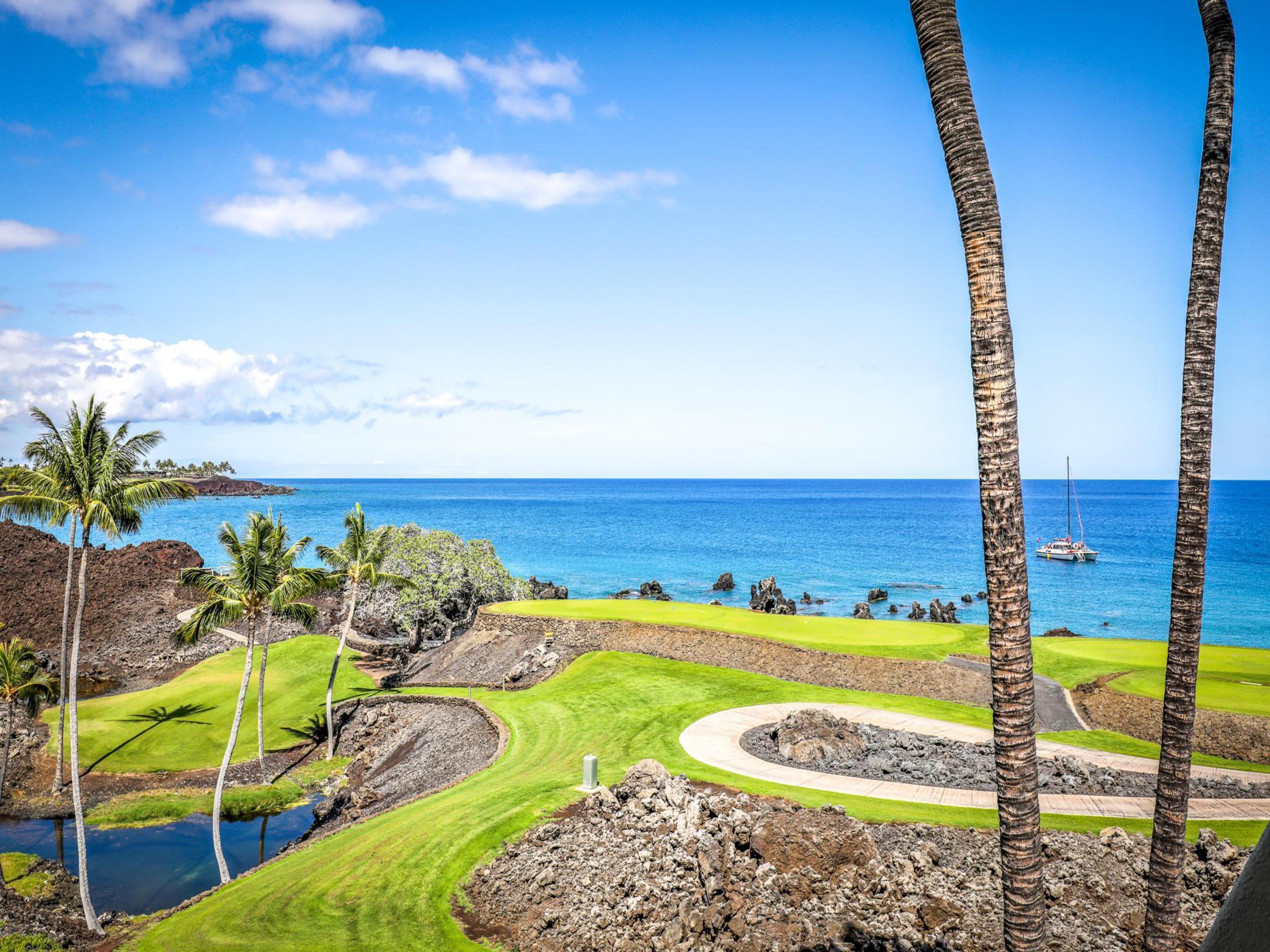 The privileged third floor location of Mauna Lani Point C303 provides you with the most elevated and dramatic views on property. Once you open the front door to this vacation rental you will be greeted with the ocean and golf course views. Make your way out onto the open-air lanai and gaze down the dramatic and colorful coastline that blends the hues of green grass, turquoise ocean, and black lava rock into a kaleidoscope of color. This condo also overlooks the most famous golf hole at Mauna Lani, which challenges golfers to hit their tee shot over the ocean onto an isolated putting green in the distance. Sit back on your lanai and watch golfers try and conquer this world-famous hole.