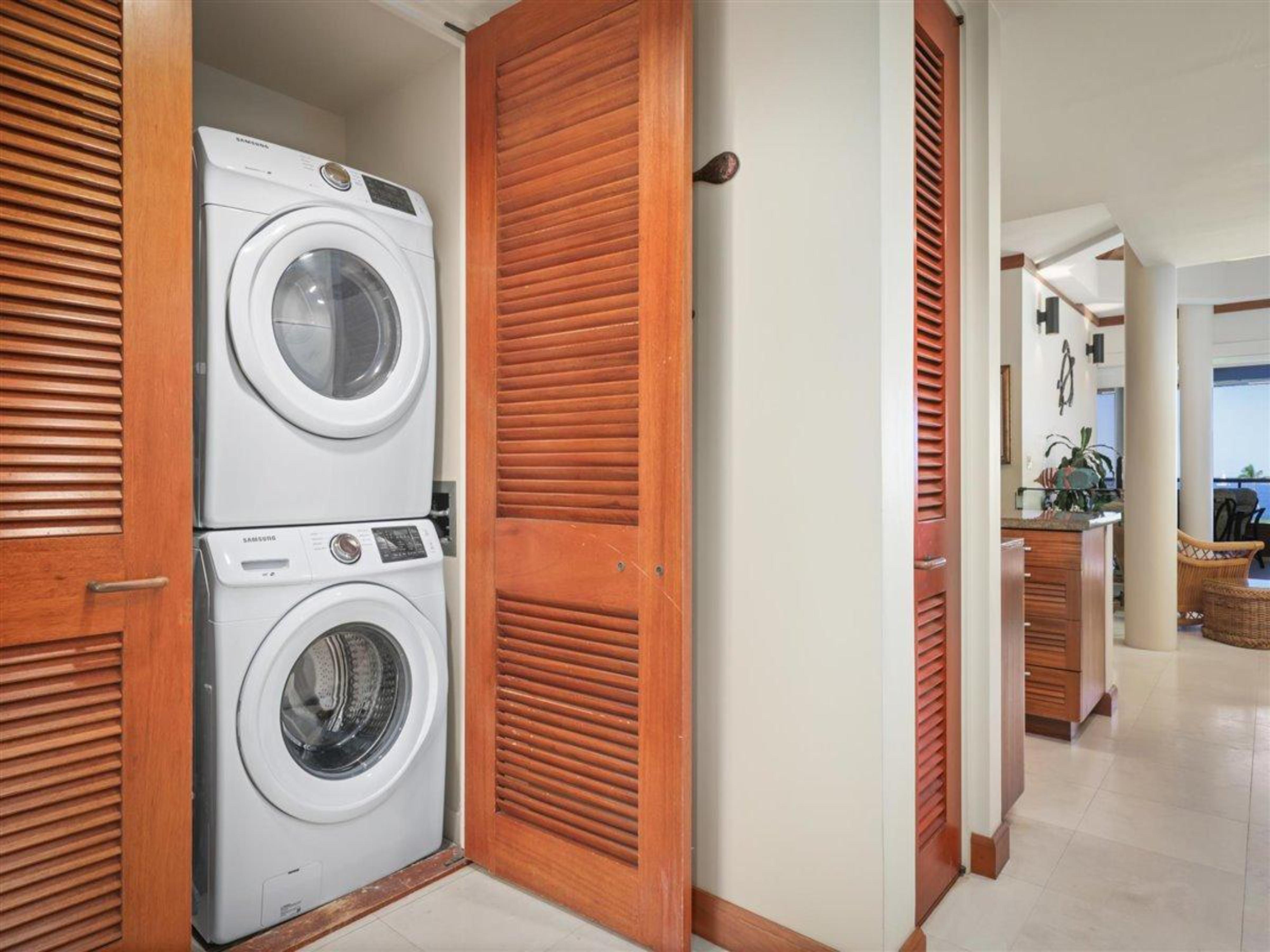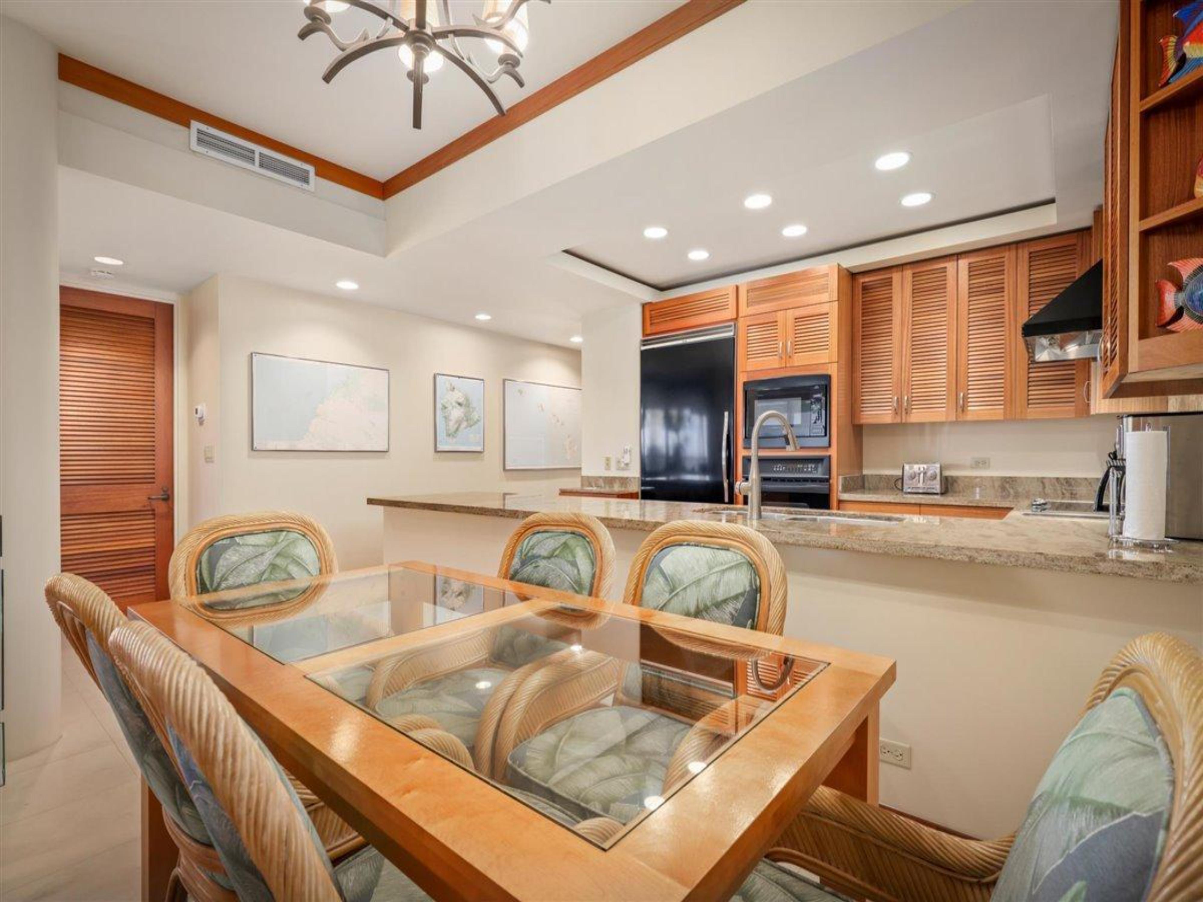 The modern kitchen features an impressively long granite island perfect for congregating around for morning breakfast, happy hour drinks, or Hawaiian-inspired appetizers. Dine more traditionally at the neighboring glass dining table that can seat up to six guests.