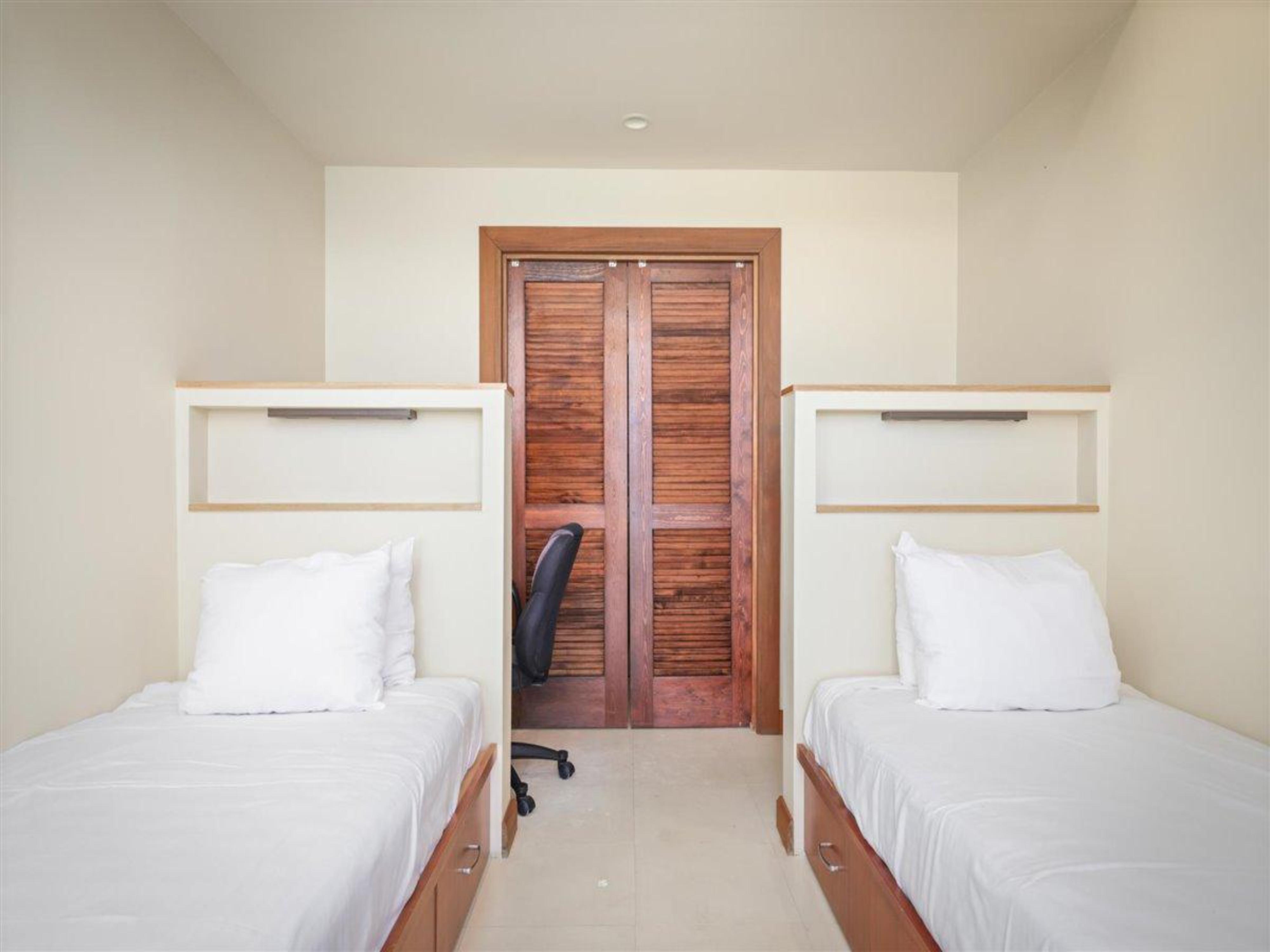 The primary bedroom includes a king bed and an additional private sliding door out to the primary lanai overlooking the ocean. The ensuite bathroom features a dual vanity and extra-large walk-in shower. The second bedroom features two more twin beds, private flat screen TV, and views out over the tropical property grounds.