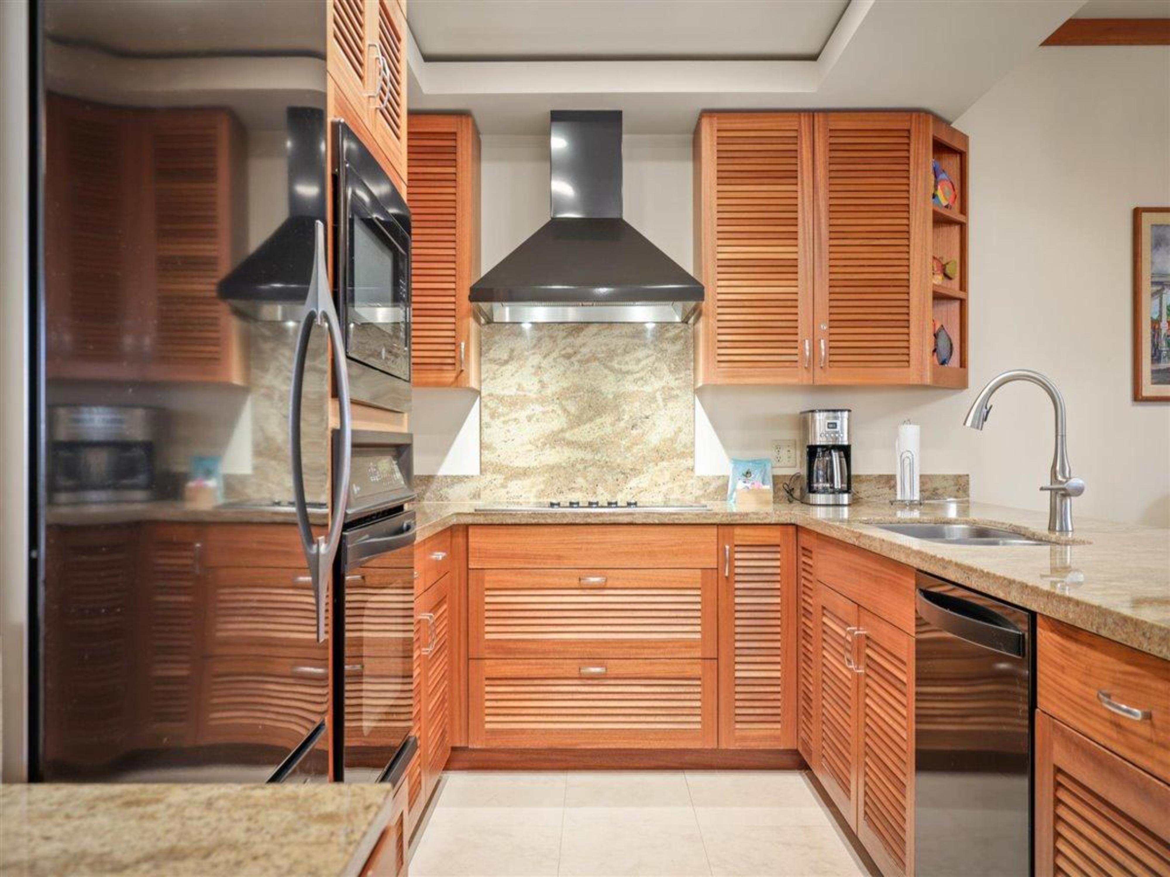 Fully equipped kitchen with modern appliances including a stove, oven, microwave, refrigerator, and dishwasher, alongside granite countertops