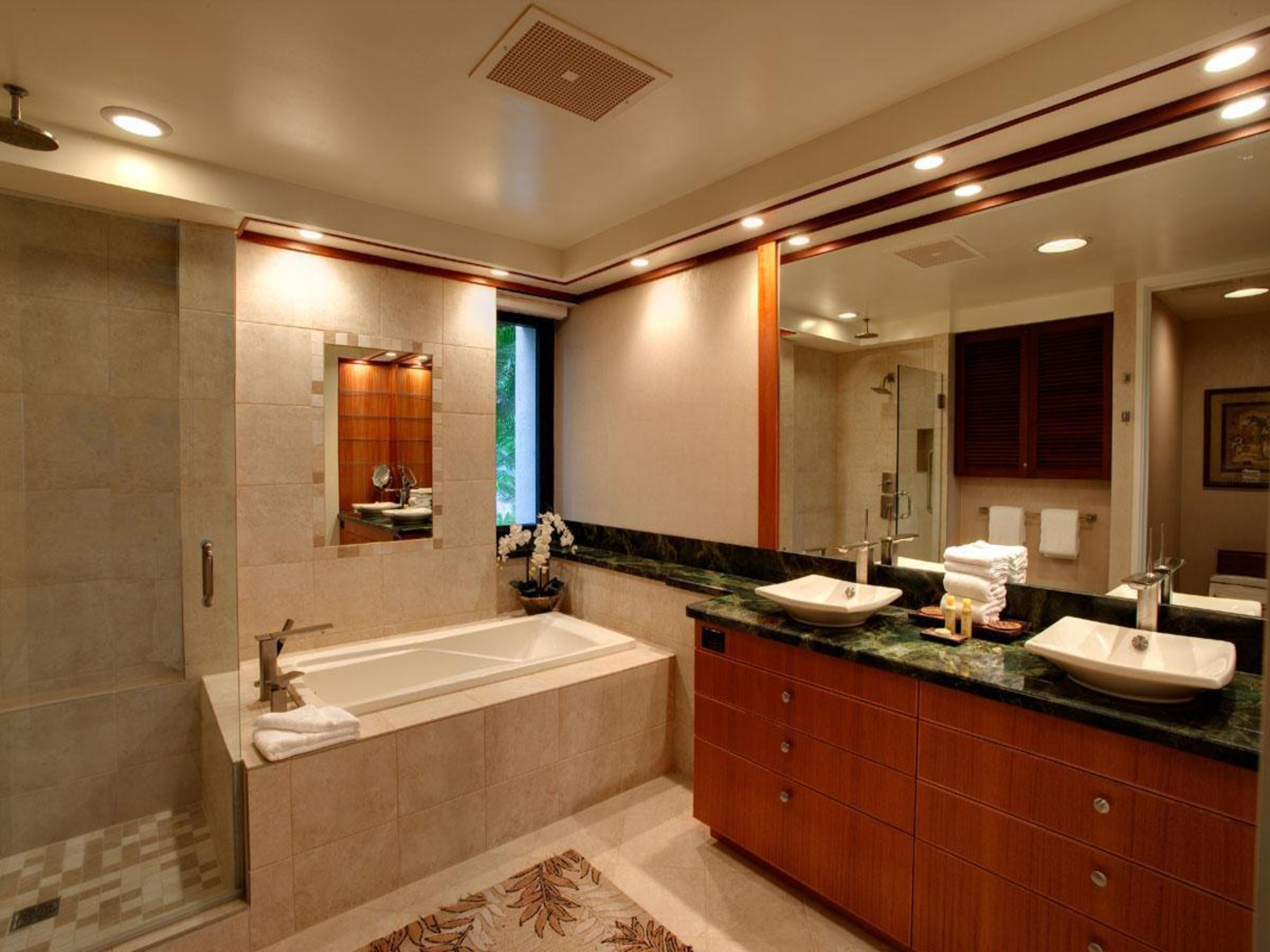 The primary bedroom has a king bed and flat screen TV for additional before-bed viewing. Access the ground floor lanai through an additional private sliding door off the primary bedroom. The en-suite designer bathroom features custom sinks, a deep soaking tub, and stand-alone shower with multiple shower heads. The second bedroom has a comfortable four-poster king bed with tub/shower combo in the bathroom.