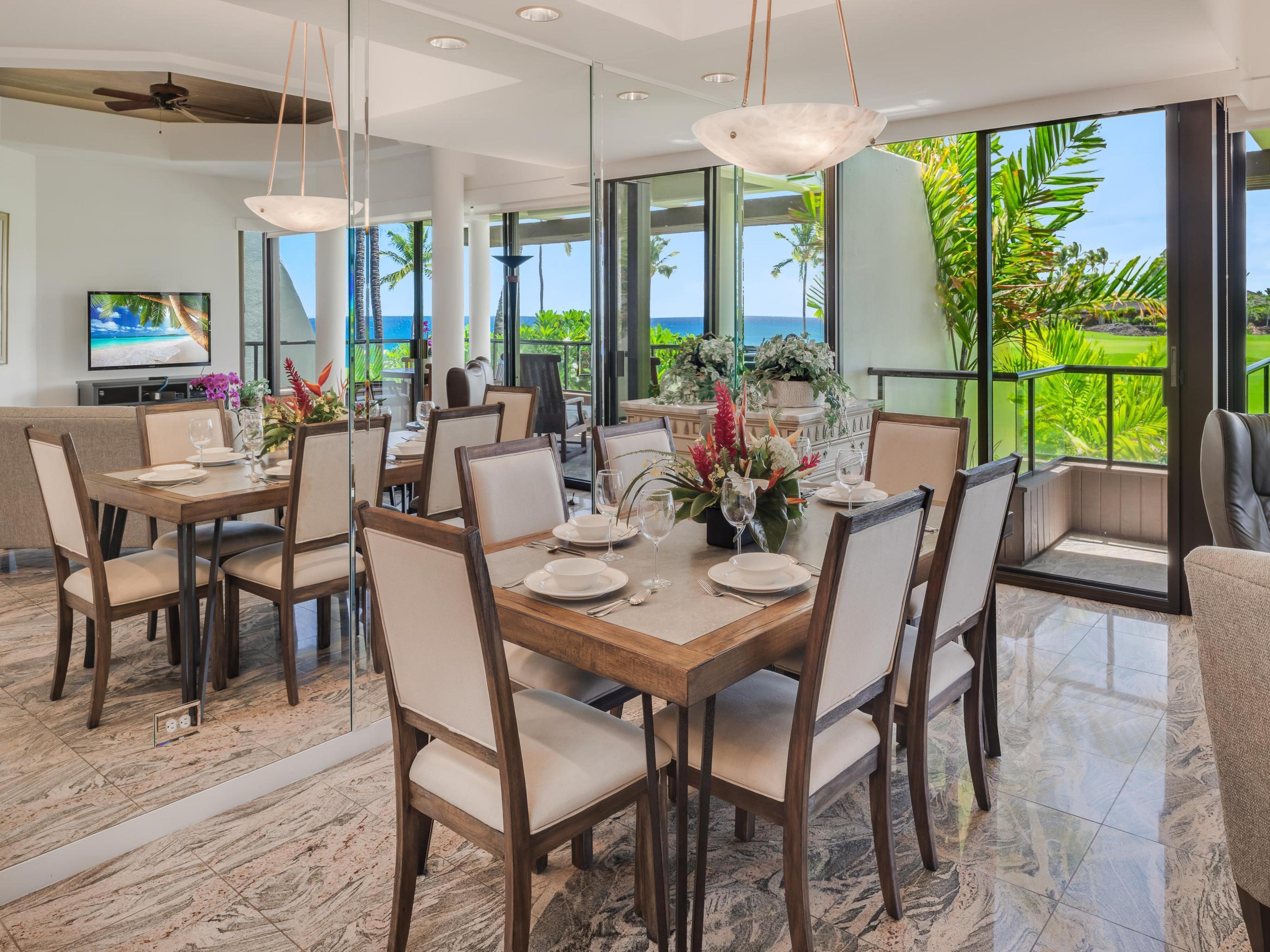 Upon entering, you are greeted by a spacious and elegantly designed living area featuring high ceilings and ambient lighting. The open-concept layout seamlessly connects the living room, dining area, and fully equipped kitchen, making it perfect for entertaining or enjoying quiet evenings in. Large sliding glass doors lead to your private lanai, where you can sip morning coffee while watching the waves crash against the shore or unwind in the evening as the sun sets over the Pacific.