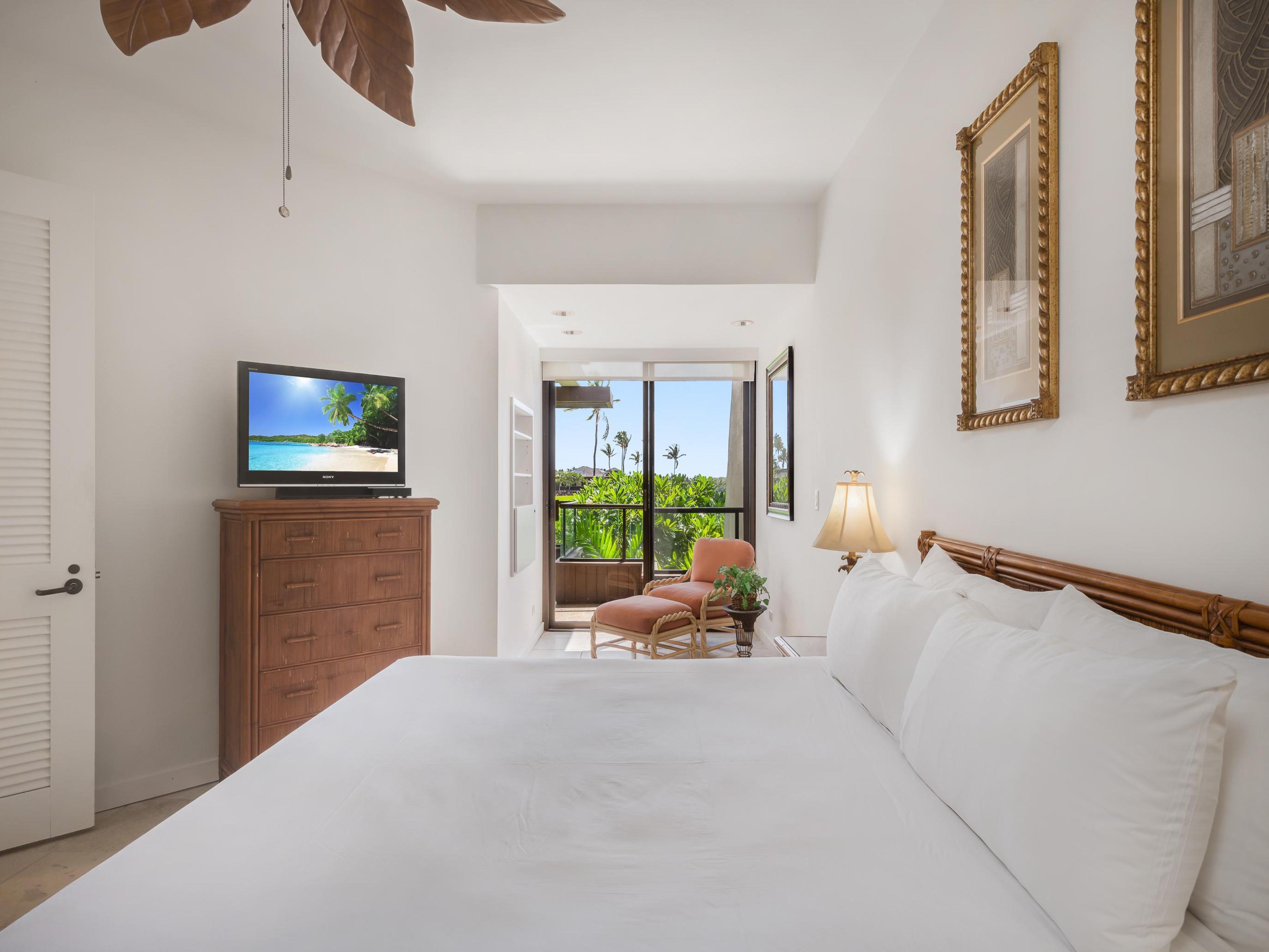 Both bedrooms are havens of comfort. The primary suite features lanai access and an ensuite bathroom with a luxurious shower, while the second bedroom offers stunning garden views and an ensuite bathroom with shower/tub combo. With high-quality linens and plush furnishings, restful nights are guaranteed.