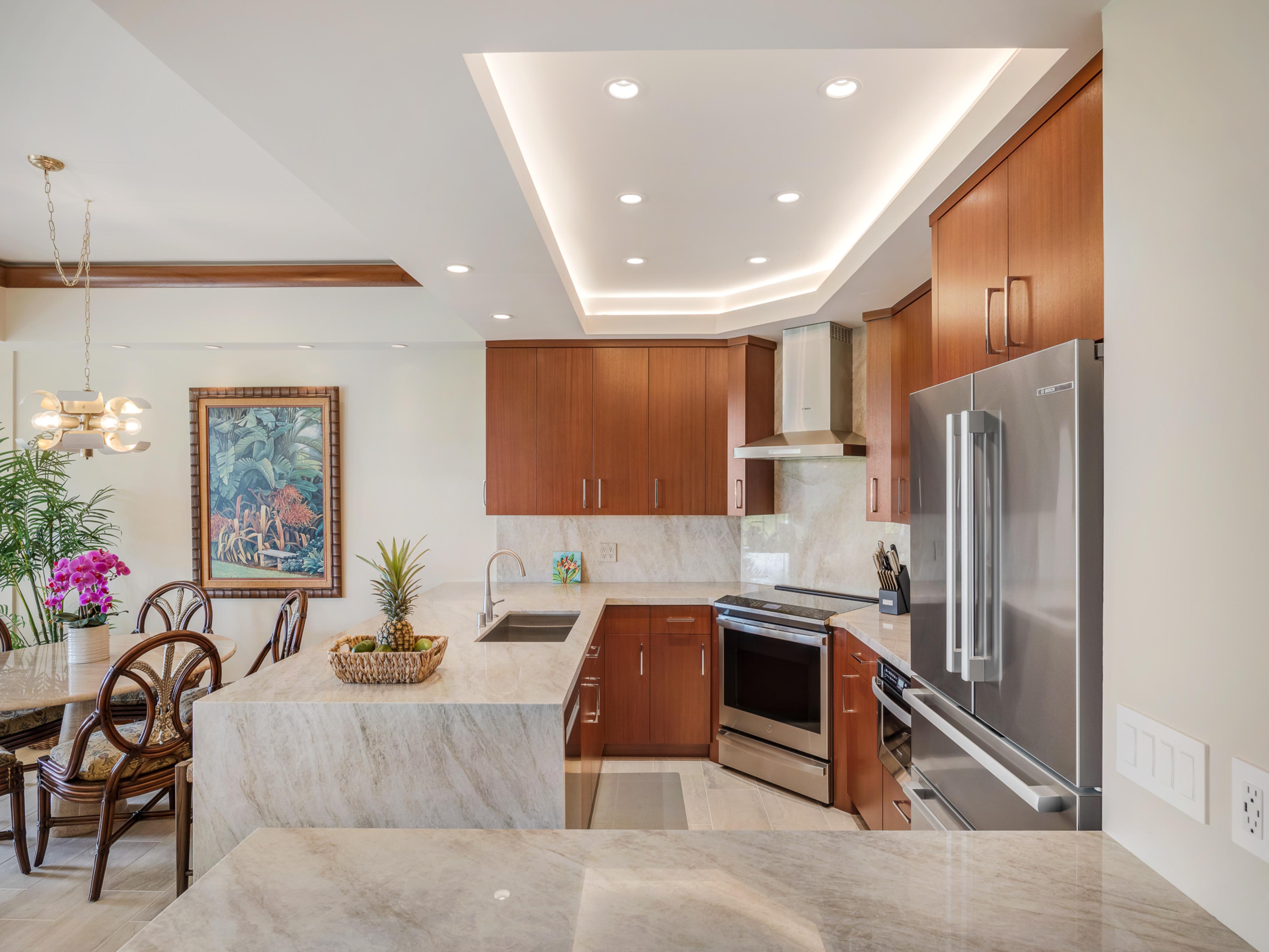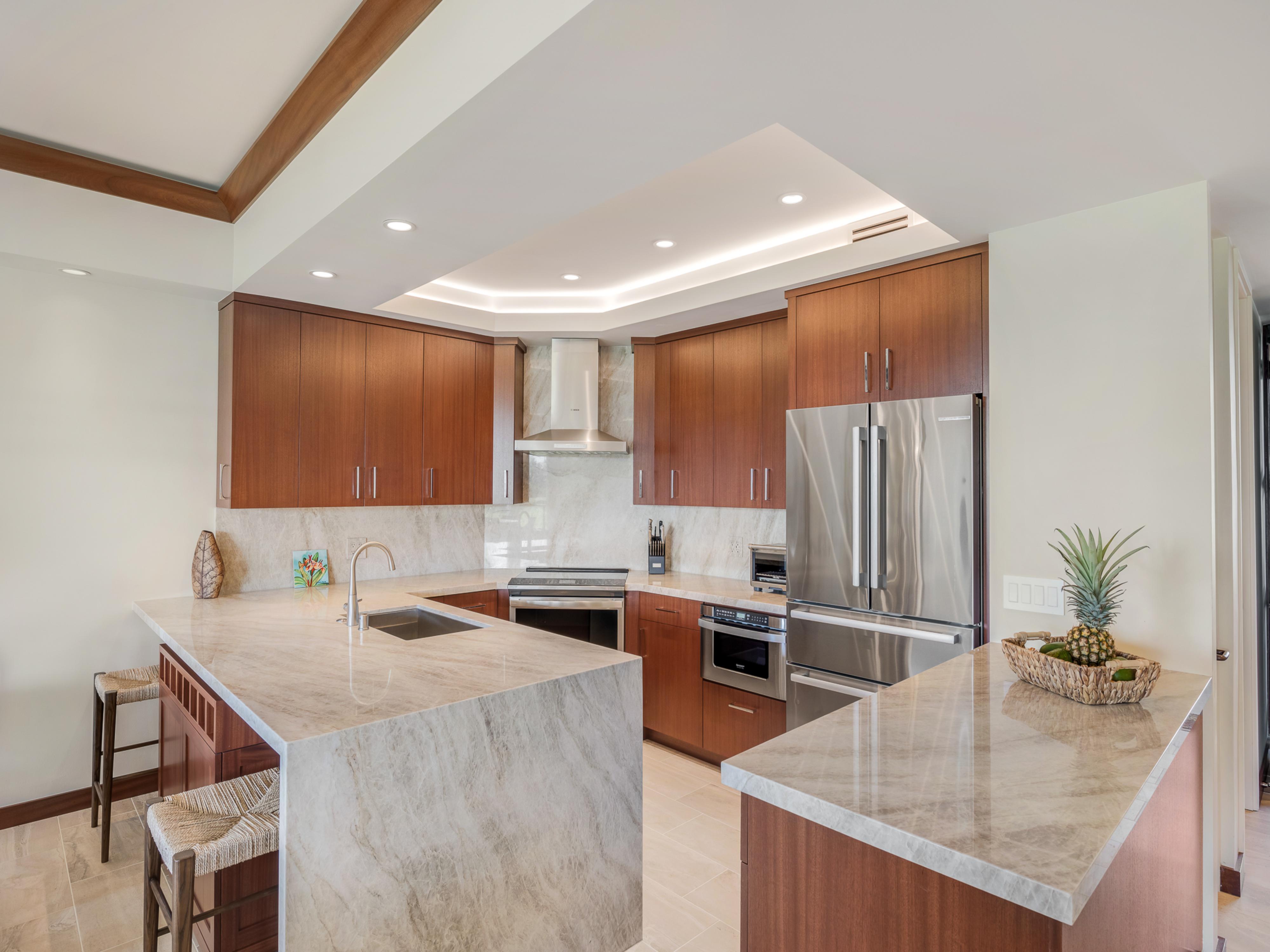 - Fully equipped kitchen with modern appliances including a stove, oven, microwave, refrigerator, and dishwasher, alongside granite countertops