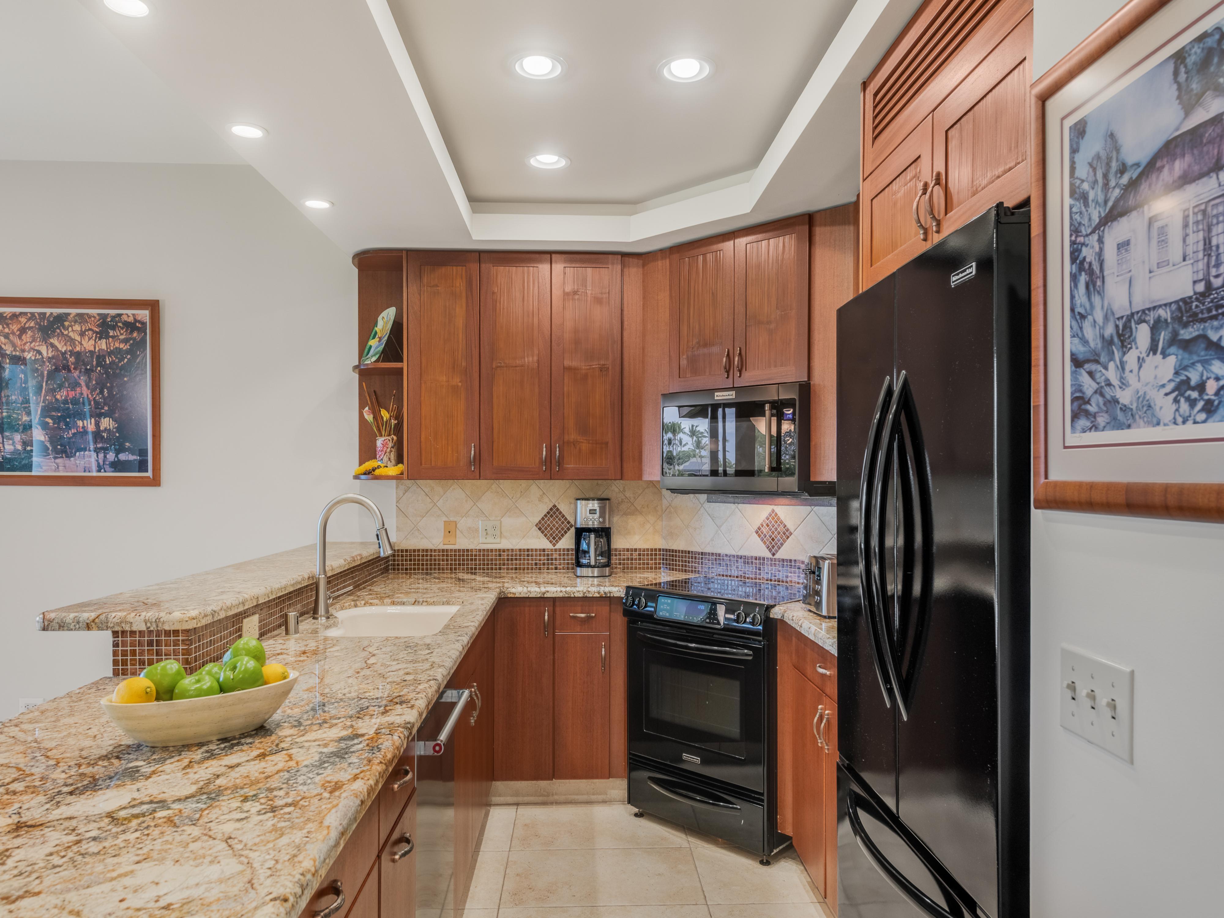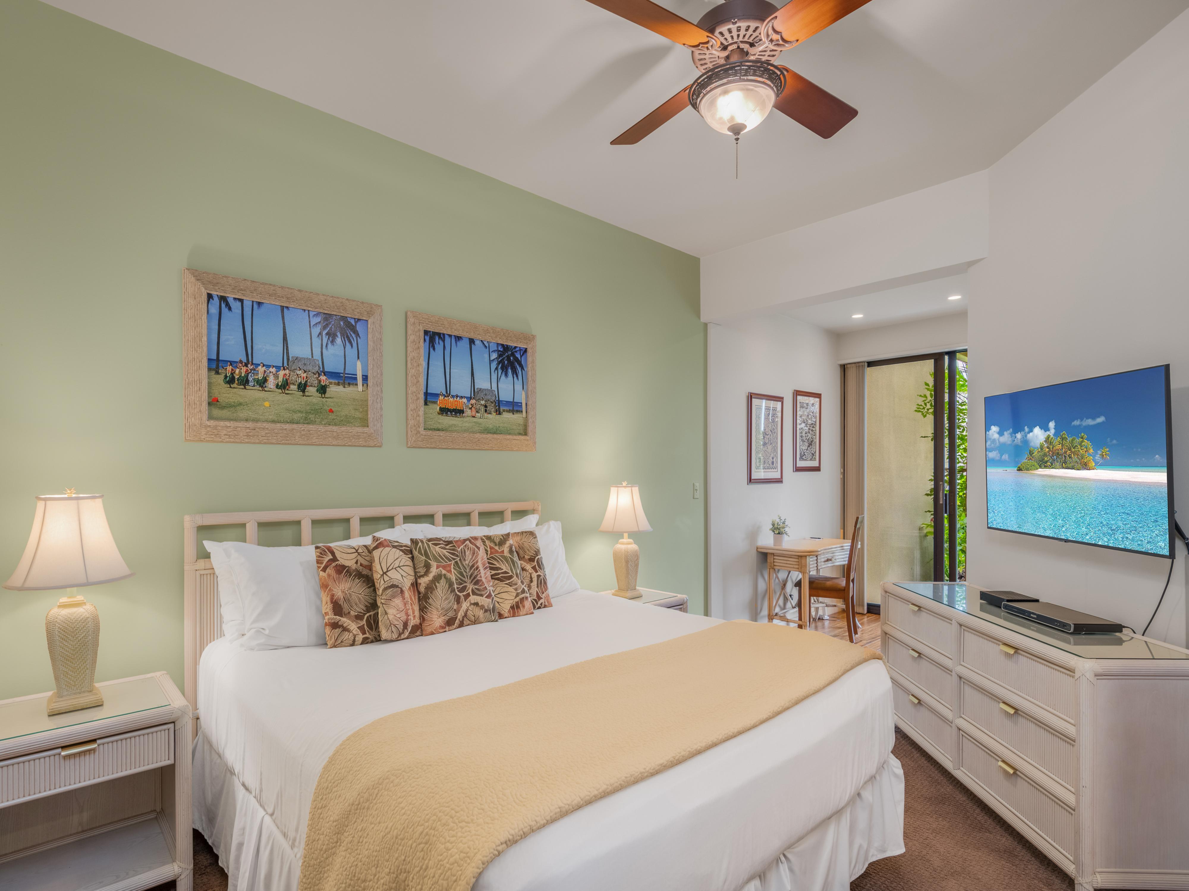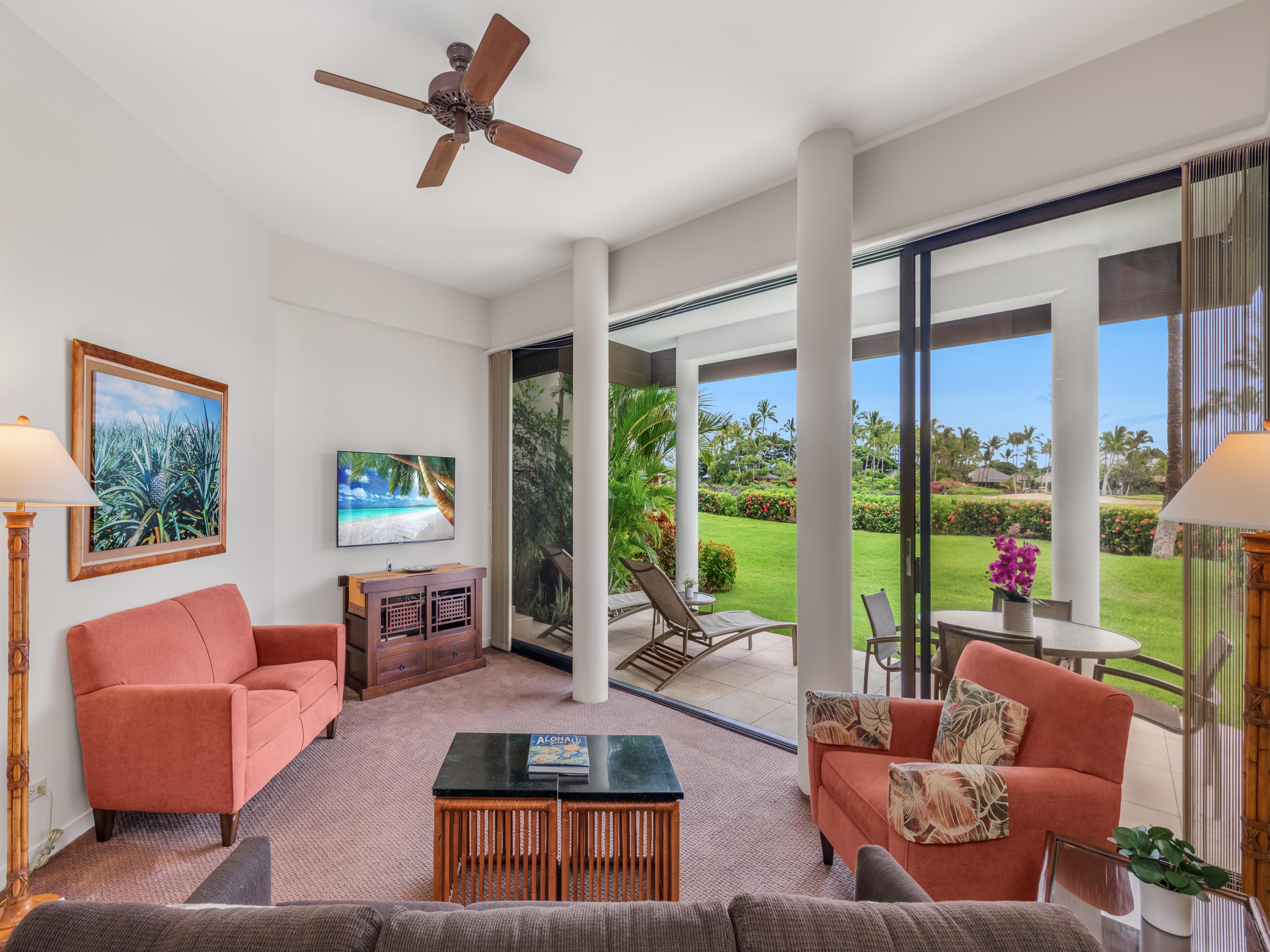 Welcome to the serene and luxurious Mauna Lani Point J101, a perfect retreat nestled in the heart of Kamuela, Hawaii. This stunning 1-bedroom, 1-full and 1-half bathroom condo offers a cozy yet elegant space for up to two guests. The master bedroom features a plush king-sized bed, ensuring a restful night's sleep. The open-concept living area is thoughtfully designed with modern amenities, including a fully equipped kitchen, a comfortable dining area, and a spacious living room with a cozy fireplace.