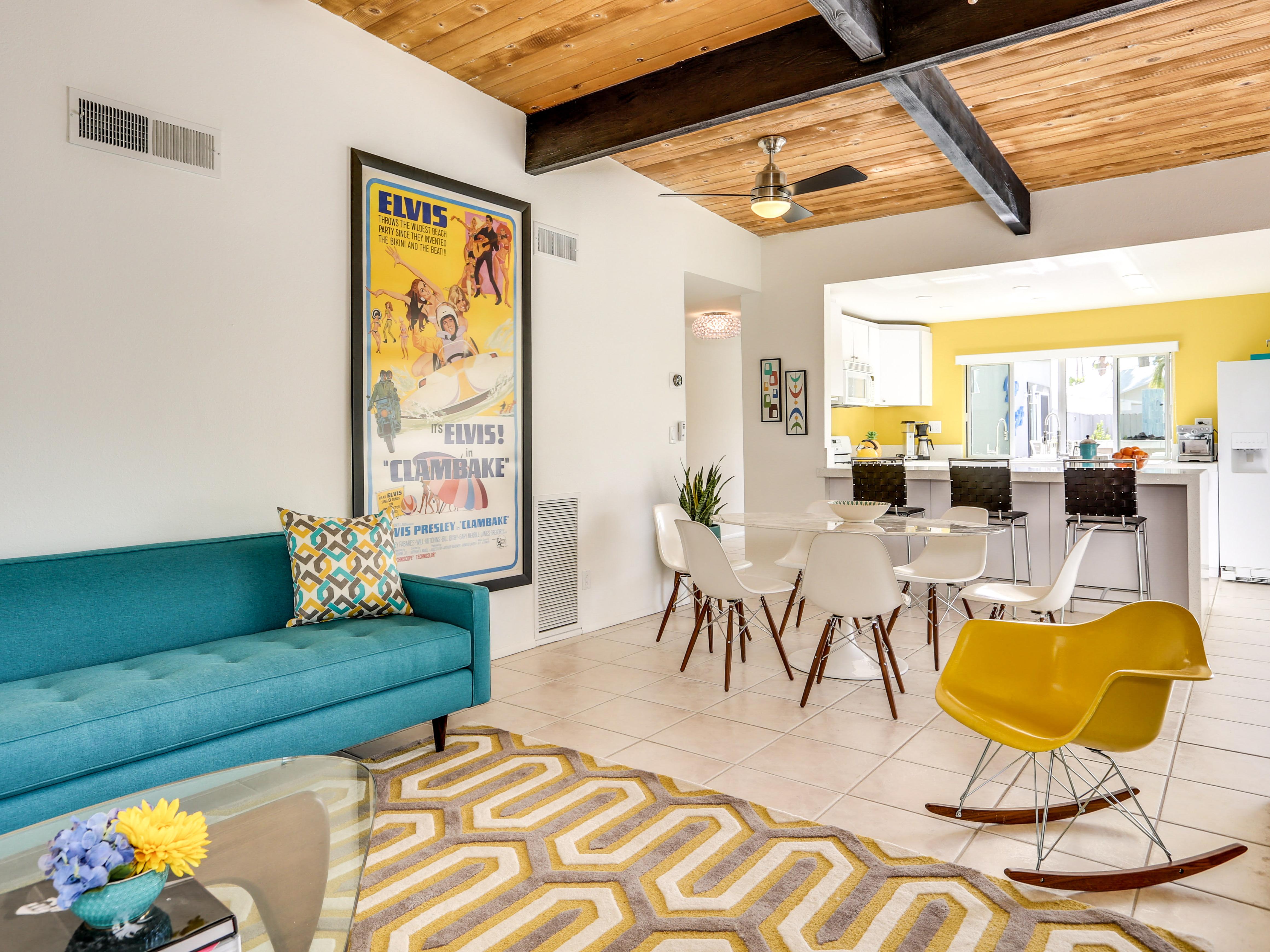 The home’s design honors its Alexander roots with open-concept living, clean lines, and original post-and-beam ceilings, while adding modern conveniences throughout. Walls of glass fill the living and dining areas with natural light and connect seamlessly to the backyard. The living room is comfortably furnished with a spacious midcentury-inspired sectional, a vintage Elvis movie poster, and a 55” 4K television paired with premium Martin Logan speakers. Guests can stream music through Pandora or internet radio and enjoy cinematic sound while relaxing indoors. The dining area and kitchen flow effortlessly together, creating a social hub for shared meals, cocktails, and conversation.