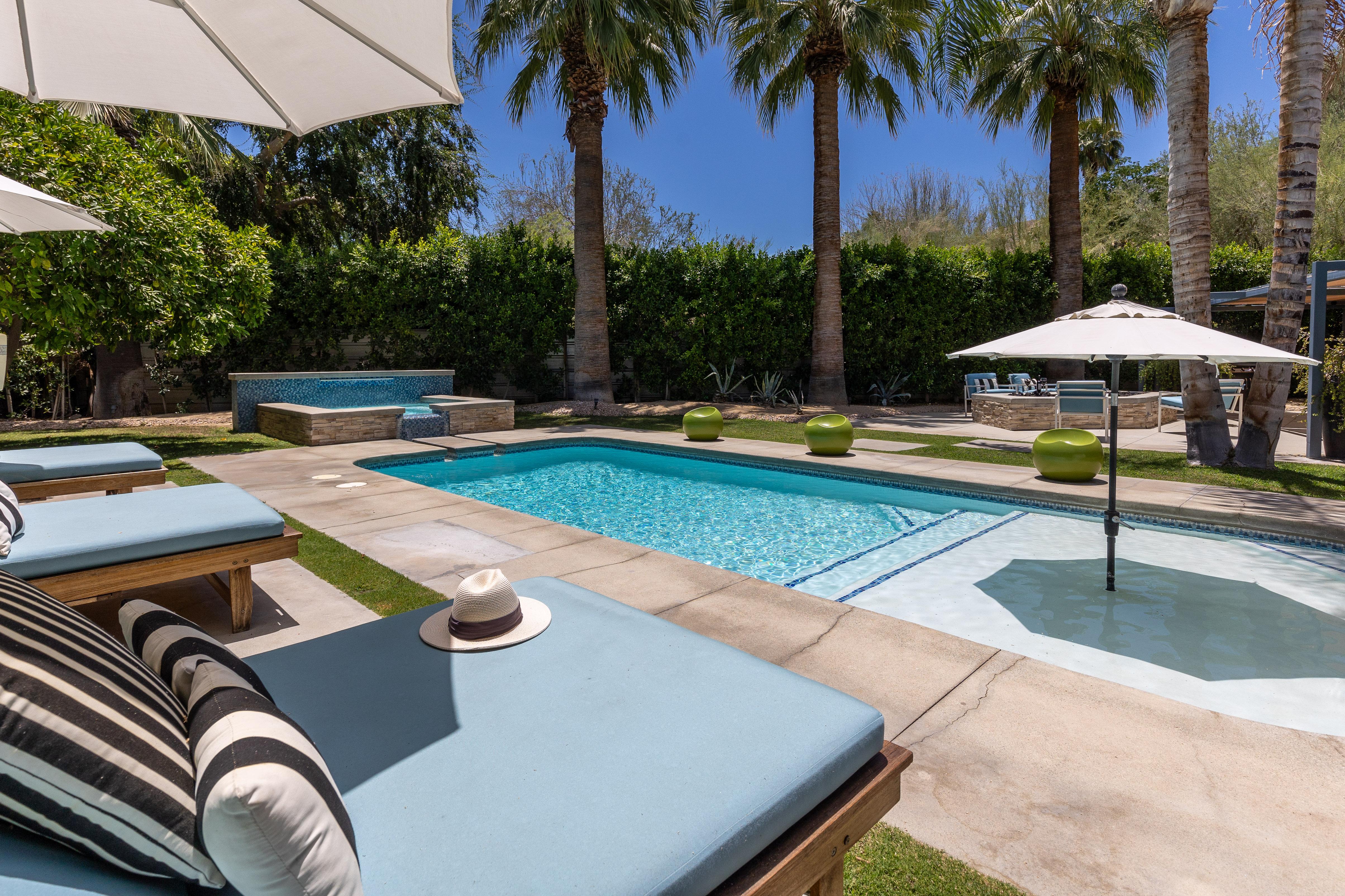 Your private desert oasis awaits. Lounge by the sparkling pool, soak in the waterfall spa, or sip cocktails beside the swanky fire pit as the sun sets behind the San Jacinto Mountains. The beautifully landscaped yard combines mid-century design elements with lush desert flora, creating an intimate and luxurious space for outdoor living, dining, and entertaining under the stars.