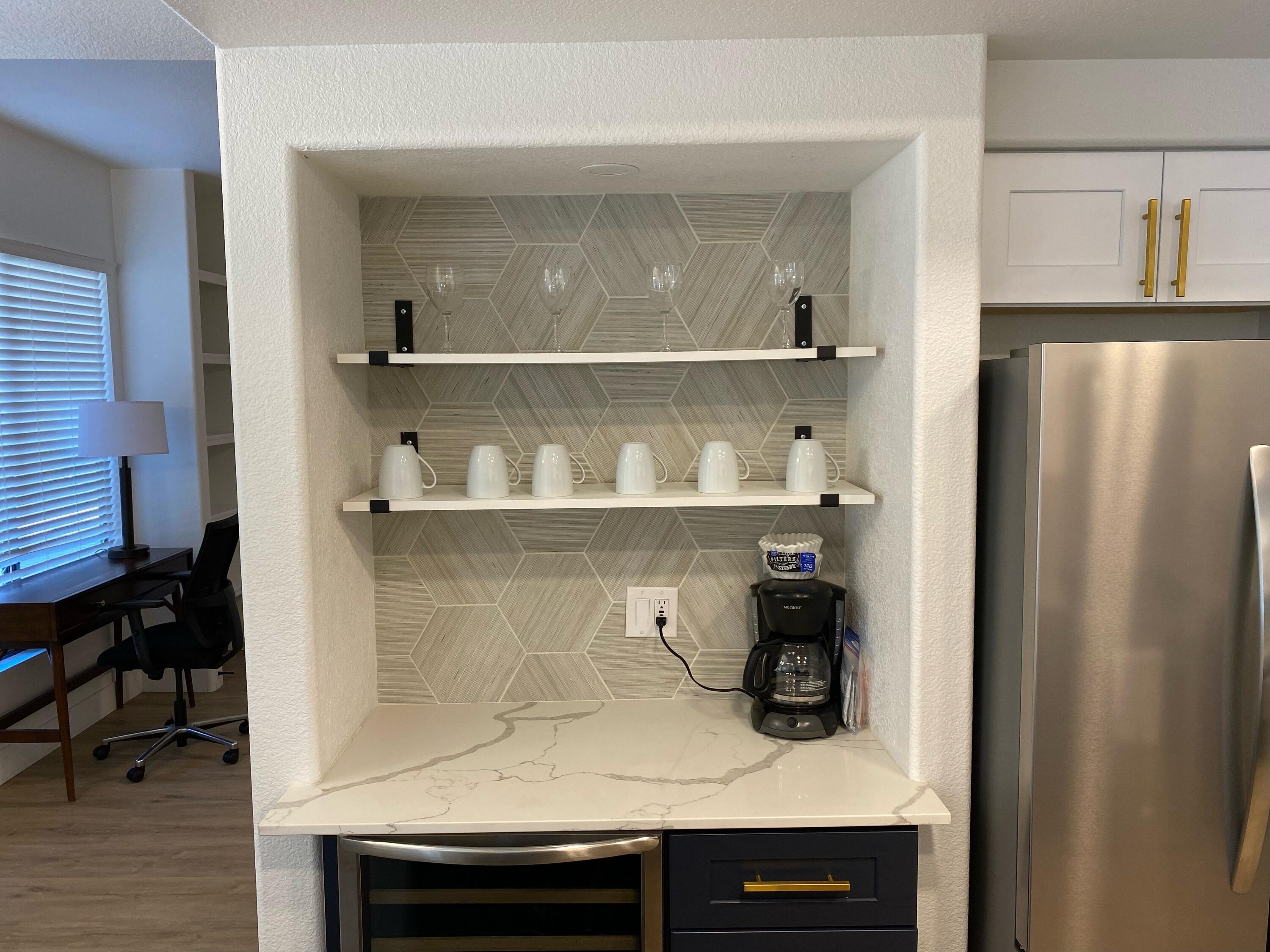 • Sleek Quartz Countertops with Designer Tile Backsplash