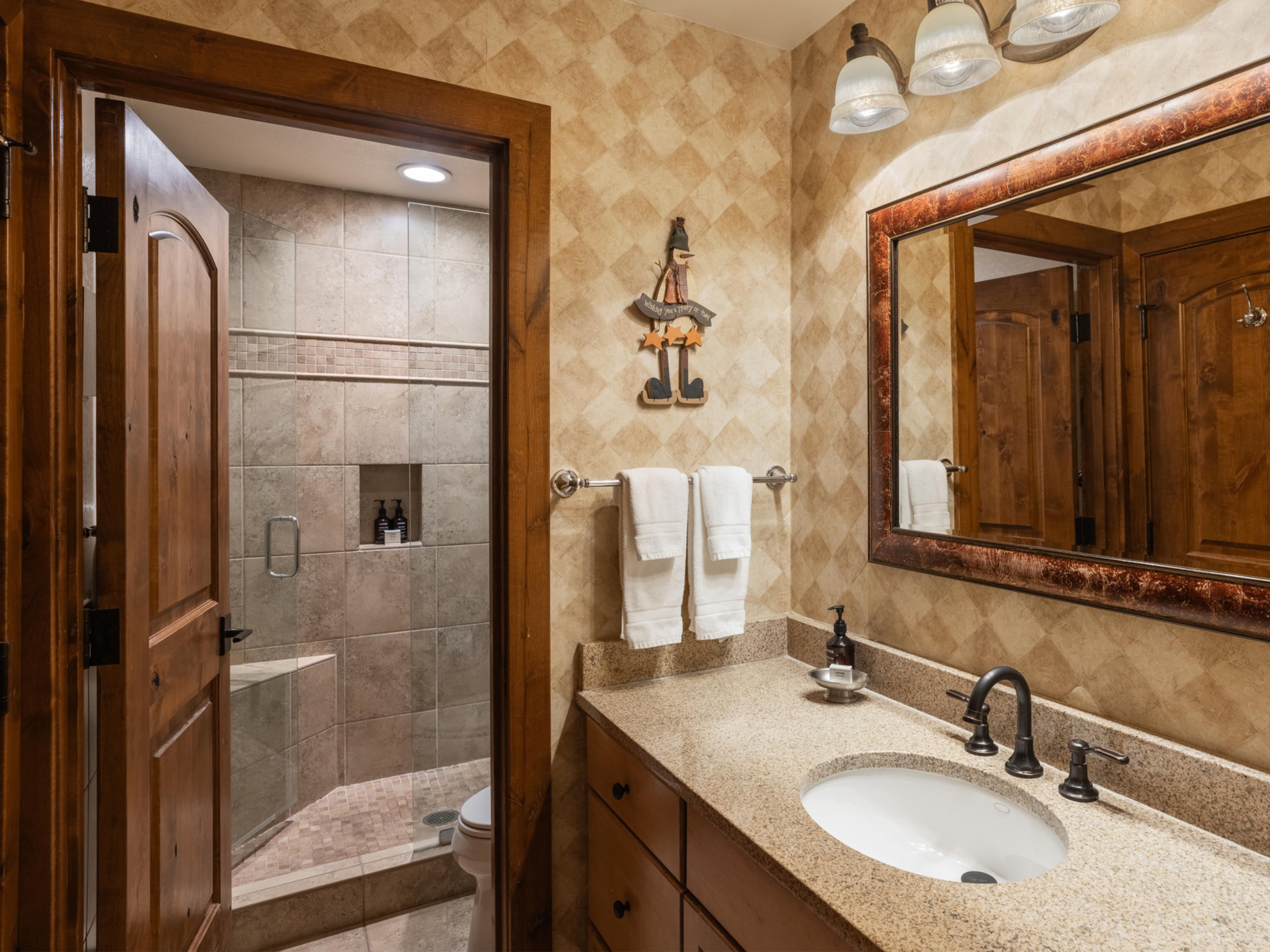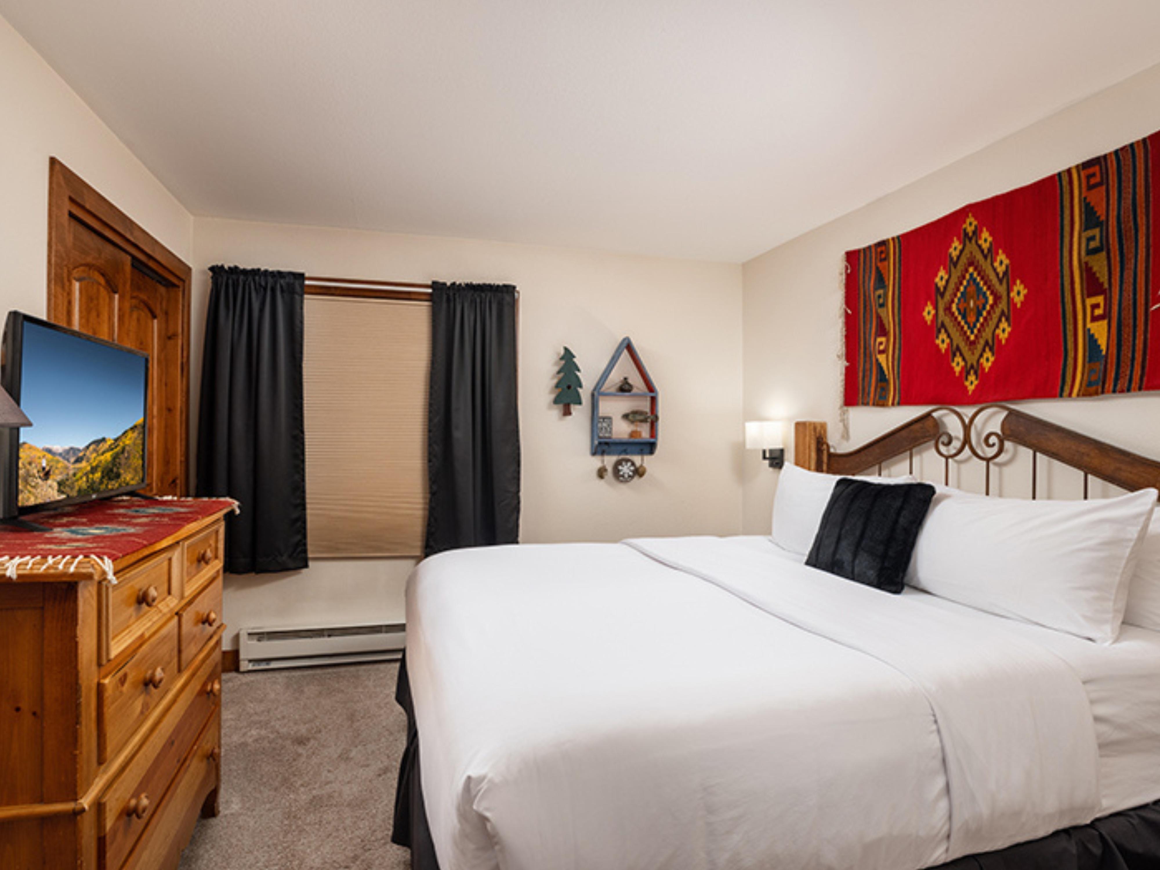 Montaneros in Vail 211 is a one-bedroom, one-bathroom condo located on the 2nd floor, featuring partial Vail Mountain views. With 760 square feet of space, this inviting unit includes a master bedroom with a king bed and a connecting bathroom with a walk-in shower. The living room, equipped with a queen sofa sleeper, provides a comfortable area for relaxation. The fully equipped kitchen boasts granite countertops and stainless steel appliances, with seating for four at the kitchen counter and an additional dining table for four.