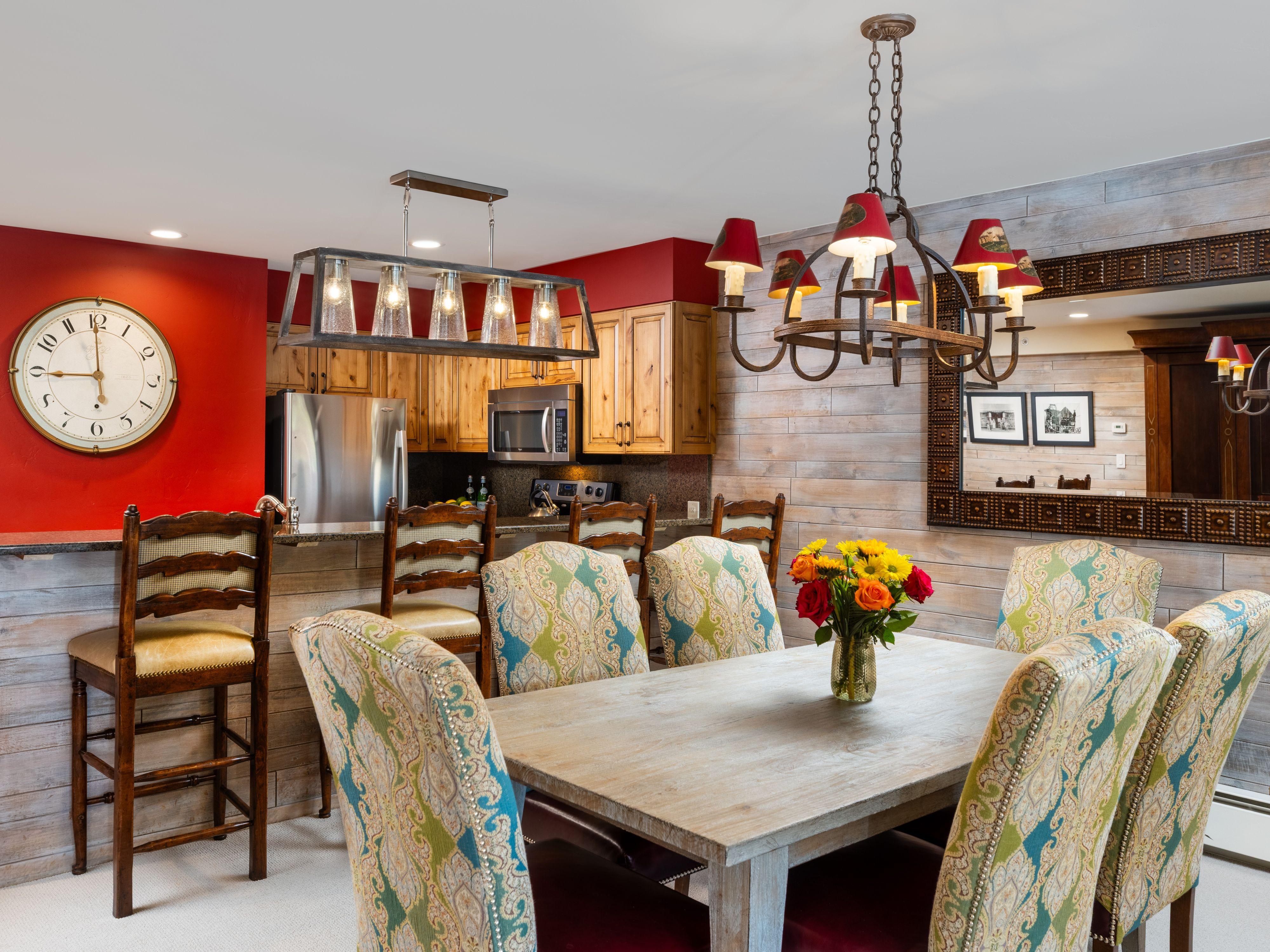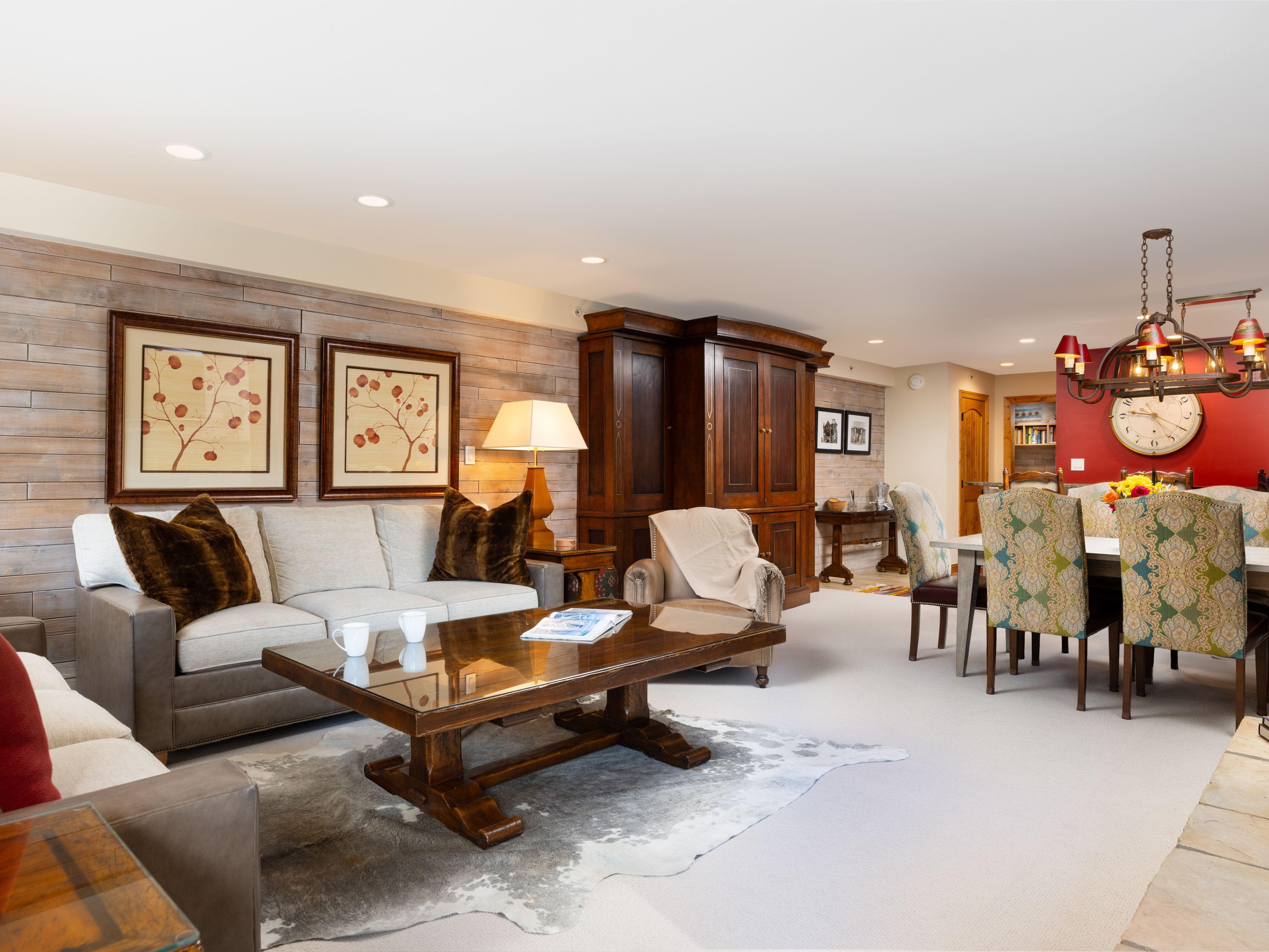 Montaneros in Vail 218 is a charming 1,145 sq ft two-bedroom, two-bathroom condominium located on the 2nd floor, offering partial Vail Mountain views. The master bedroom features a king bed and a connecting bathroom with a walk-in shower. The second bedroom includes two twin beds that can be converted into a king and an en-suite bathroom with a tub shower. The living room boasts a queen sofa sleeper and a fully equipped kitchen with granite countertops and stainless steel appliances. The kitchen counter seats three, and the dining table accommodates six, making it perfect for families or groups.