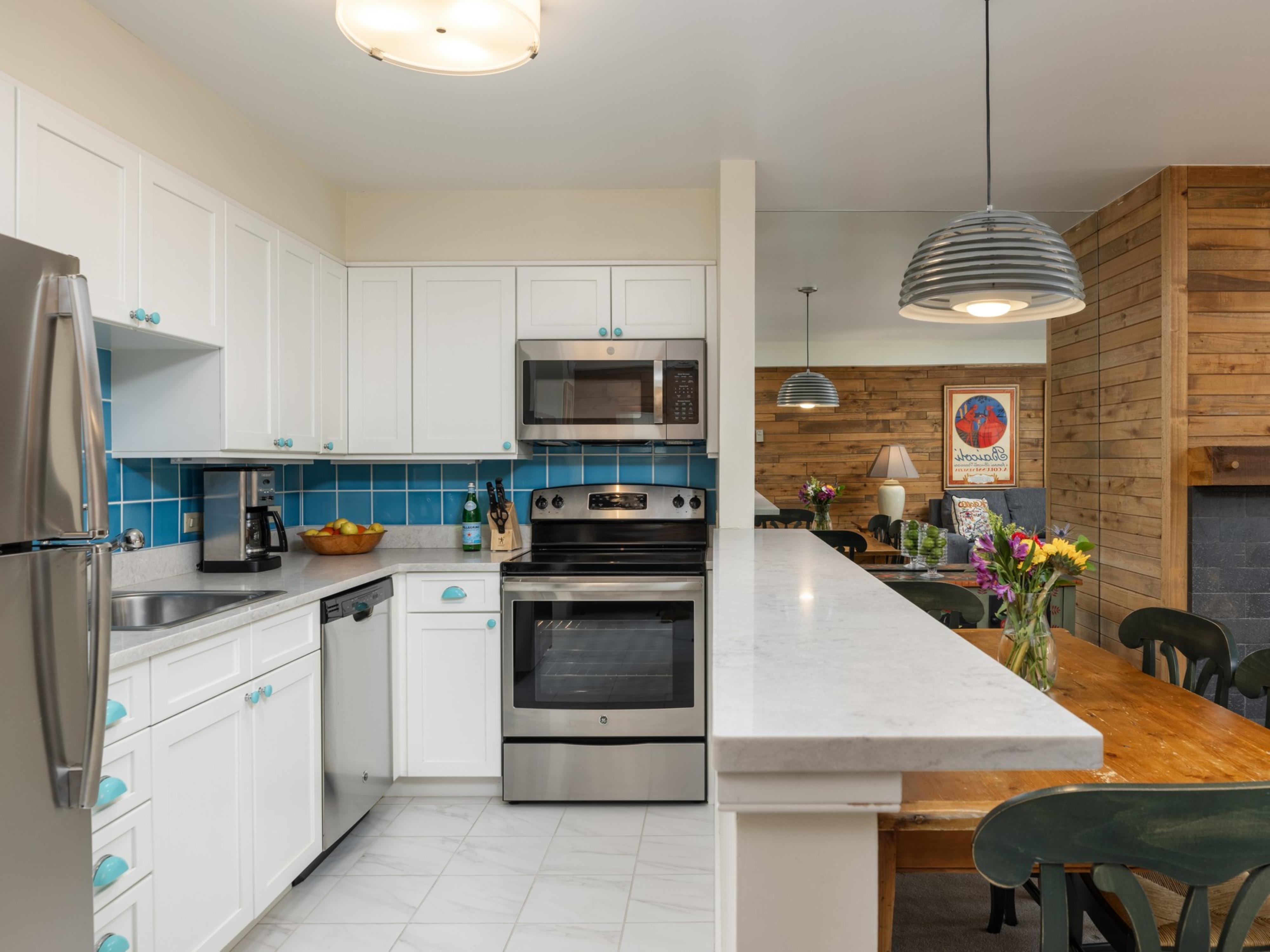 Montaneros in Vail 311 is a well-appointed 760 sq ft one-bedroom, one-bathroom condo on the 3rd floor, offering partial Vail Mountain views. The master bedroom features a king bed and an adjacent bathroom with a tub-shower. The living room includes a queen sofa sleeper, and the fully equipped kitchen boasts granite countertops and stainless steel appliances. The dining table seats four guests, providing a comfortable and functional space for your stay.