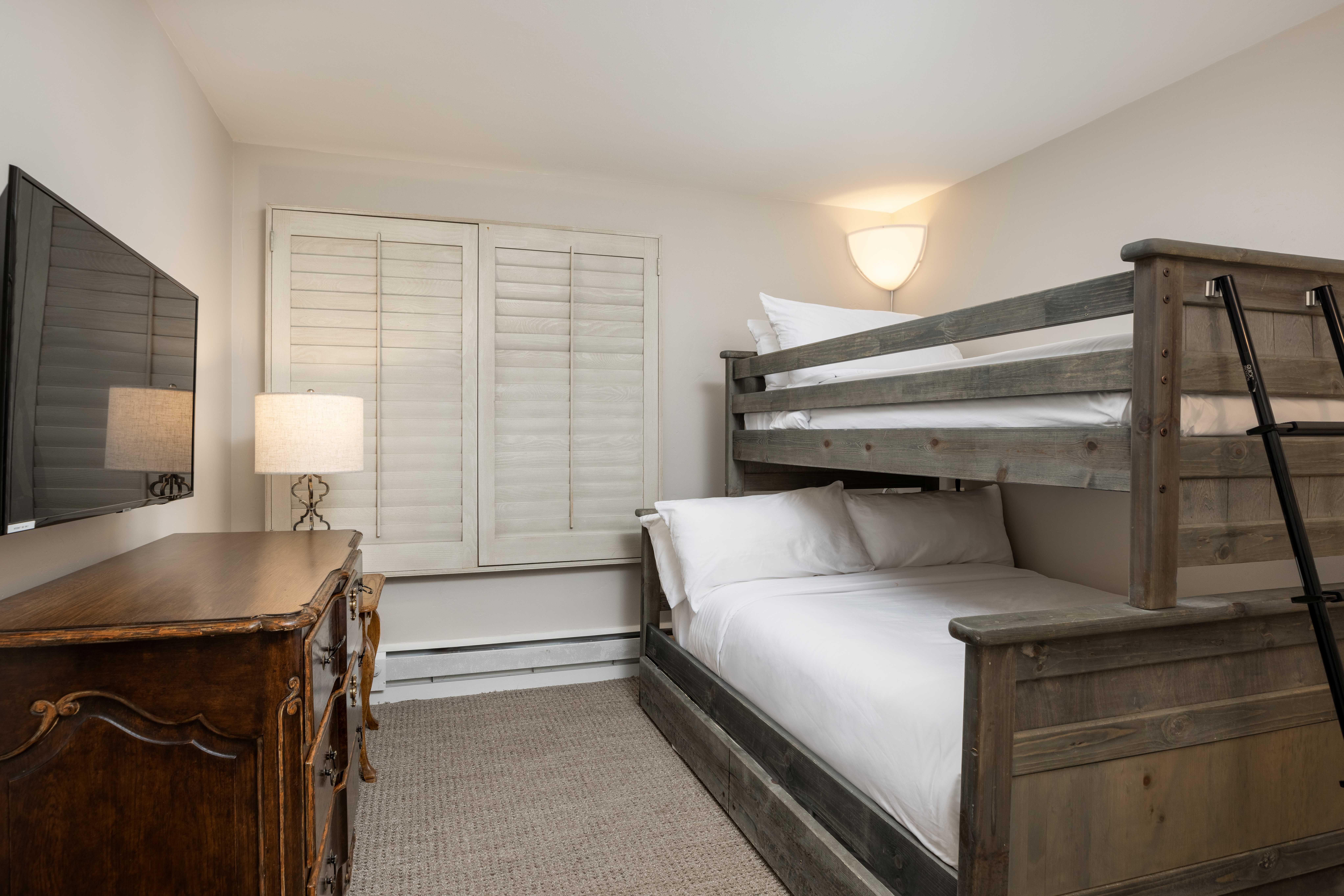 Montaneros 410 is a beautifully remodeled 1,375 sq ft platinum-rated three-bedroom, three-bath condominium located on the 4th floor of Montaneros in Vail. With partial views of Vail Mountain, this residence offers the perfect setting for a memorable Vail getaway. The newly upgraded unit features high-end finishes, granite countertops, and new stainless-steel appliances throughout. The spacious master bedroom, located on the second floor, includes a king bed and an ensuite bathroom with a walk-in shower. The second bedroom boasts a queen bed and an ensuite bathroom with a walk-in shower. The third bedroom is designed with a bunk bed (twin over full) and a trundle and access to a hallway bathroom with a shower tub. The living room, with vaulted ceilings and stunning mountain views, offering a cozy space to relax. The fully equipped kitchen features granite countertops and stainless-steel appliances, while the dining area comfortably seats eight, making it ideal for family meals and entertaining.
