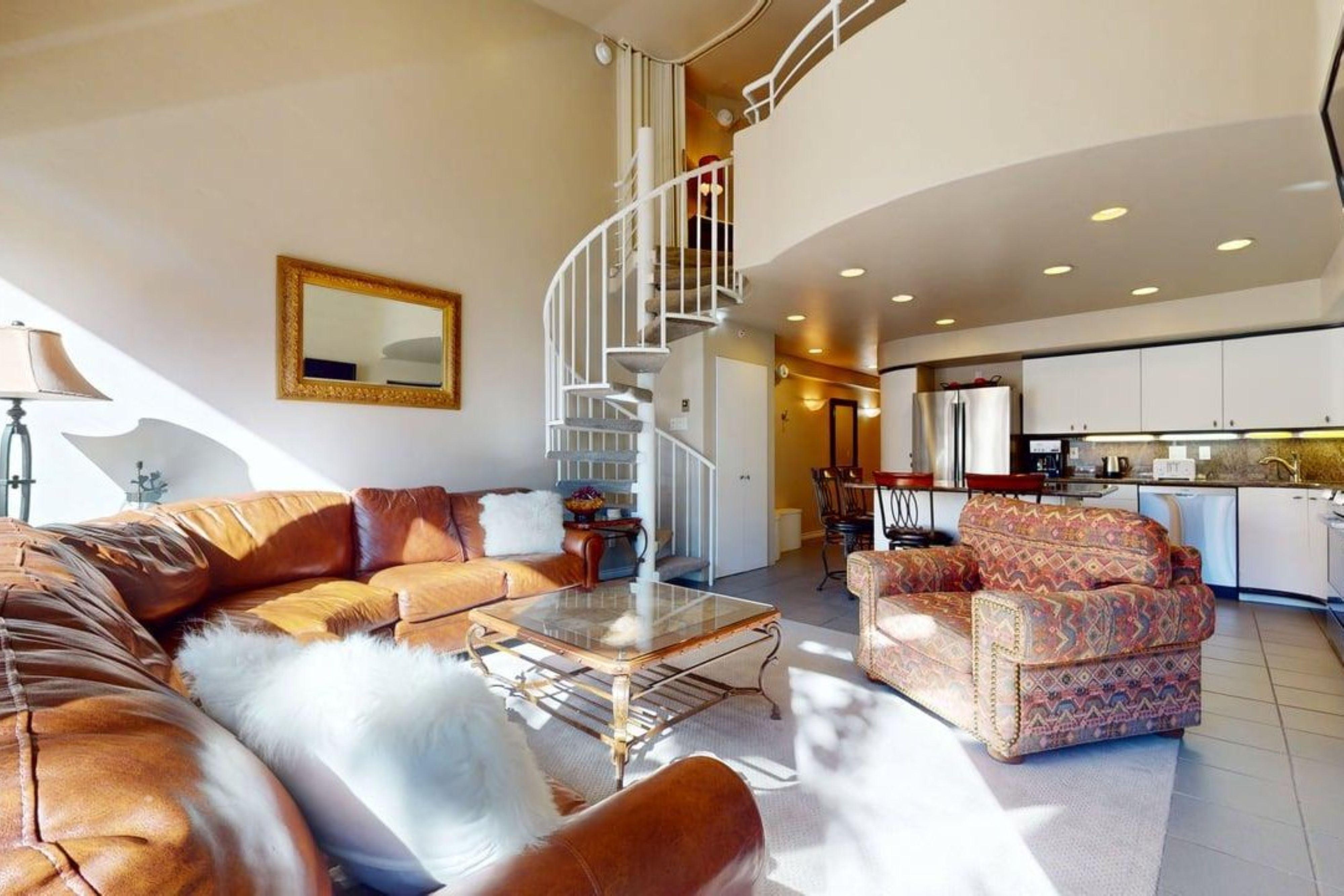 Montaneros in Vail 411 is a spacious 975 sq ft one-bedroom plus loft, two-bathroom condominium located on the 4th floor with partial Vail Mountain views. The master bedroom, situated in the loft space, features a queen bed, additional seating area, and an ensuite bathroom with a jetted tub. The second bedroom has two twin beds with skylights and a connecting bathroom with a shower-tub. The living room offers high vaulted ceilings, large windows with mountain views, and a sofa sleeper. The fully equipped kitchen includes granite countertops and a kitchen island that seats four.