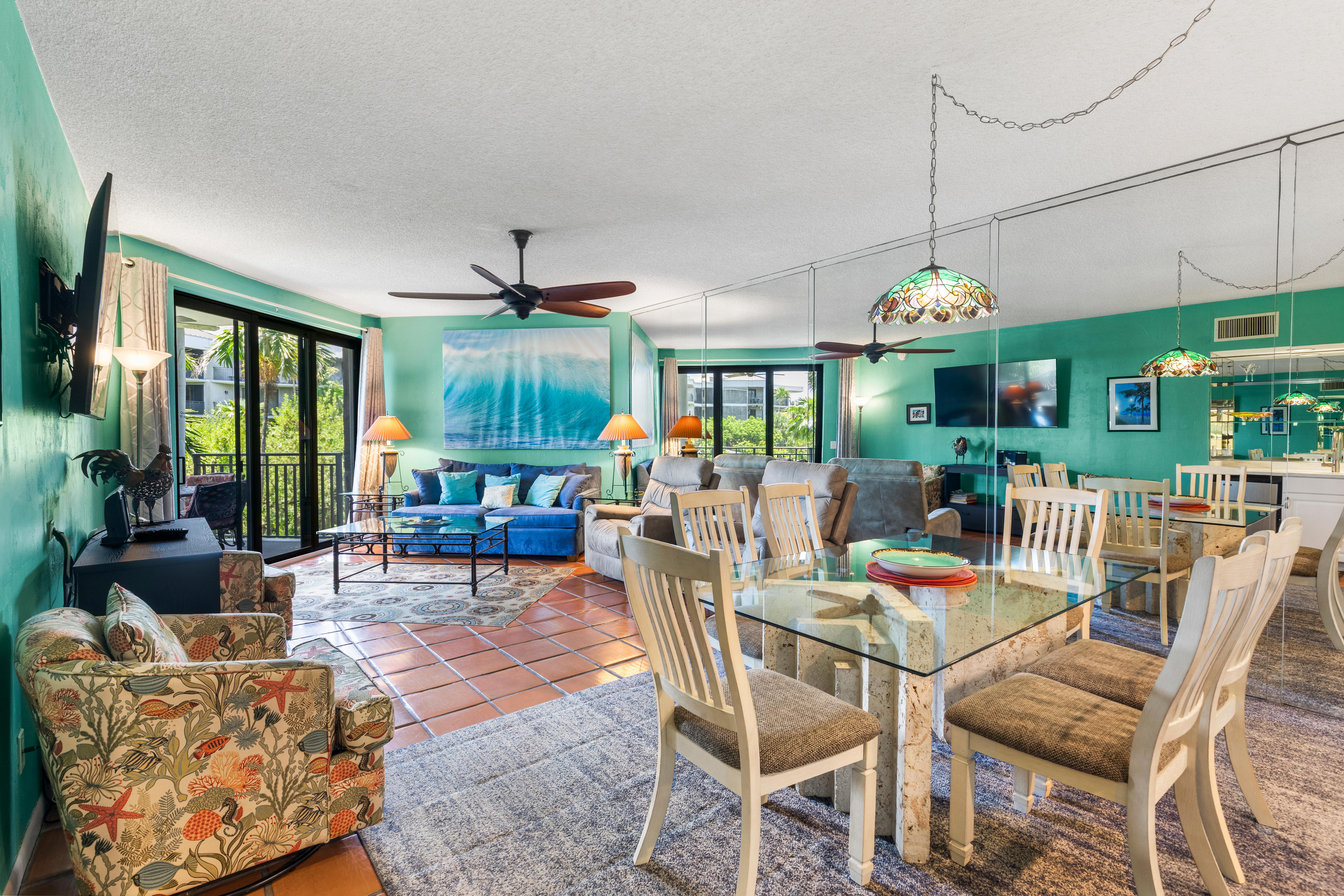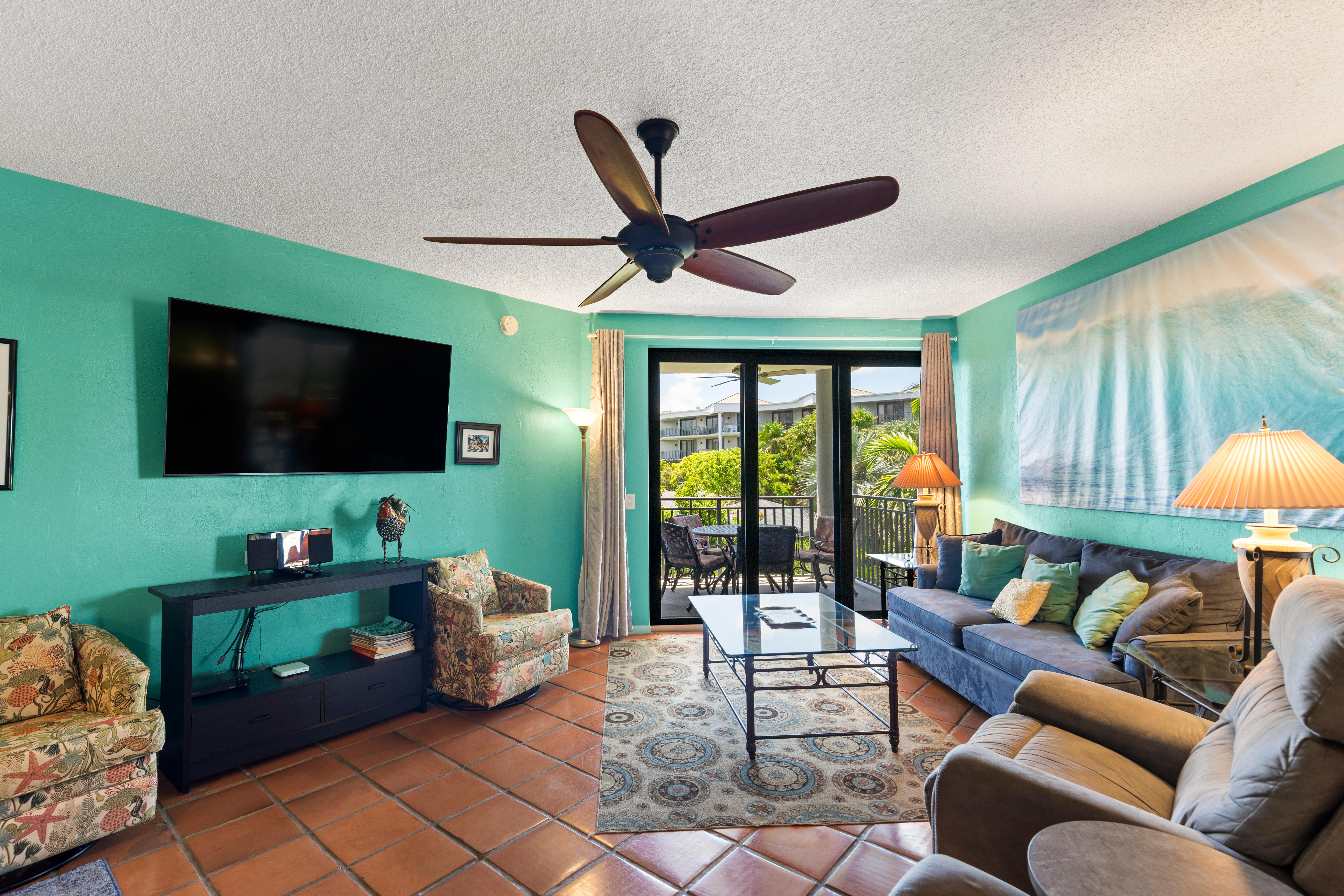 Living Room: Queen-size sleeper sofa, flat-screen TV, balcony views
