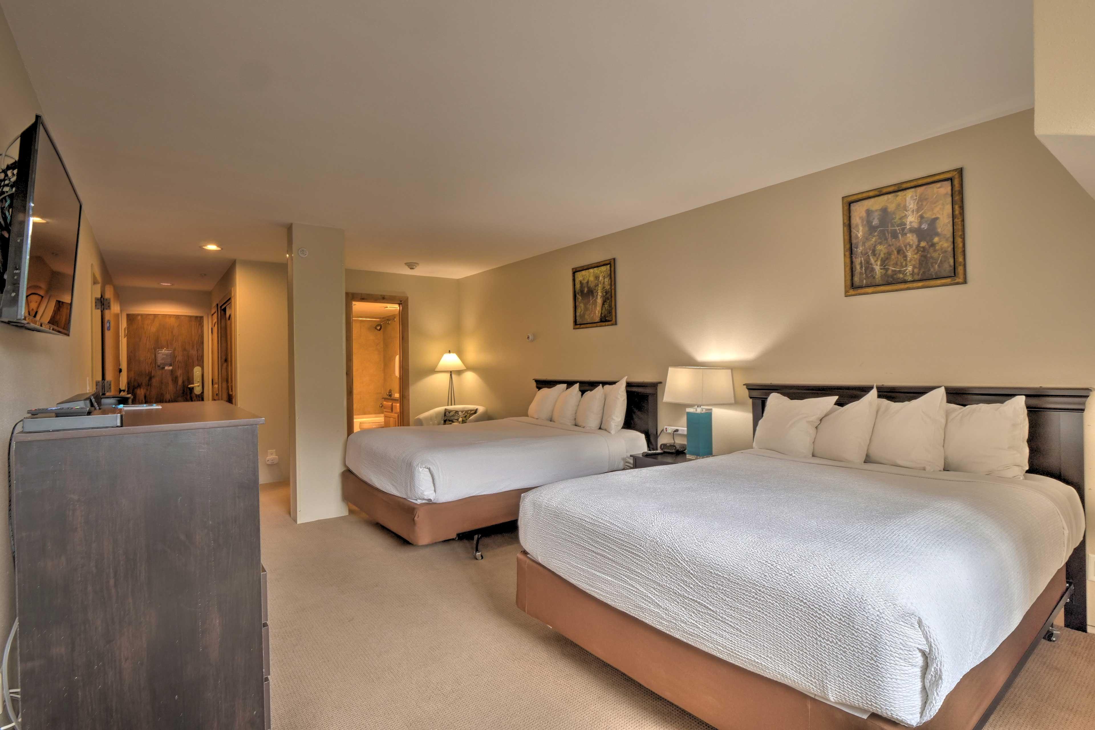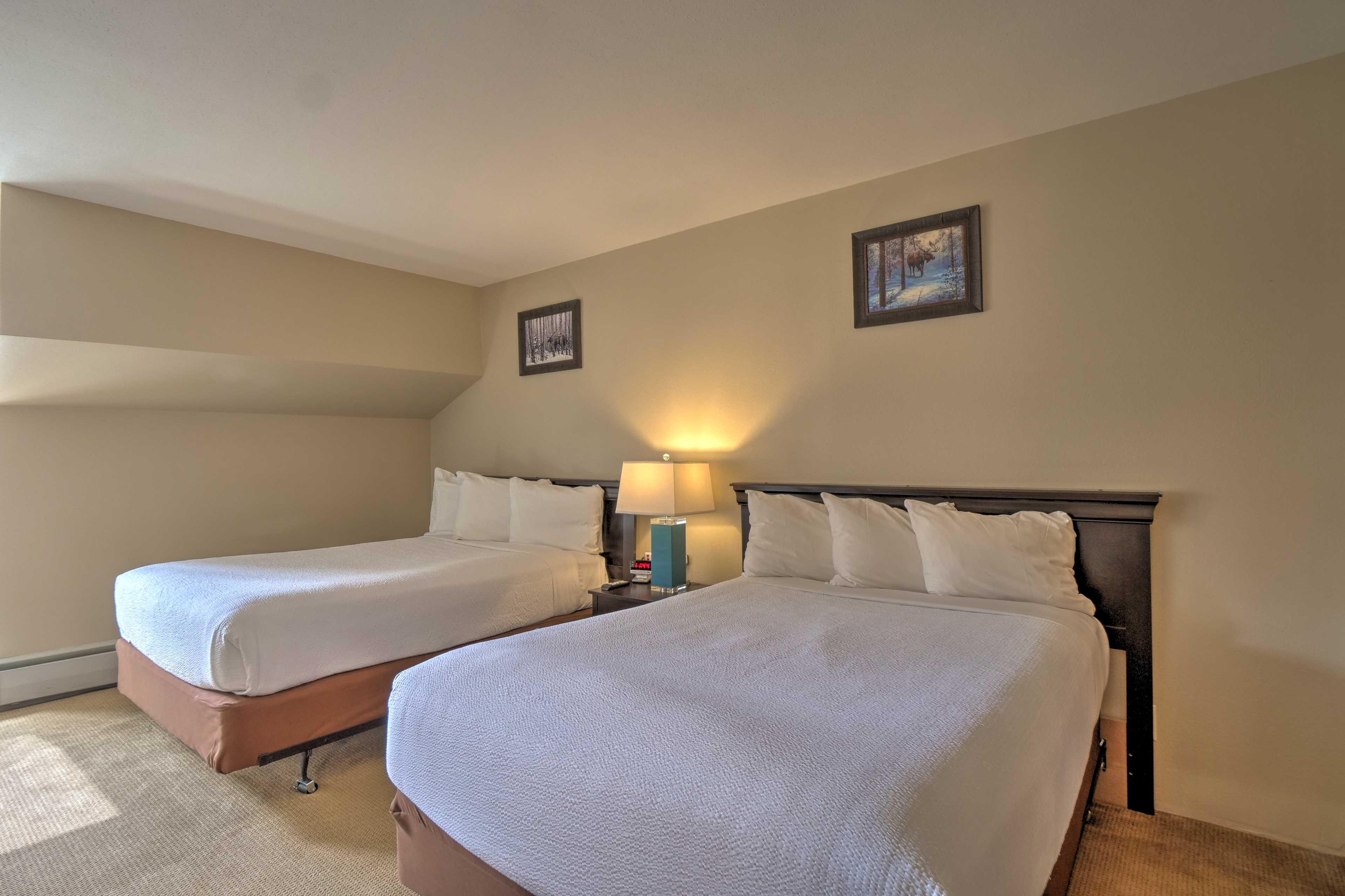 queen beds with an attached bathroom, and the third bedroom has two double