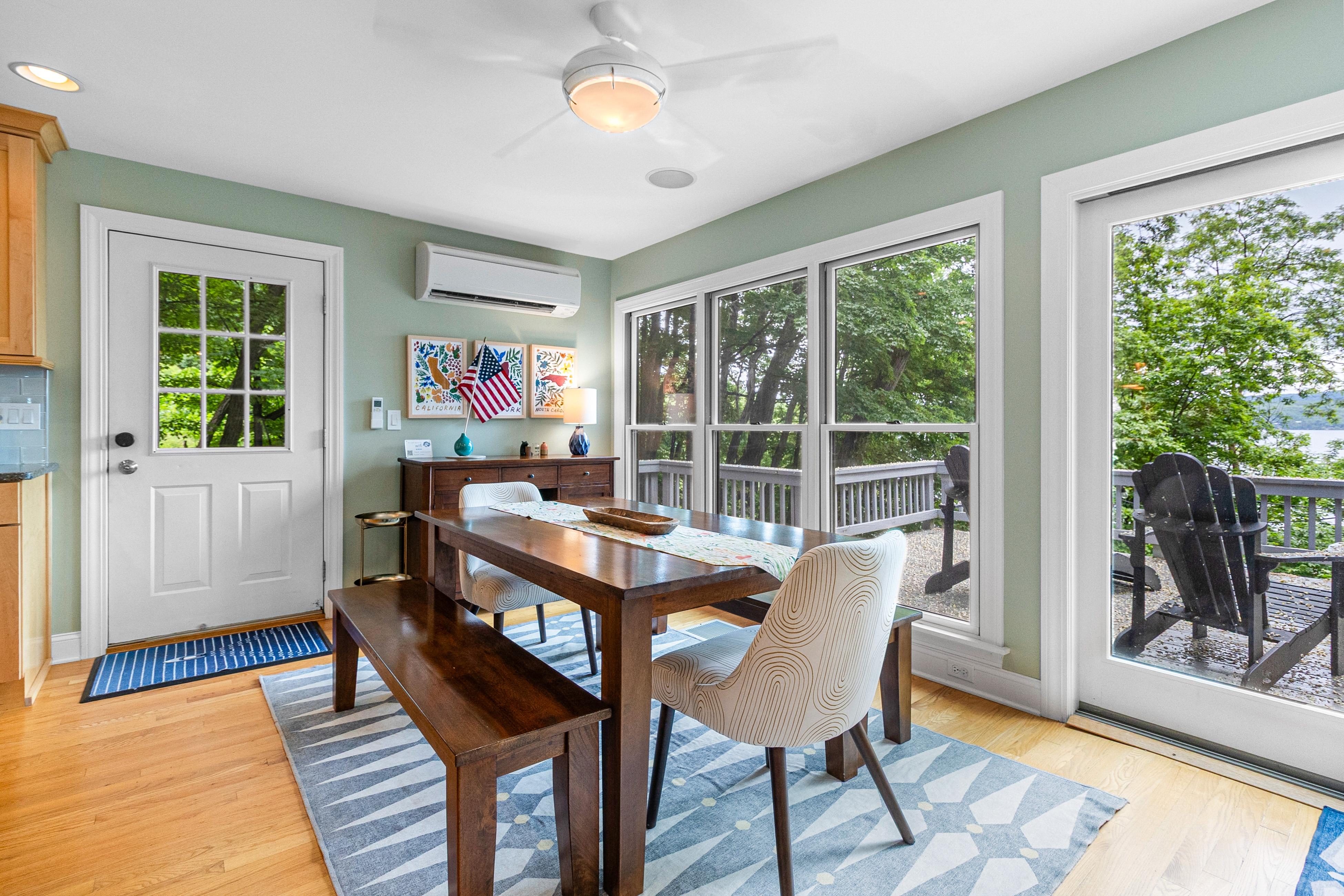 Open up the windows and slider for lake breezes, casual conversation, and family movies in the living room, also furnished with a wood-stove for cozy evening gatherings. The downstairs living area also comes equipped with a TV for flexible entertainment options. If you need to make it a work/play getaway, there's a built-in home office on the main floor landing.