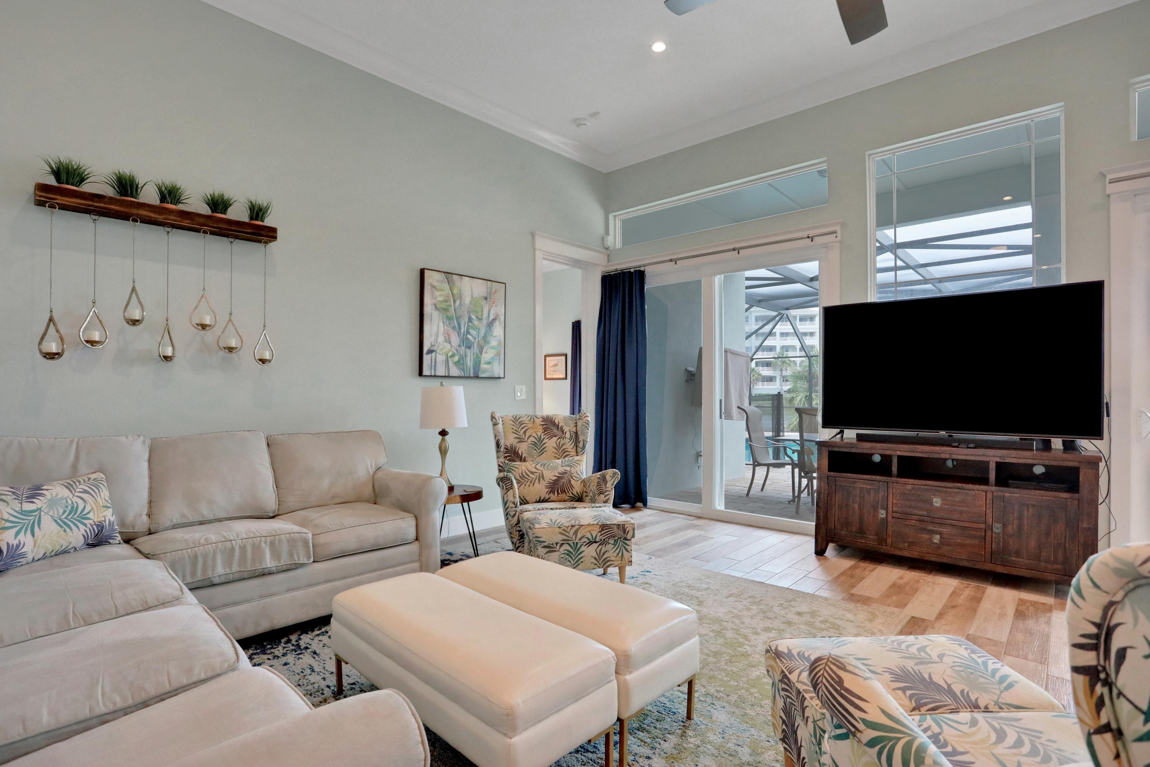 Nestled alongside one of Palm Coast's gleaming waterways, discover Deja Blue. Offering a top-tier vacation experience, this spacious home boasts all of your favorite amenities and then some! From the moment you walk inside, you'll immediately notice the high ceilings, airy layout, and bright coastal charm. The open living room features ample seating and a large smart TV, creating the perfect place for movie nights or casual conversation. Styled with a cheerful nautical theme, the entire home radiates relaxation and elegance. Steps away, the fully equipped kitchen gleams with stainless steel appliances, granite countertops, and a sprawling center island/breakfast bar. Whether you're cooking up a seafood feast or just brewing your morning coffee, this space makes mealtime a breeze. When it's time to gather, enjoy your meals together at the formal dining table inside, or dine alfresco on the sun-soaked lanai while overlooking the pool. With five spacious bedrooms, everyone in your group will have a comfortable place to recharge. The primary suite offers private pool access, a smart TV, and a spa-like en suite bathroom complete with a jetted tub, tiled walk-in shower, and a large vanity. The additional bedrooms are just as inviting, featuring soft linens, cheerful décor, and central air. A cozy family room, a full laundry room, and a collection of board games round out the thoughtful interior touches. The true centerpiece of Deja Blue is the enclosed lanai and turquoise pool. Relax in the shade, take a refreshing dip, or fire up the gas grill for an afternoon barbecue. Ample seating makes it easy for the whole family to gather, and a pool fence provides peace of mind for families traveling with little ones. Why You'll Love It • Private pool with a screened lanai and plenty of seating • Stylish, spacious interior with multiple gathering spaces • Family-friendly amenities including board games and a pool fence • A peaceful waterfront setting just minutes from beaches, golf, dining, and shopping • Access to the nearby clubhouse featuring a lakeside pool and relaxing hot tub Things to Do Nearby • Bing's Landing (6 miles): A charming park with fishing, boat ramps, and a beloved local BBQ spot. • Palm Harbor Golf Club (6 miles): Play a round on this beautifully maintained public course. • Washington Oaks Gardens State Park (10 miles): Explore lush gardens, unique coquina rock beaches, and scenic walking trails. • Flagler Beach (12 miles): Stroll the pier, enjoy oceanfront dining, and soak up the sun on sandy shores. • European Village (5 miles): Shop, dine, or enjoy live entertainment in this quaint marketplace. Whether you're seeking lazy days by the pool, memorable family meals, or adventures around Palm Coast, Deja Blue offers the perfect balance of comfort, convenience, and coastal beauty. Things to Know