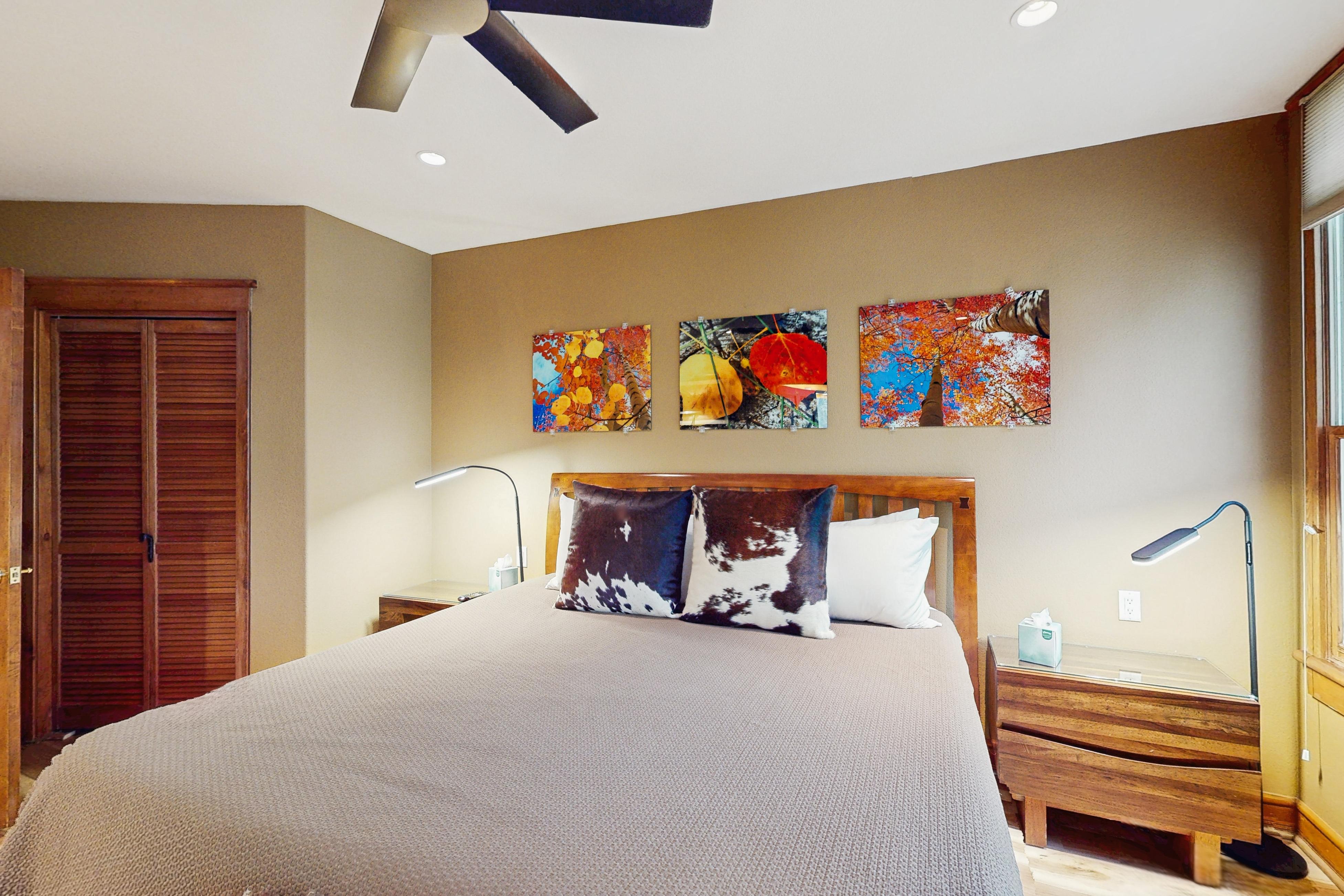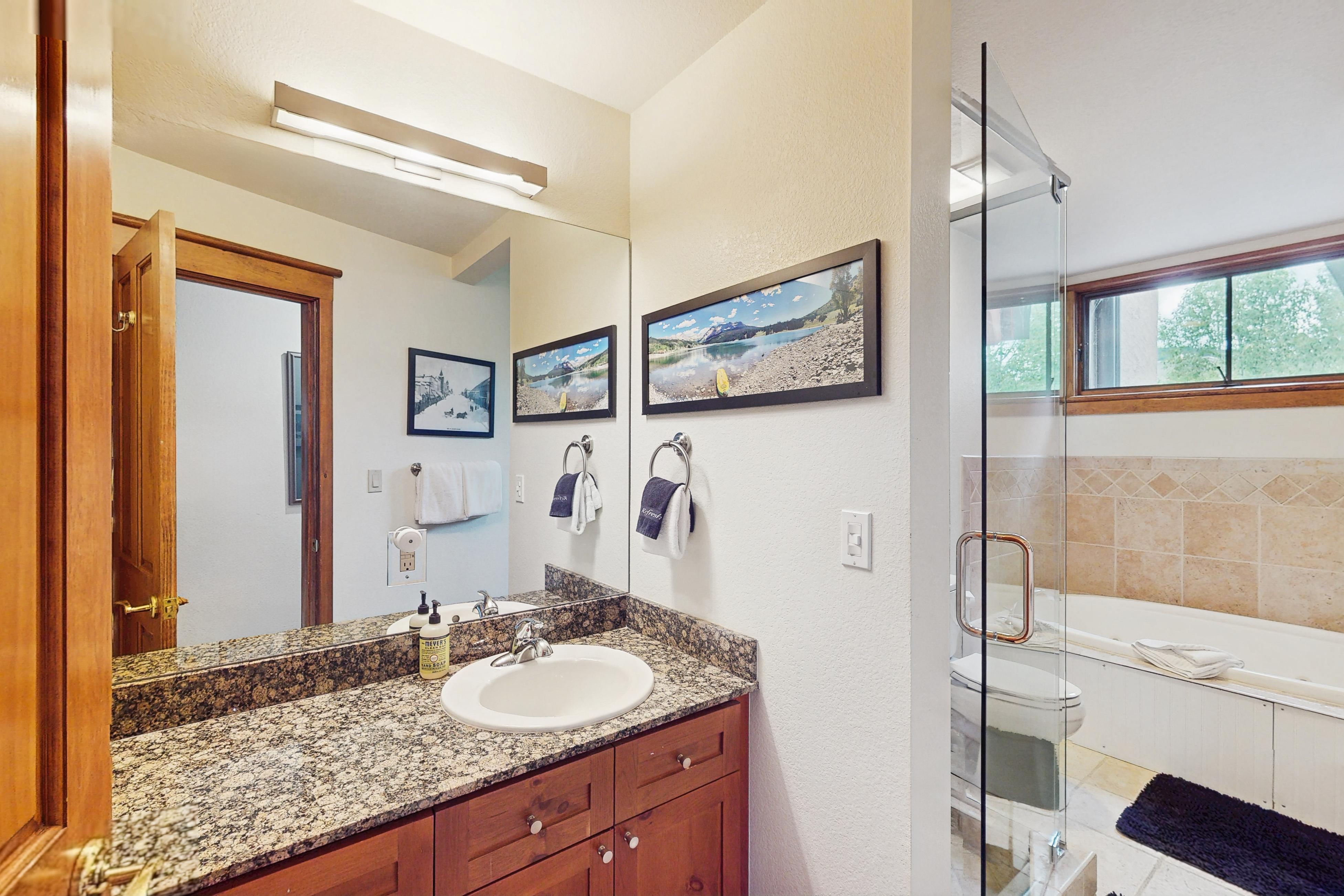 When you walk into this 4th-floor penthouse, prepare to be “wow'd” by the tall ceilings along with bright, open, and massive panoramic windows in the large open living area. You will quickly realize that this is not your average boxy condo unit. In the winter months, you can gaze southwest at the iconic 14,000 ft. Mt Wilson peak from the living room and cozy balcony. Enjoy year-round northern views of the nearly 11,000 and 12,000 ft. peaks of Grey Head and Whipple Mountain from the dining room table and bedrooms. Enjoy your mornings and evenings gathering with friends and family around the beautiful stone gas fireplace watching movies on the TV, while easily preparing meals in the well-appointed open kitchen. WiFi and cell service here are both excellent. At the end of your active day enjoying Telluride, enjoy a warm soak in the large 2-person, non-jetted bathroom tub.