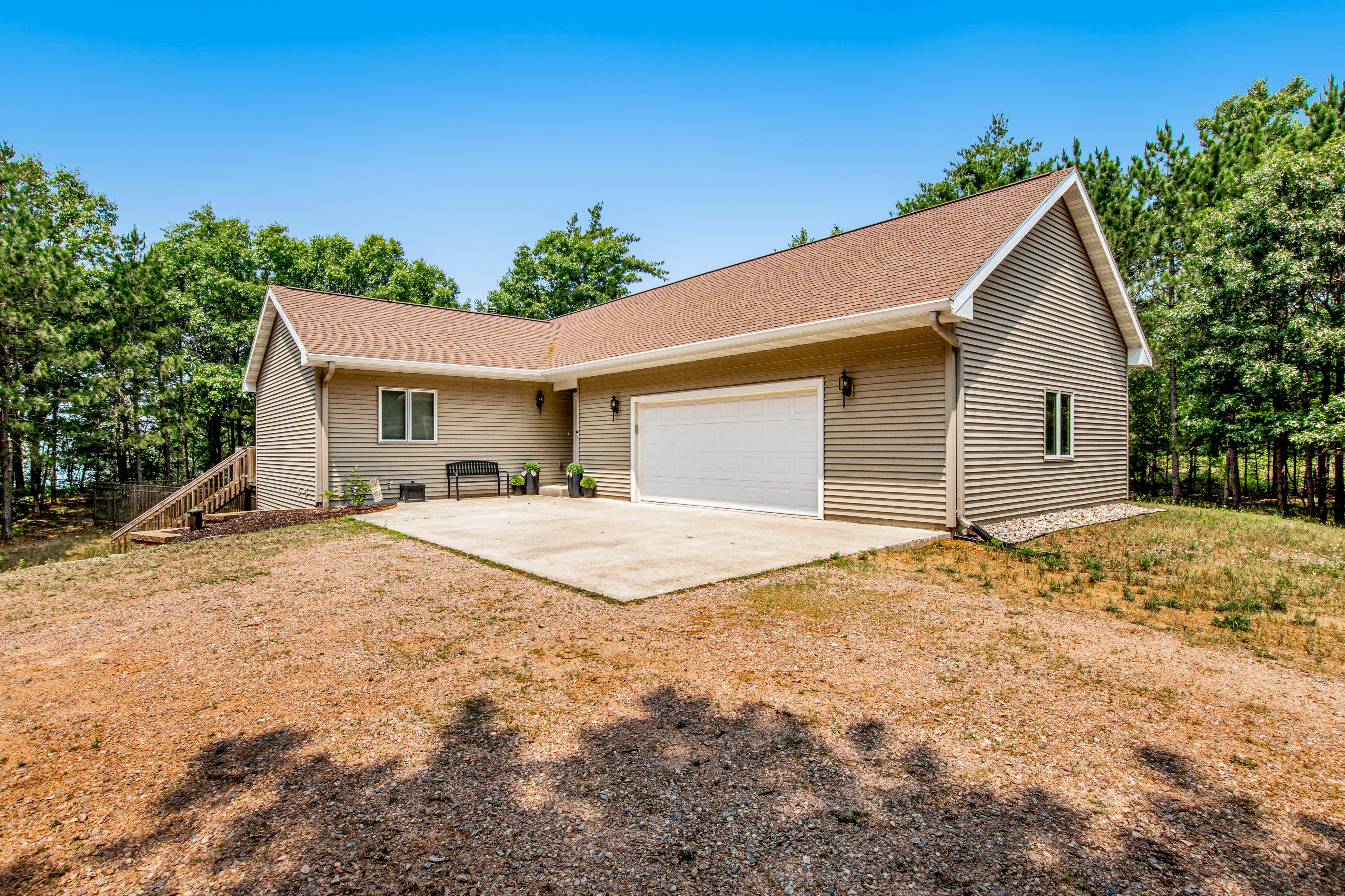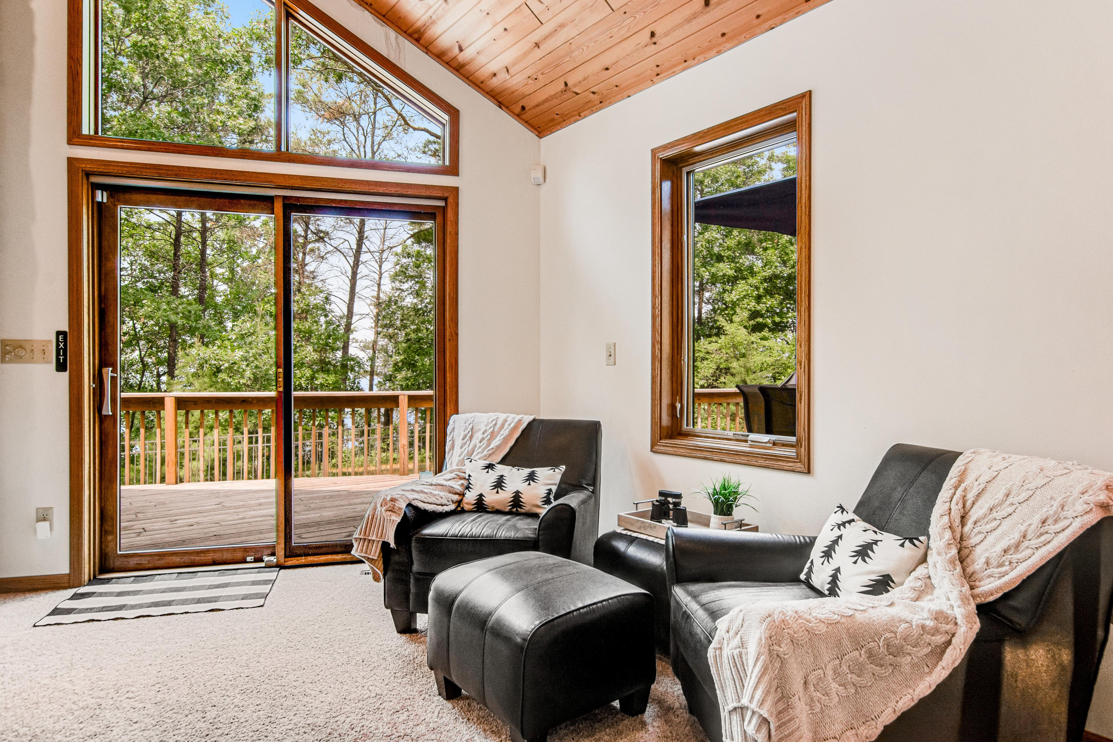 This spacious home feels like your own personal tree house in the woods surrounded by pines overlooking Petenwell Lake. While the property does not walk out to the water, you can access a shared pier to enjoy the sandy-bottom lake – it’s a short walk from the deck (lake access requires use of stairs).