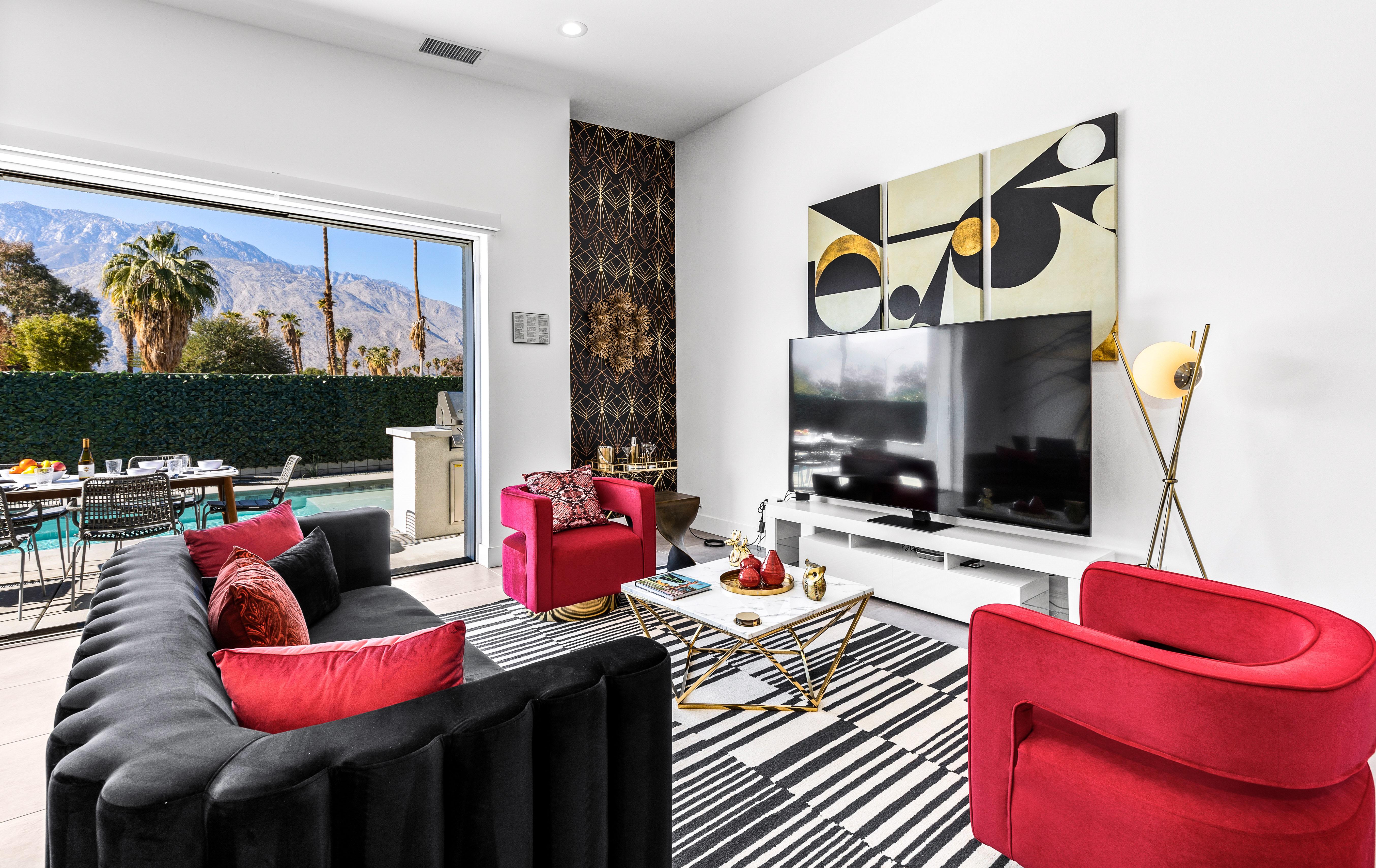 Palm Springs has a new work of art & we are thrilled to say it is this home. You are immediately greeted with a custom work of art as you walk into the foyer & head into the living space. The luxe living area is the perfect backdrop to sip on a handcrafted beverage compliments of the bar cart, gather with your friends & family in one of the regal velvety chairs or take it easy while watching one of your favorite shows on the Smart TV.