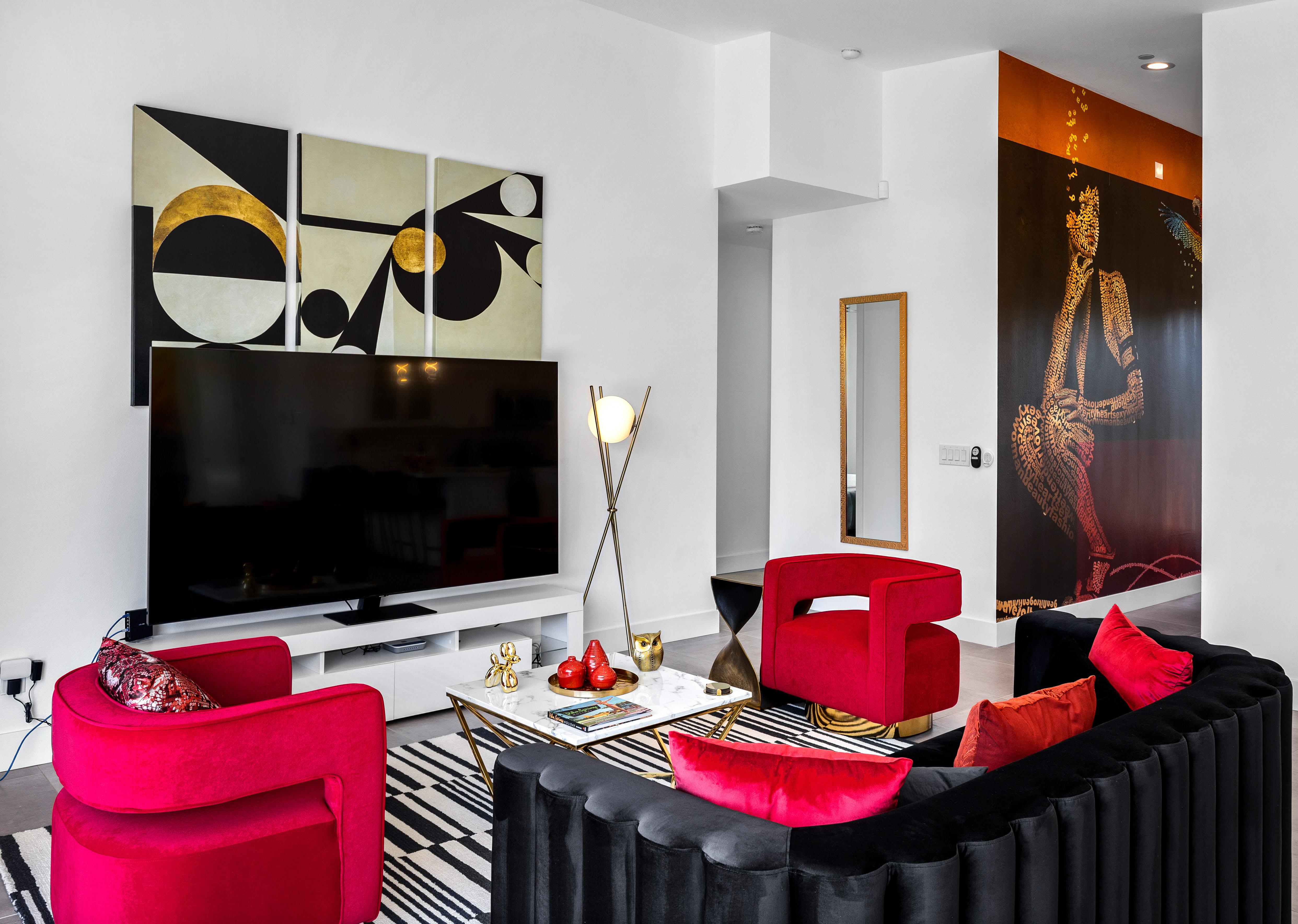 Each guest is guaranteed to have a unique & luxurious place to retreat at the end of the day with 3 bedrooms, each with their own en suite. In the primary, bedroom, adjacent to the dining room & kitchen, you will find a vibrant mid-century modern design with an opulent king-sized bed as the centerpiece of the room complete with a retro headboard & hotel-quality linens & pillows. You will not be in short supply of sunshine lighting up the room when the shades are not lowered with several windows and a private entrance to the back patio through sliding glass doors. As you doze off to sleep in the evenings choose a movie of choice to watch on your mounted smart TV. Getting ready in the morning has never been easier with a private ensuite bathroom with an invigorating tranquil stand-up shower featuring an added handheld shower head, dual vanities, plush towels & a separate water closet.