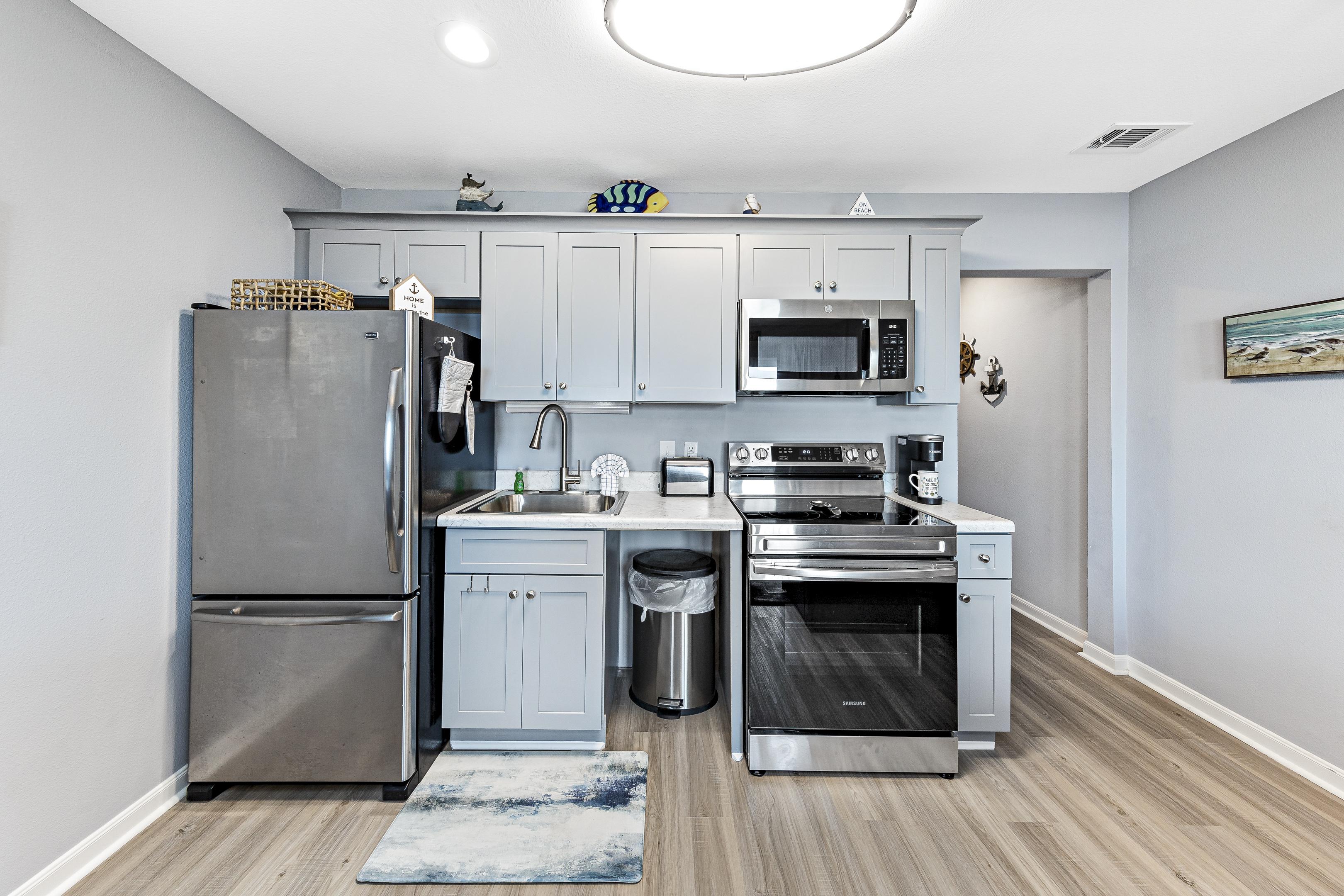 • This condo is equipped with a refrigerator, stove, oven, microwave, coffee maker, blender, toaster, and all dishes and silverware