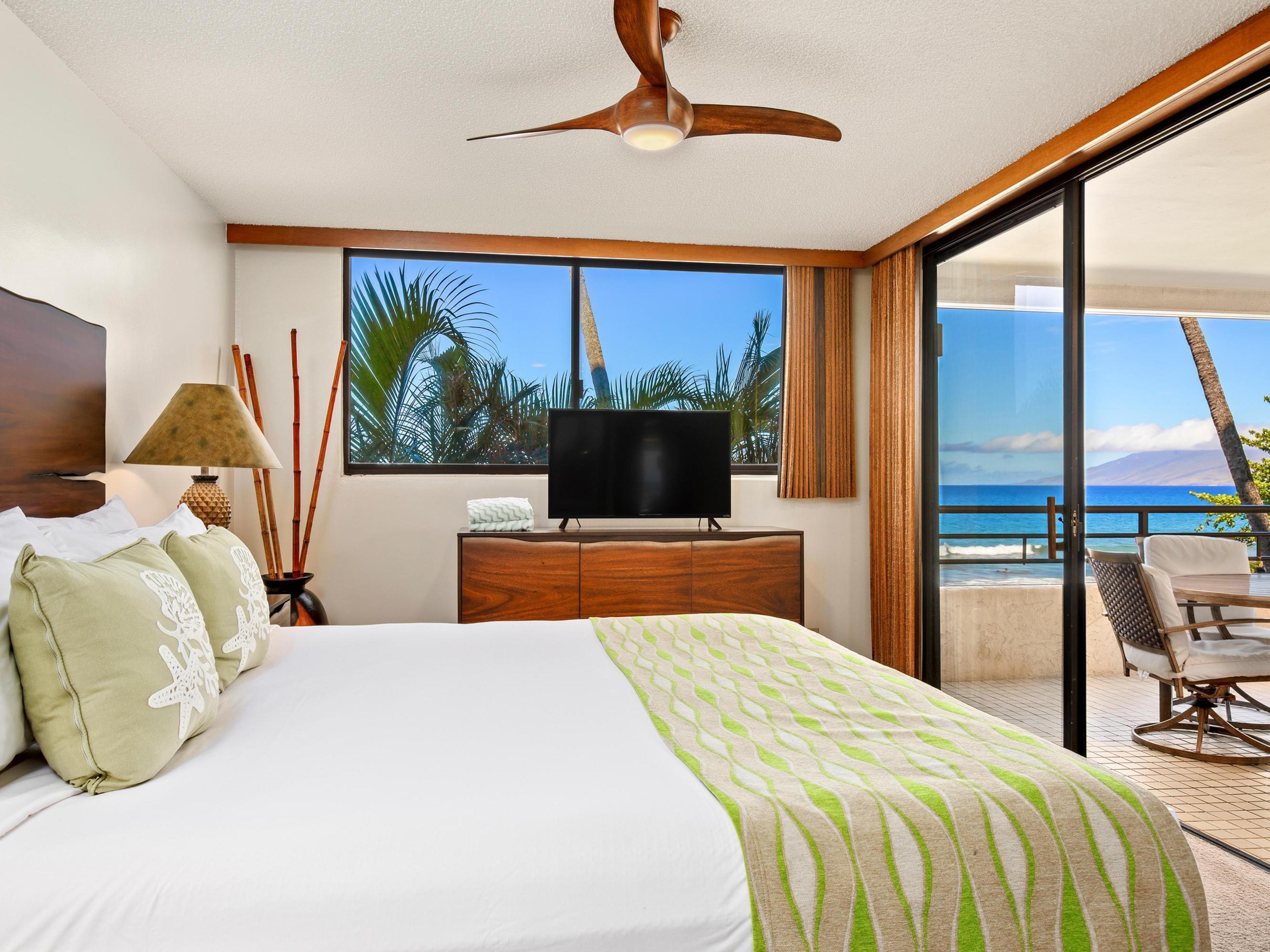 The open-plan living area seamlessly flows into a fully-equipped kitchen, perfect for preparing meals with the provided dishes, silverware, and modern appliances including a refrigerator, microwave, and oven. The private outdoor balcony offers breathtaking oceanfront views, making it the ideal spot to unwind with a morning coffee or an evening cocktail.