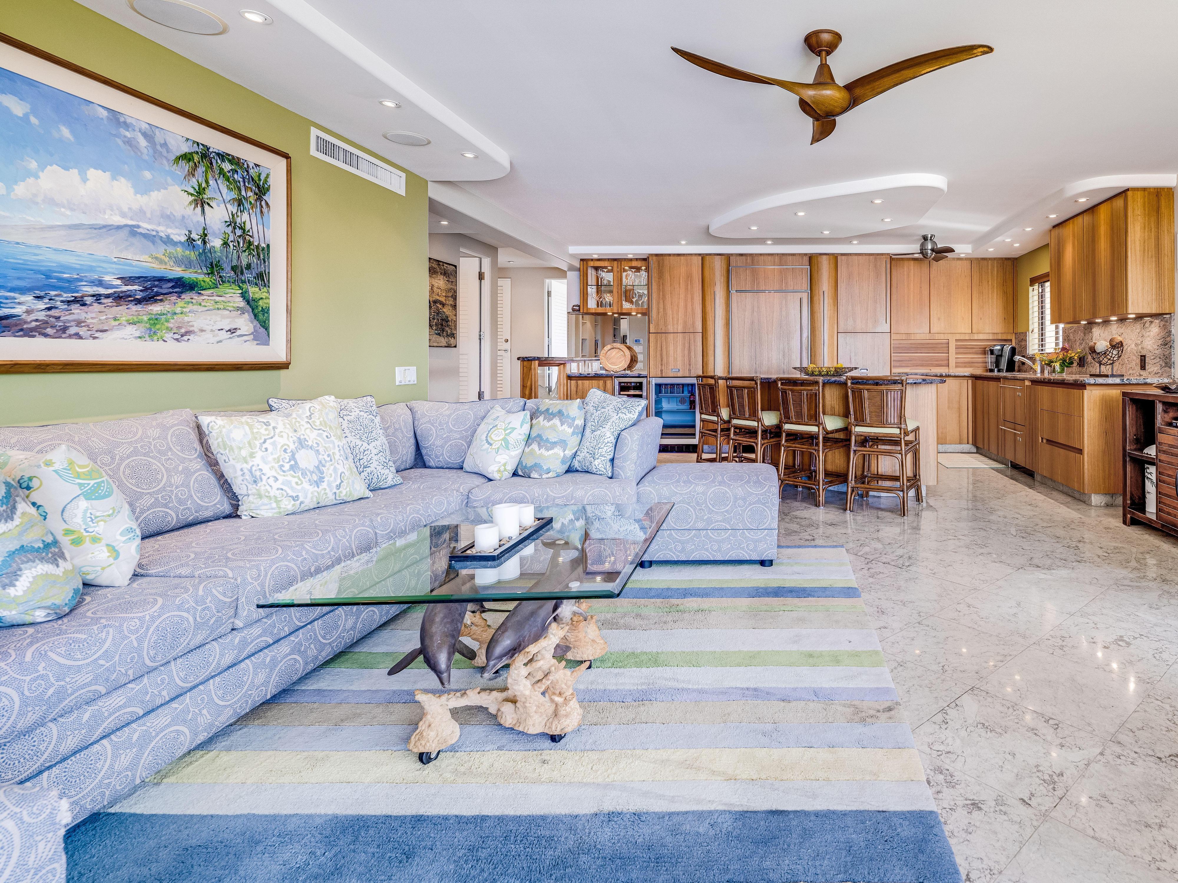 Welcome to the serene Polo Beach Club 301, your perfect oceanfront retreat nestled in the heart of Wailea. This stunning 2-bedroom, 2-bathroom condo offers a luxurious escape for up to six guests. Step inside to discover a thoughtfully designed living space, complete with a cozy sofa bed for additional guests. The master bedroom features a plush king bed, while the second bedroom offers a comfortable queen bed, ensuring a restful night's sleep for everyone.