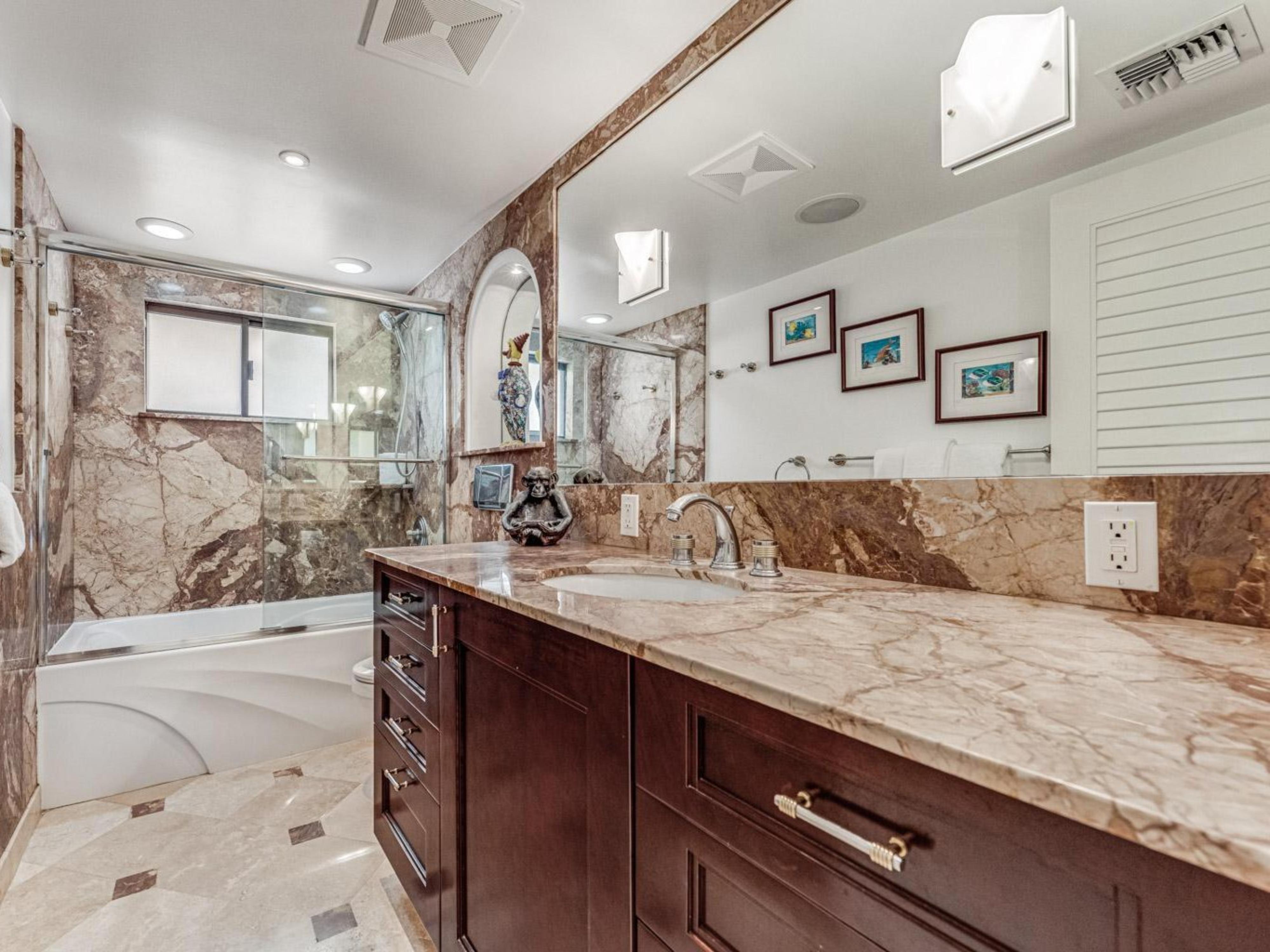 Both bedrooms are beautifully appointed, with the master bedroom featuring a king bed and the second bedroom offering two twin beds. Each bathroom is elegantly designed with premium fixtures and a bathtub for your relaxation.