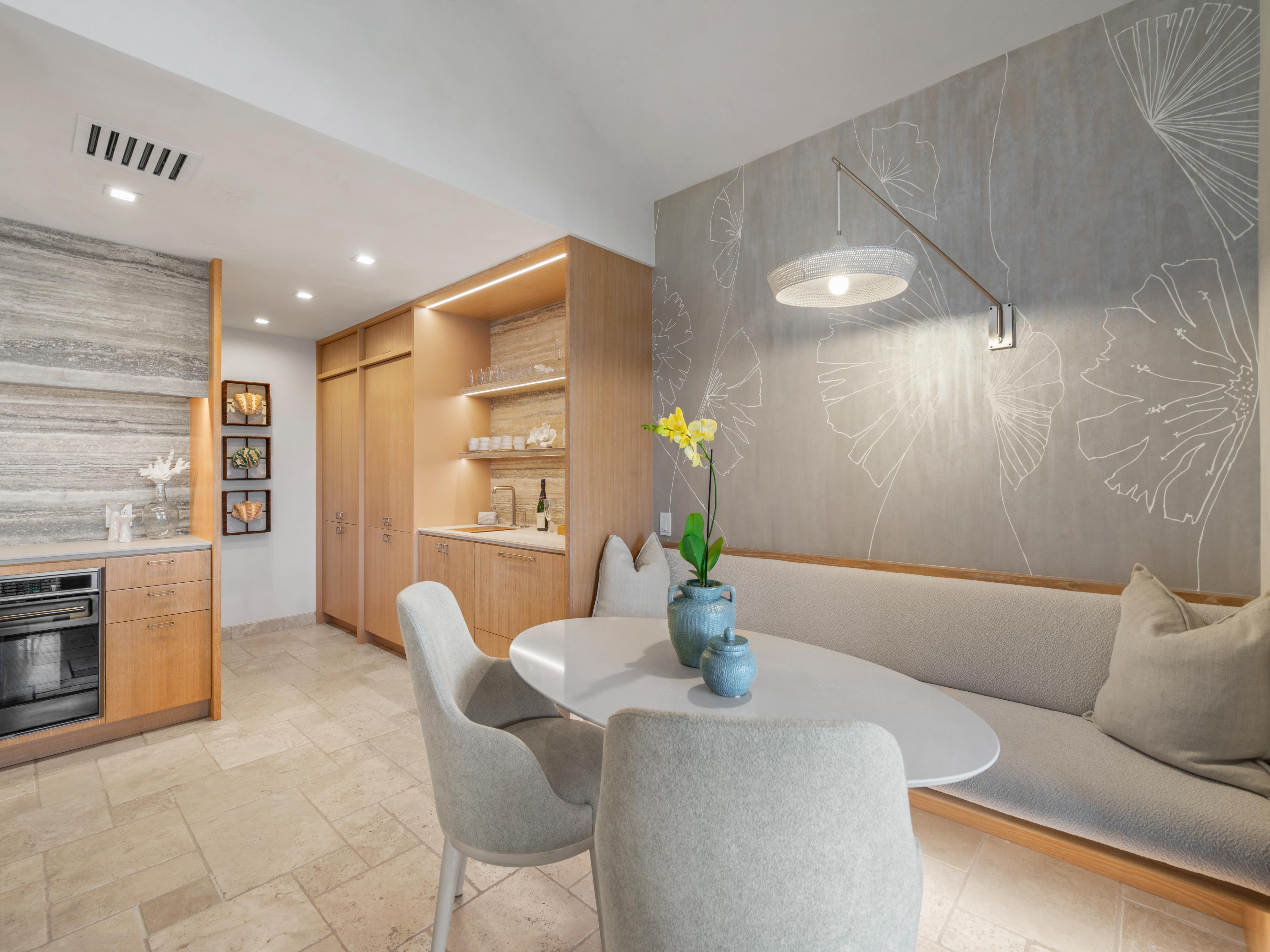 The completely remodeled kitchen is highlighted by a dramatic granite slab backsplash, three sperate stovetops, a hidden refrigerator, custom blonde cabinetry, a built-in wet bar and a dining nook complete with restaurant-style bench seating. The extended kitchen island countertop is ideal for socializing around for morning breakfast or afternoon fruit smoothies.