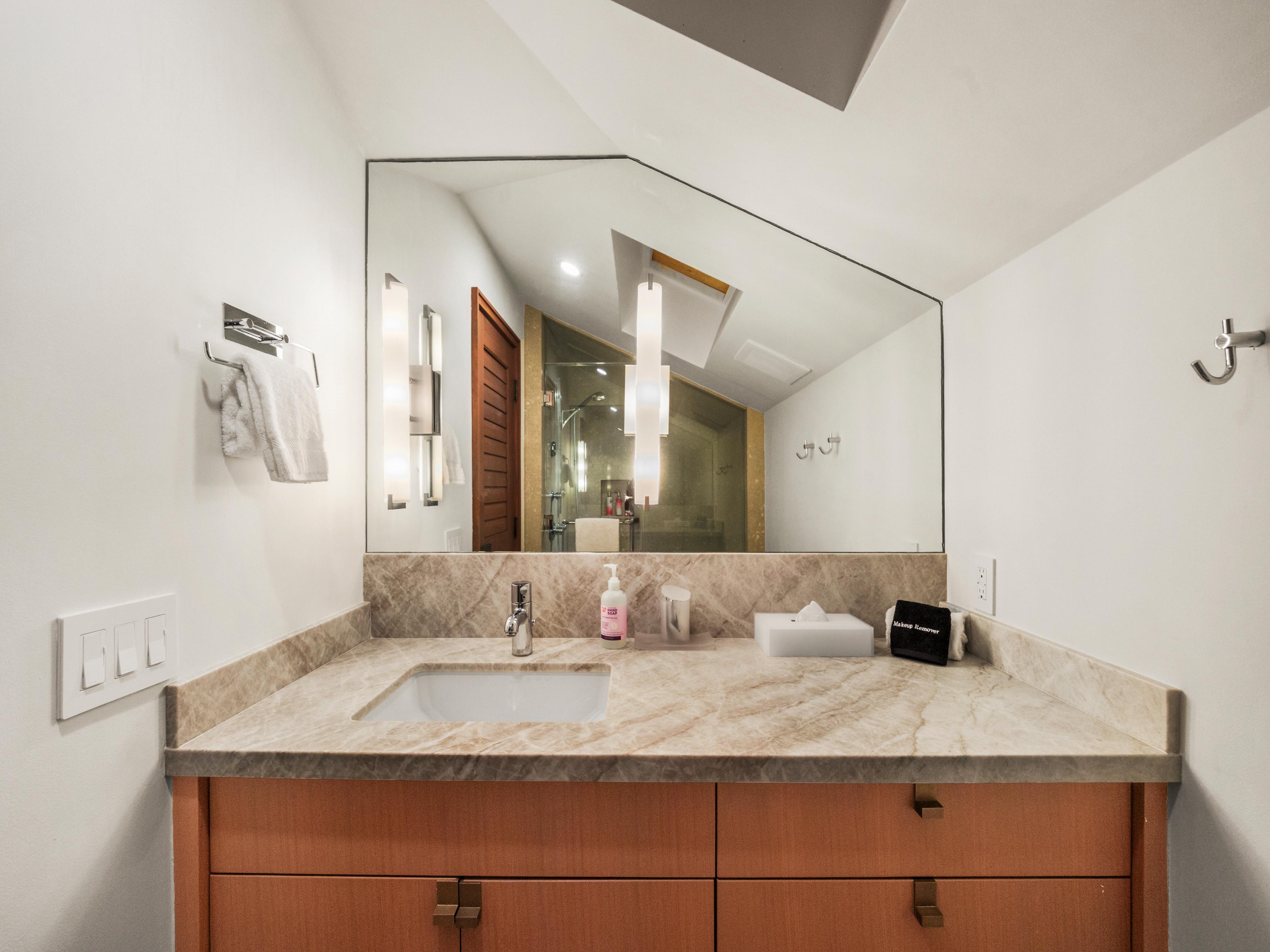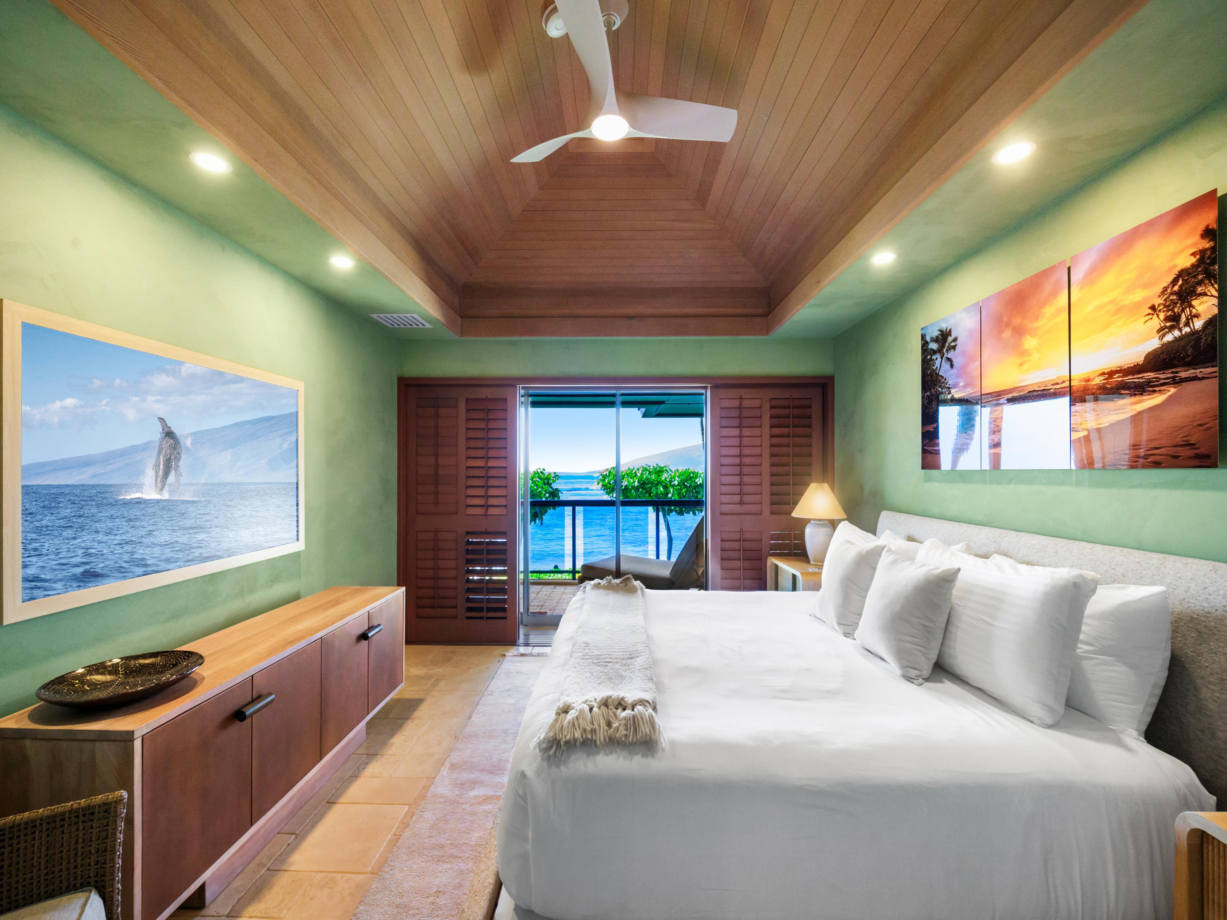 The primary bedroom has a comfortable king bed along with custom-built en-suite bathroom featuring dual vanities and an extended walk-in shower with multiple shower heads. Wake up each morning with views of the ocean and access the lanai from private sliding glass doors.