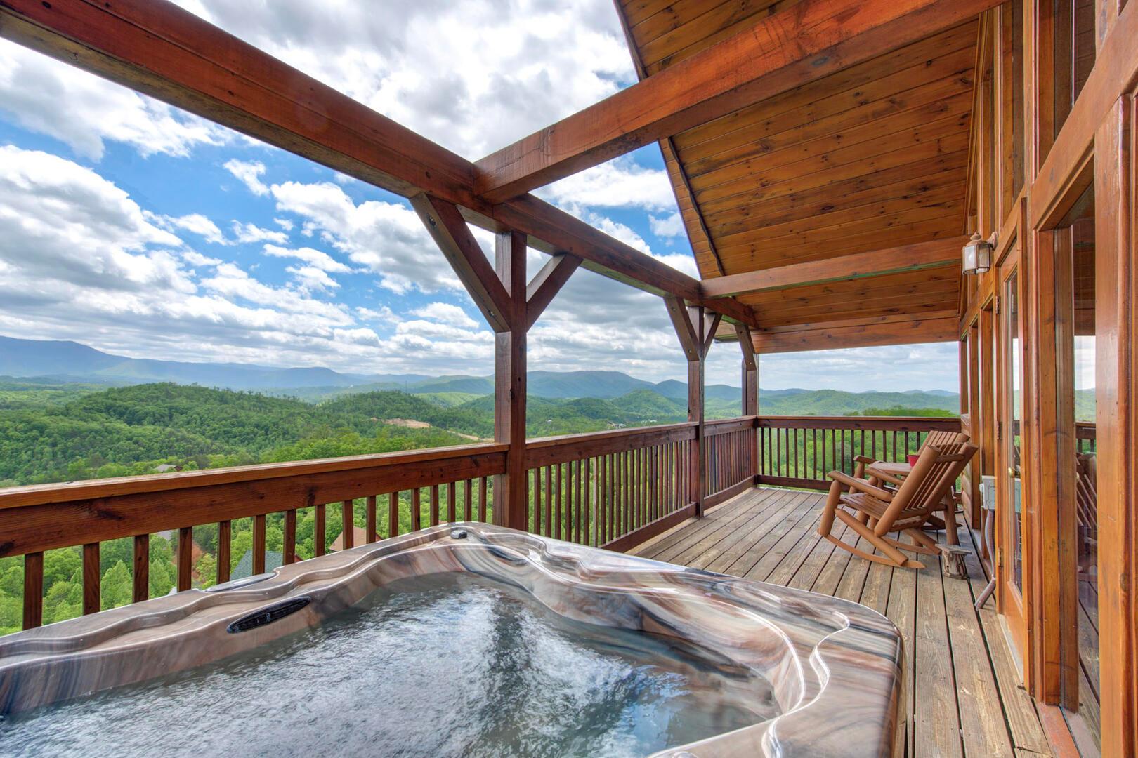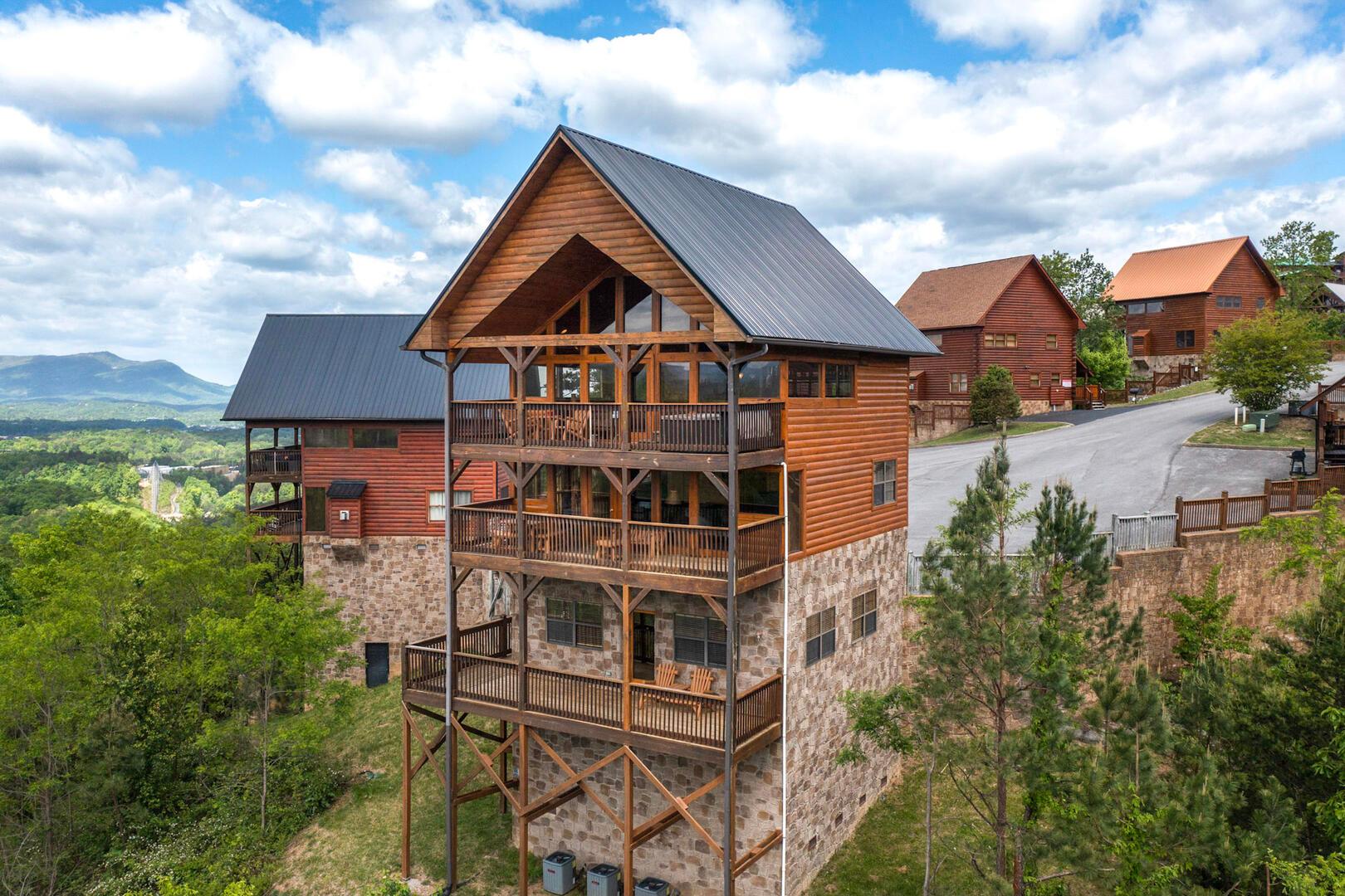 Rejuvenation is a beautiful two-bedroom cabin in Starr Crest Resort. This log home provides spectacular 180-degree views of the Smoky Mountains. Rejuvenation sleeps 10 guests with two king beds, two queen sleeper sofas, one day bed with trundle and three bathrooms. Rejuvenation lives up to its name by providing guests with a tranquil retreat to rejuvenate and relax. Guests can enjoy the beautiful mountain views from the comfort of the living room through the large picture windows. The living room is furnished with a beautiful stone fireplace, large flat screen TV and comfortable seating. The fully-furnished kitchen is equipped with everything families need to create home-cooked meals to enjoy at the dining room table. Kids and adults alike will spend hours in the game room with the pool table, air hockey table and video arcade system with 48 games. Rejuvenation is only 5.5 miles from Dollywood theme park and Dollywood's Splash Country water park. Also, this cabin is only minutes away from other area attractions in Pigeon Forge and Gatlinburg.