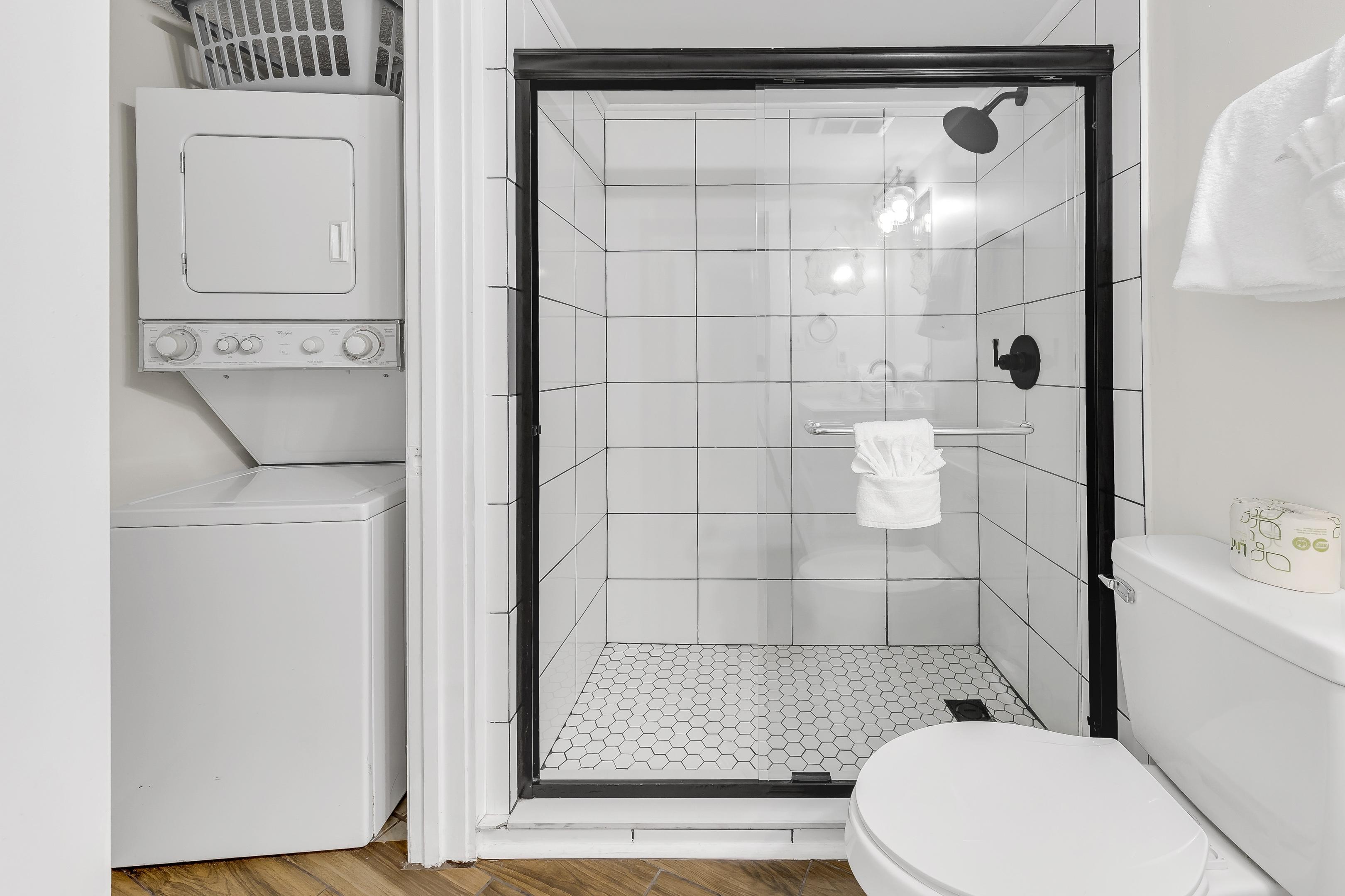 The master bedroom has a king bed and its own private bathroom. The second bedroom has one full bed and the third room has two full beds; both of these rooms share a bathroom. There is also a sleeper sofa in the living room. There is plenty of space for 10 guests in this spacious condo.