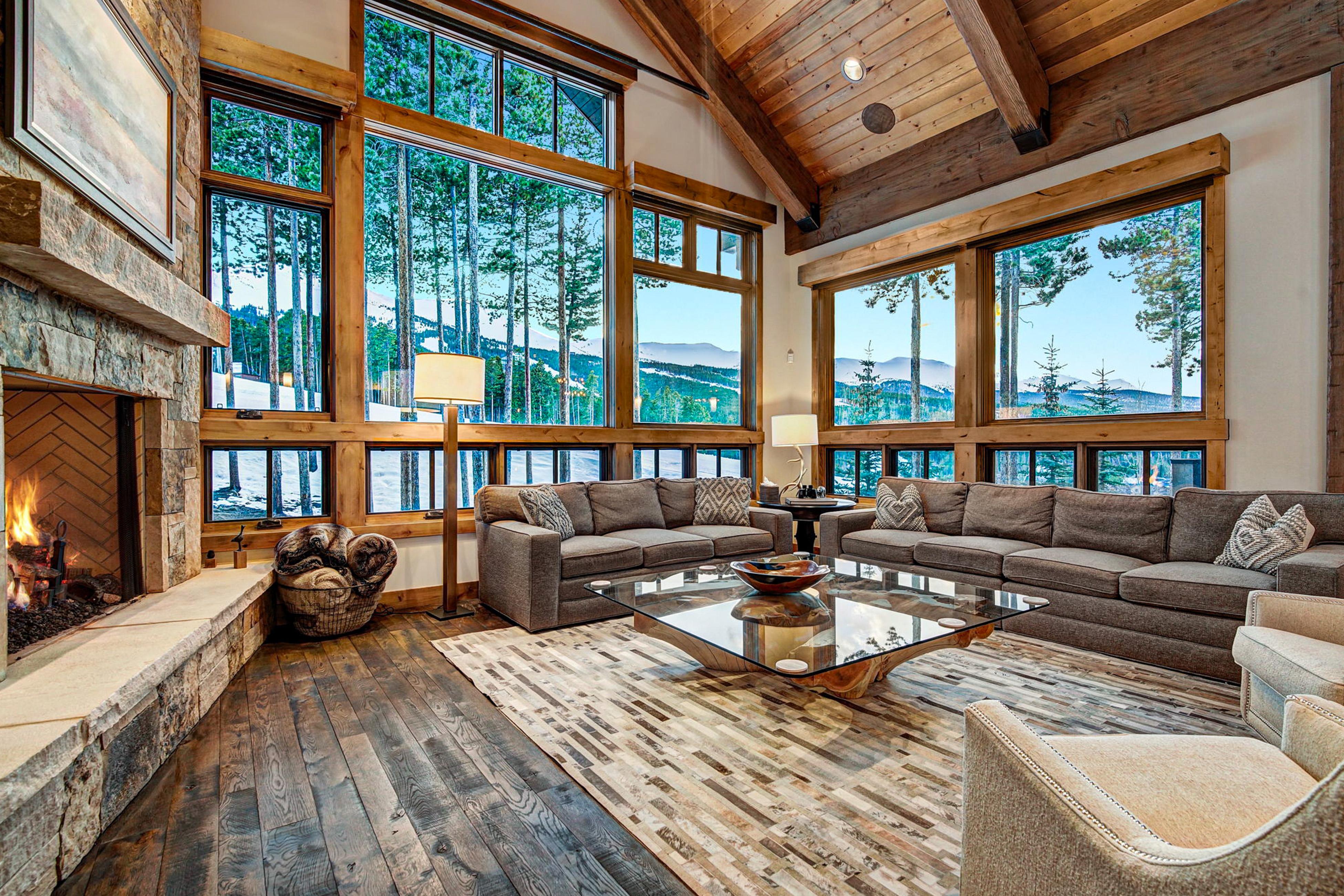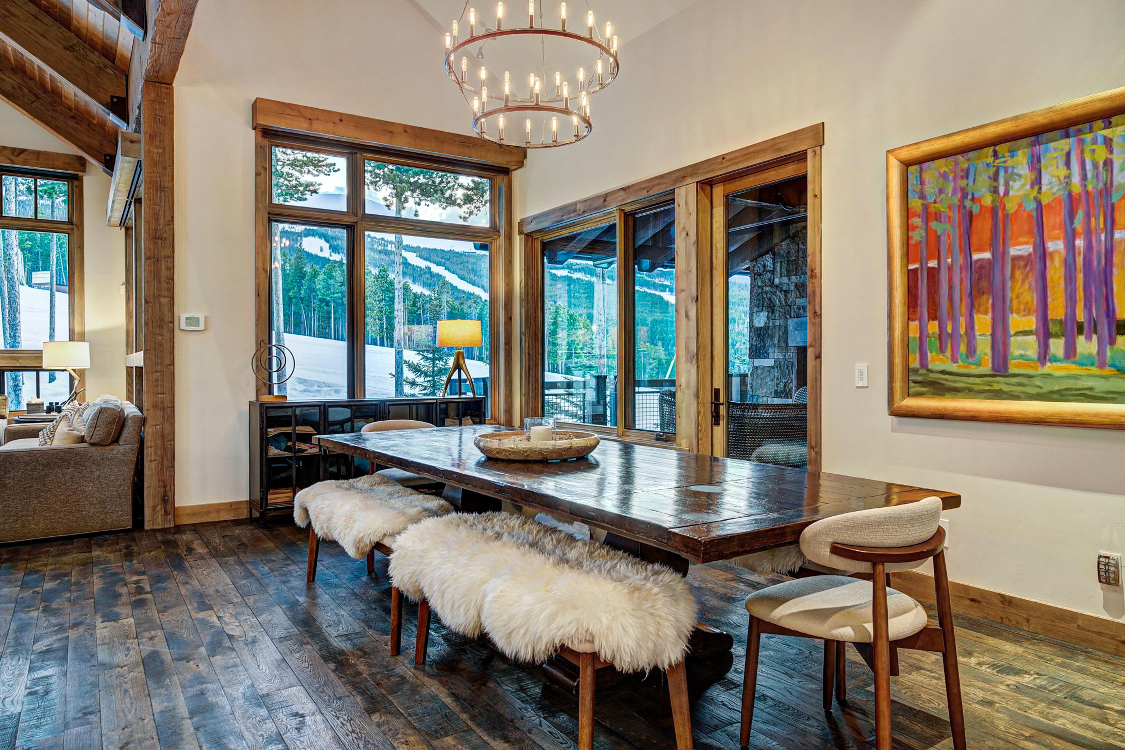 The Great Room combines an oversized living area with a gourmet kitchen, breakfast nook for 6, and a 10-person dining area with picture windows overlooking Breckenridge Resort, Trygve’s Run, and the Ten Mile Range.