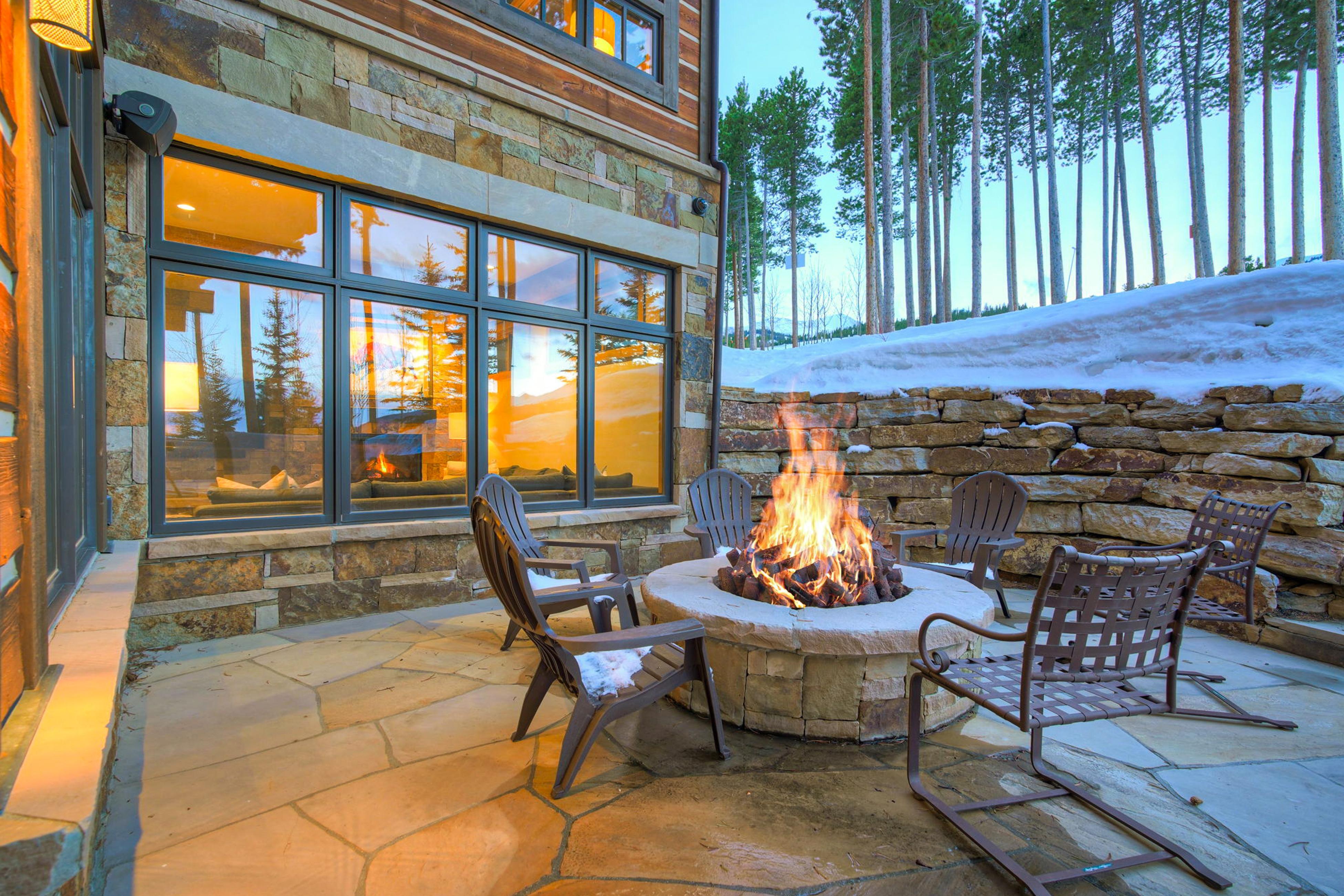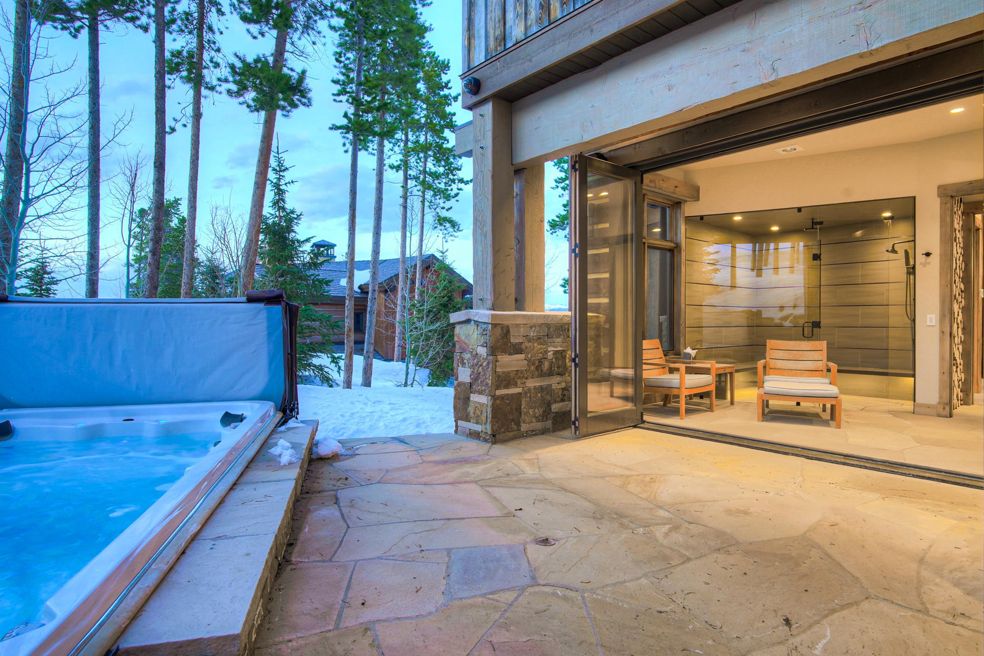 Skiers love to defrost here: there’s a towel warming drawer by the hot tub, heated toilet seats, radiant heated floors, a heated driveway and patio, built-in Miele coffee maker, massive steam room, boot/glove warmers, two outdoor gas fire pits, and the only hot tub on the ski run.