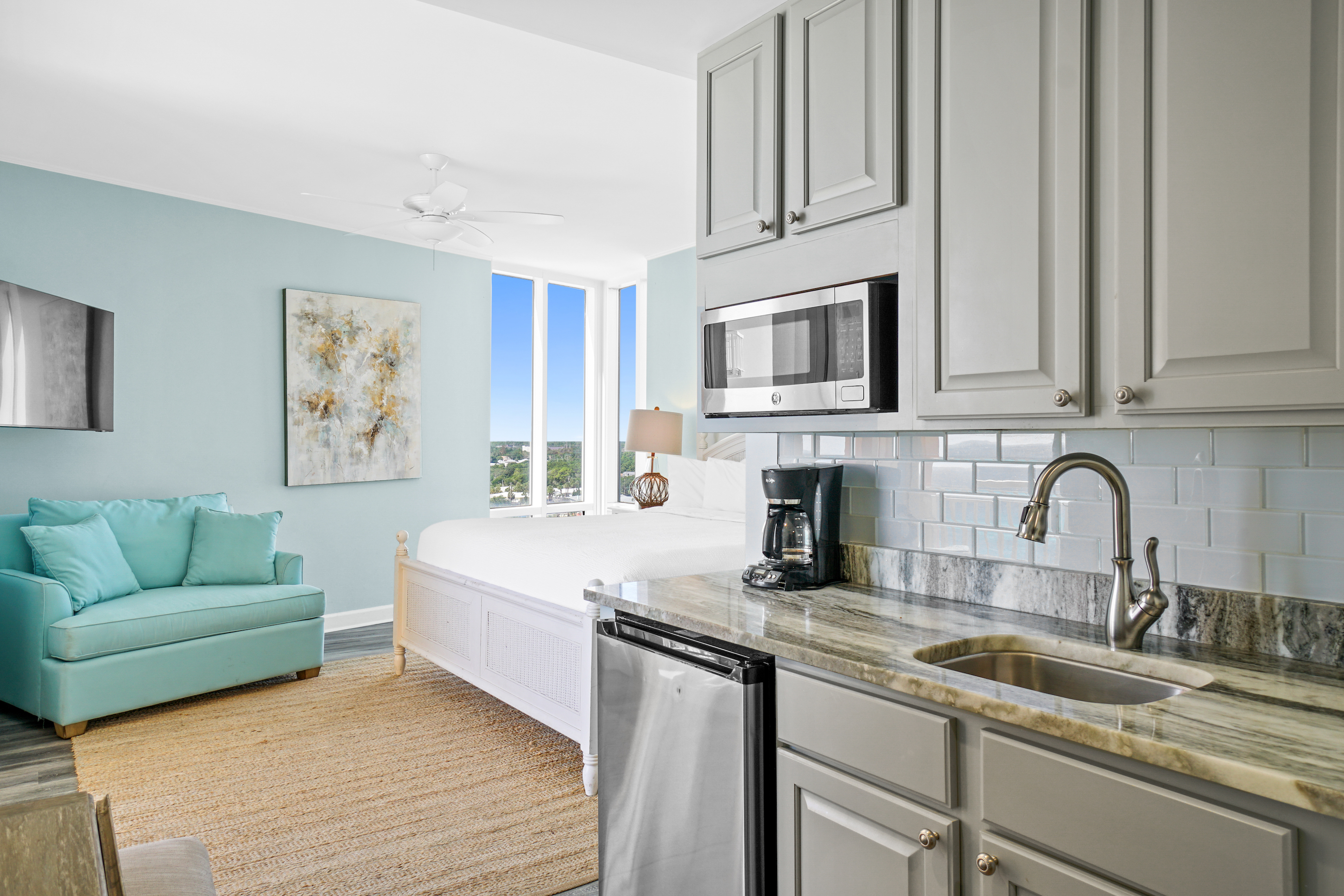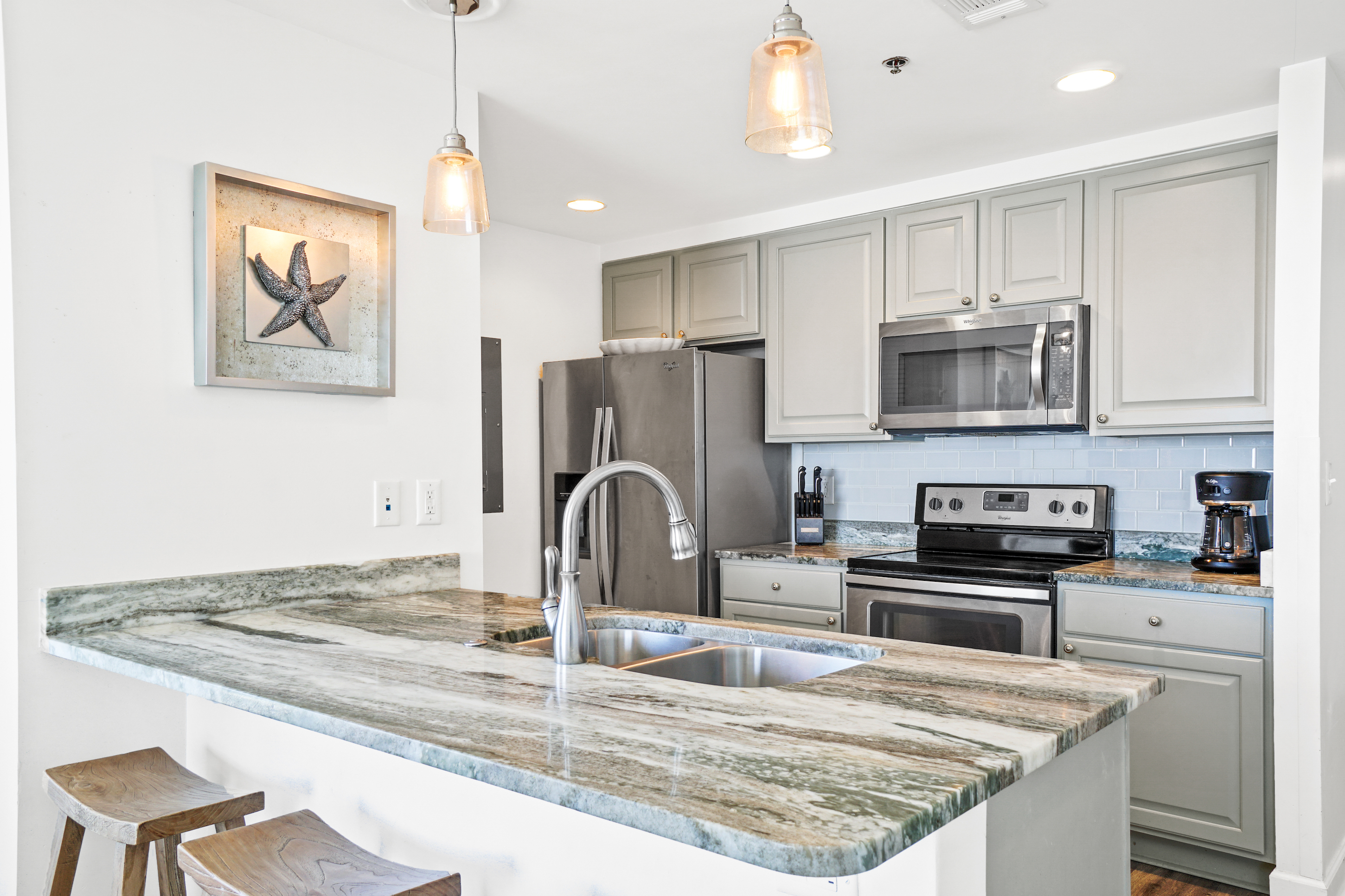 Perfect for larger families or couples traveling together, the condo features a full kitchen and two private suites and a guest bedroom. One of the suites is an efficiency lockout unit, complete with a mini-fridge, sink, microwave, and coffee maker for added convenience.