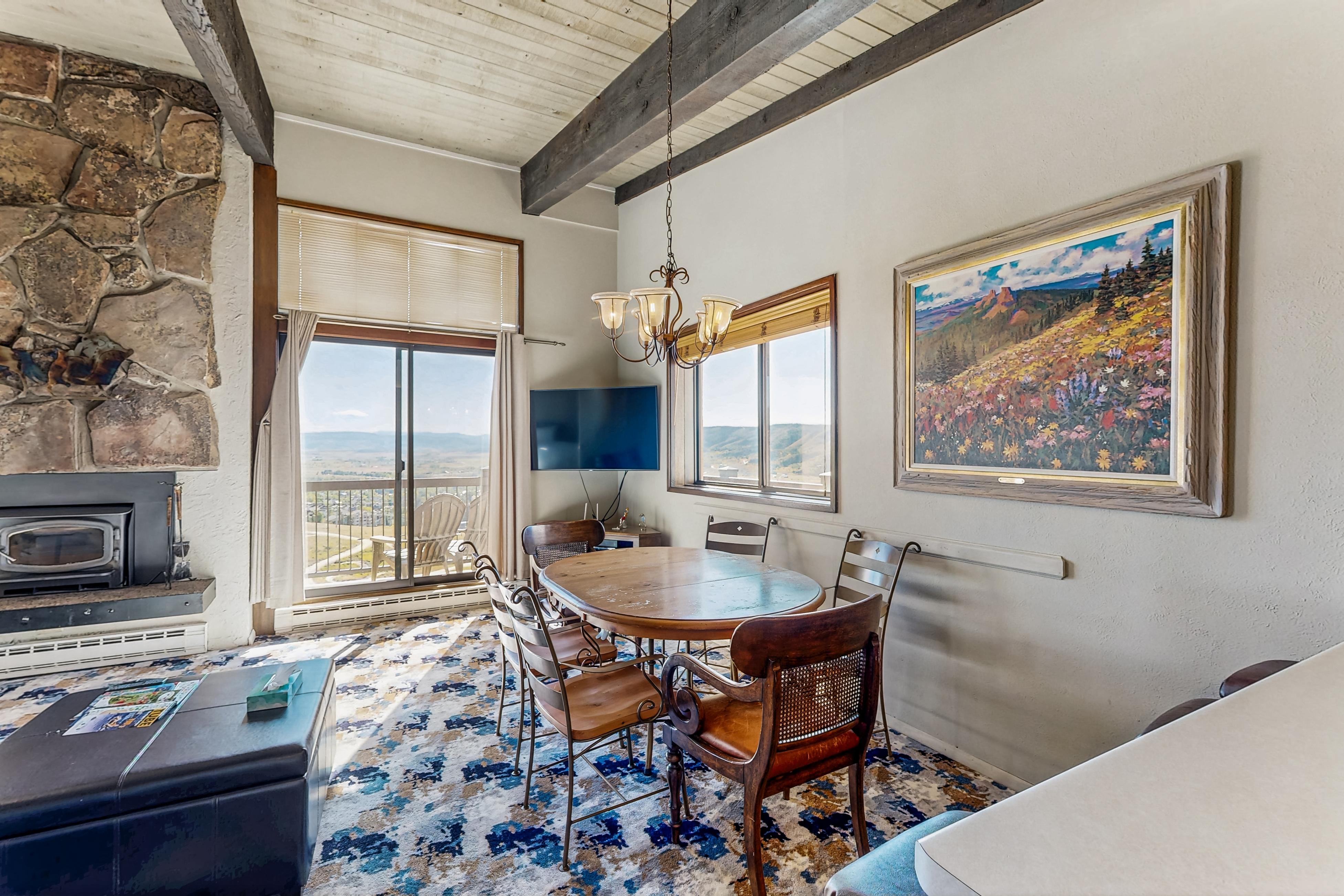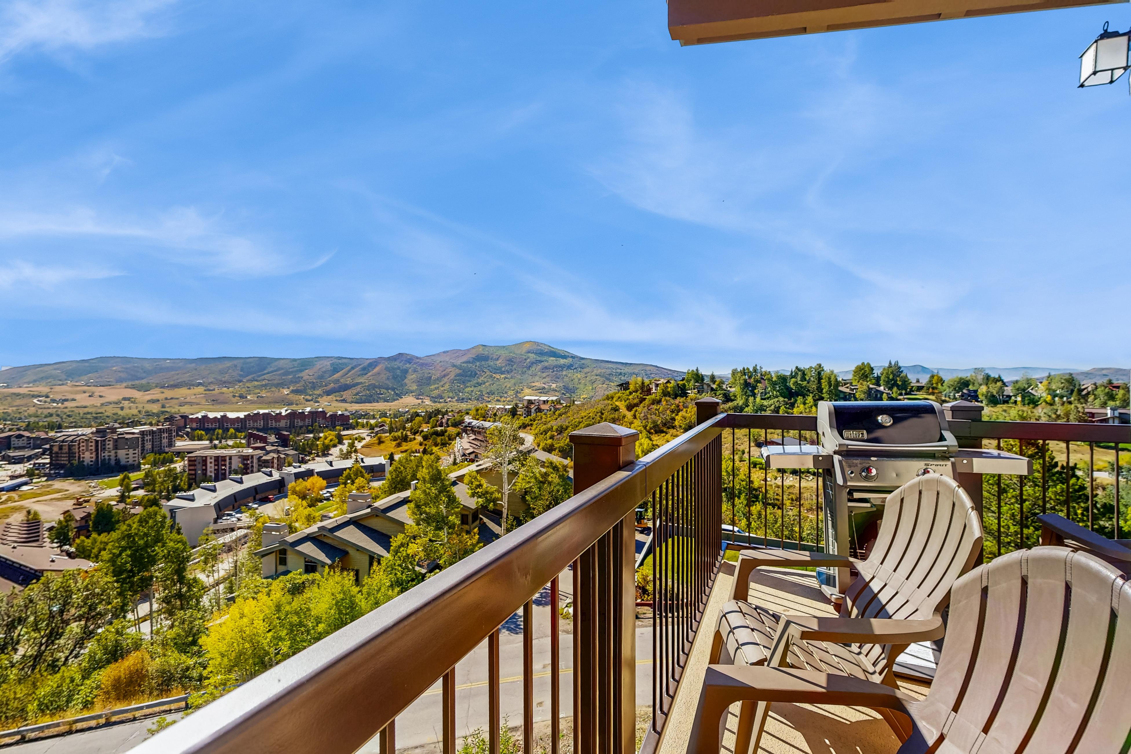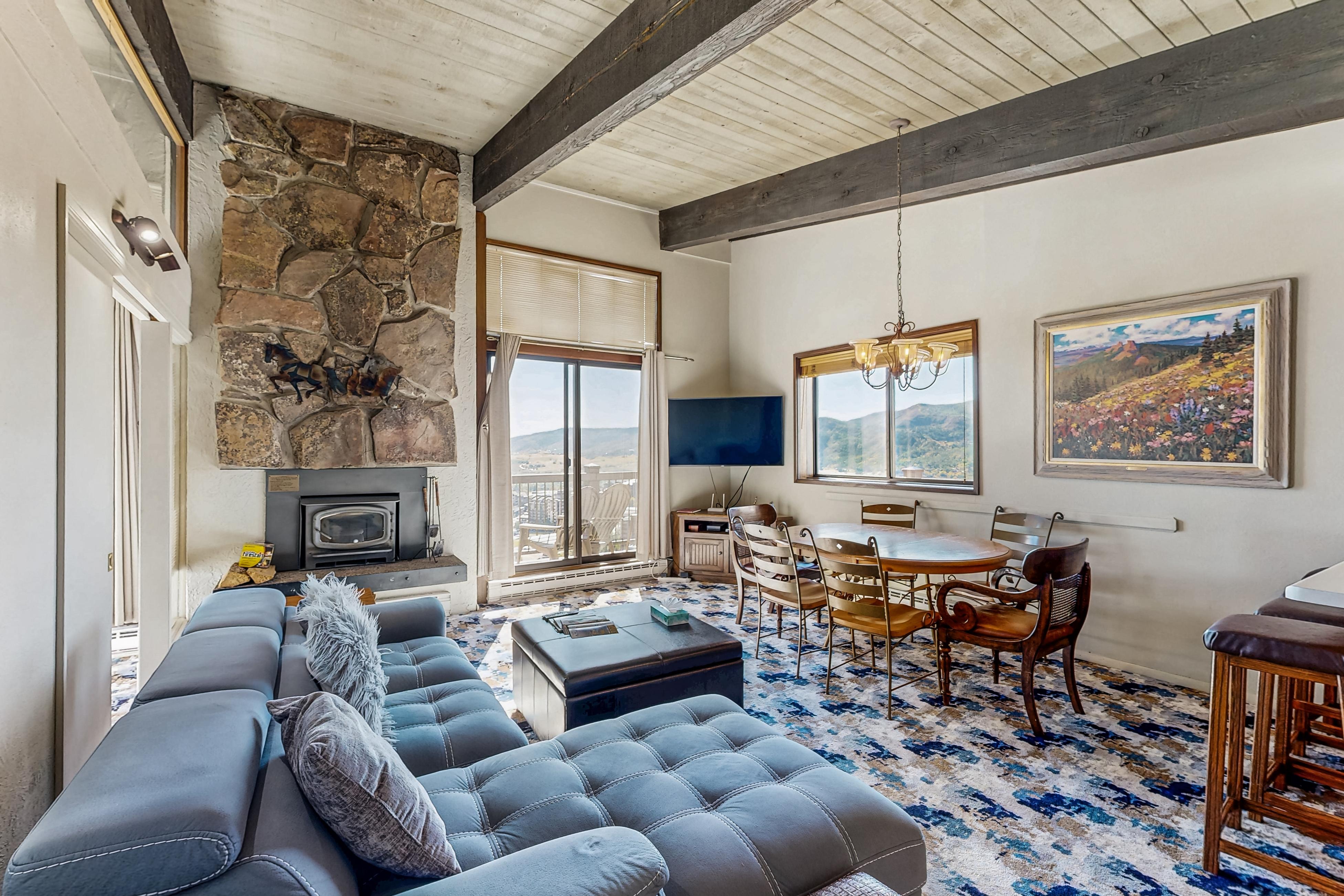 Ski-in/ski-out from this amazing, top-floor corner condo in Storm Meadows Club C. Enjoy unobstructed vast mountain and valley views from the wrap-around deck. Relax in this recently remodeled mountain retreat. Amenities include spacious accommodations with vaulted ceilings, quality furnishings, two 55” QLED Smart TVs, free WiFi, DVD/Blu-Ray player, moss rock wood-burning fireplace, new gas grill, ski storage locker, wrap-around deck with incredible views of the Steamboat Ski Resort and entire valley floor, elevator, and laundry room on site. Unwind in the hot tub or outdoor heated pool while taking in a magical valley view. Private shuttle access, a large assortment of restaurants, and après-ski meeting places are close by. You have the best ingredients for a perfect vacation in Steamboat Springs Colorado right here.