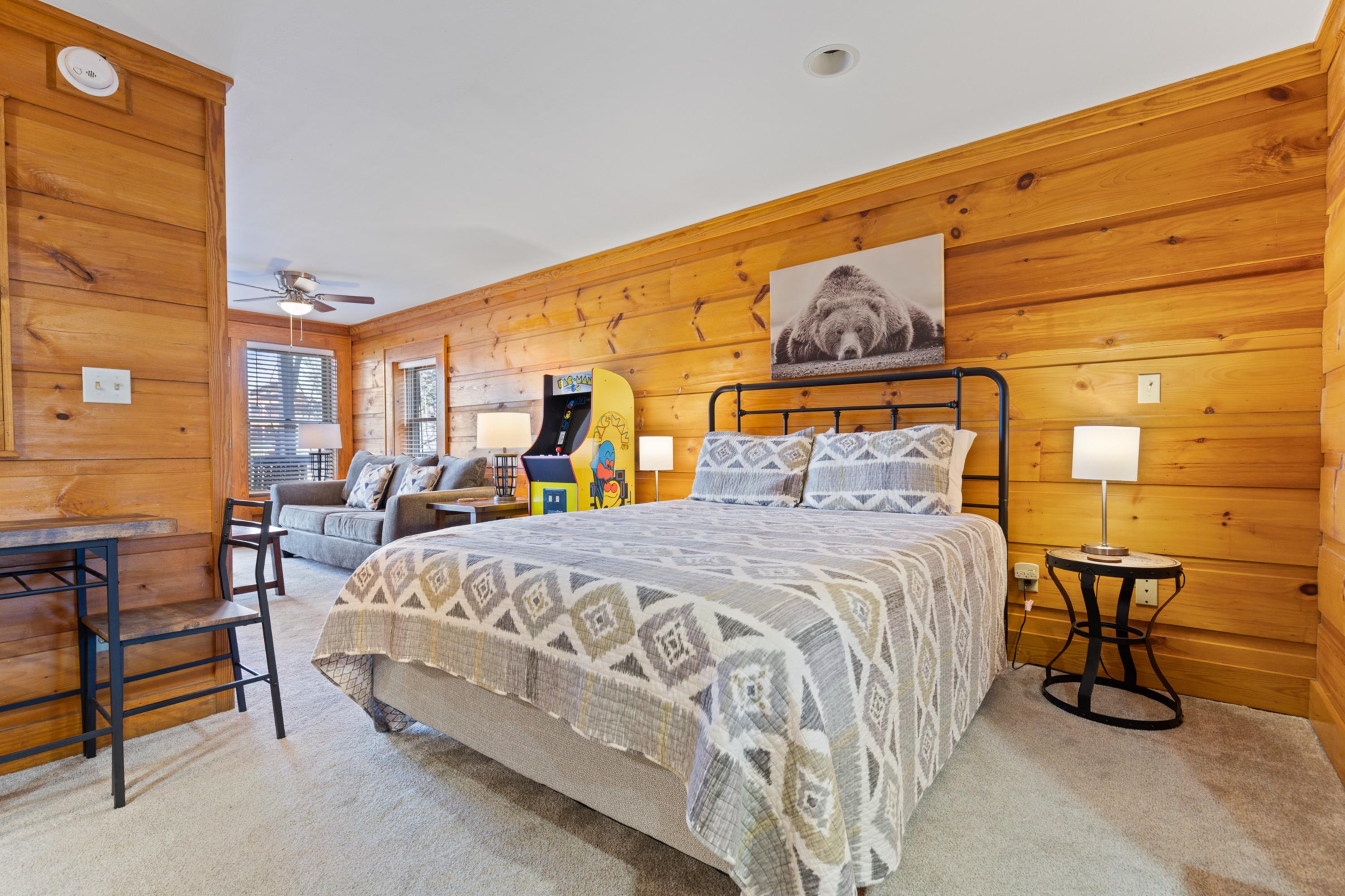 For those seeking fun indoors, challenge your friends and family to an exciting round of arcade games. The outdoor grill invites you to cook up a delicious meal while enjoying the fresh mountain air. When you're ready to relax even more, the resort's sauna and pool are just steps away, offering the perfect place to refresh and recharge.